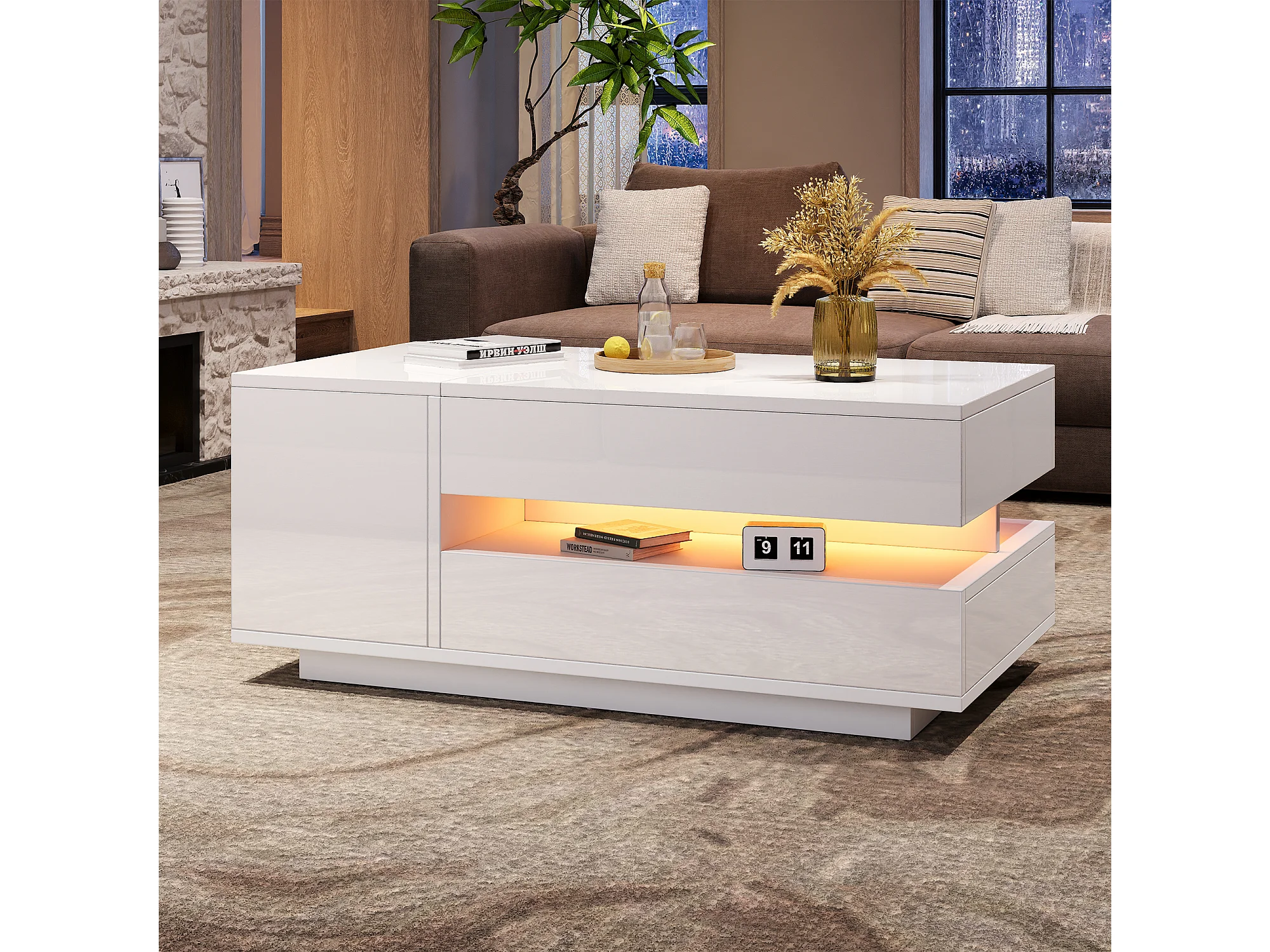 Opklapbare salontafel - 95 x 50 x 34,5 cm - met 1 lade + 1 deur + LED's - spaanplaat - wit