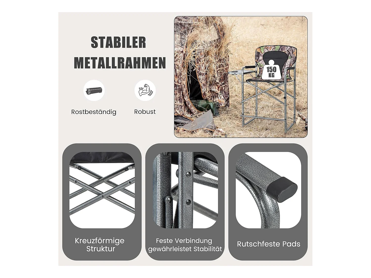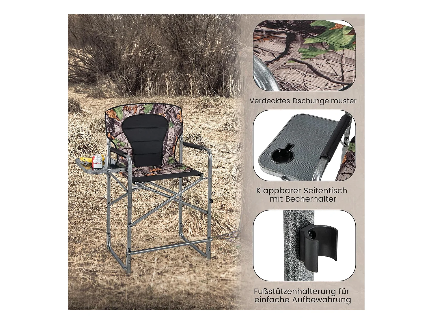 Opvouwbare campingstoel, hoge klapstoel met zijtafel, afneembare voetensteun, regisseursstoel, visstoel voor jacht, vissen, kamperen, draagvermogen 150 kg
