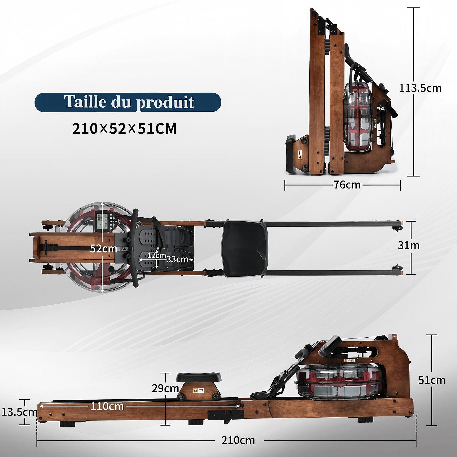 Opvouwbare houten roeitrainer, met APP, waterbestendig, dubbele glijbaan, stil en soepel, max. belasting 150 kg, 210x52x51cm
