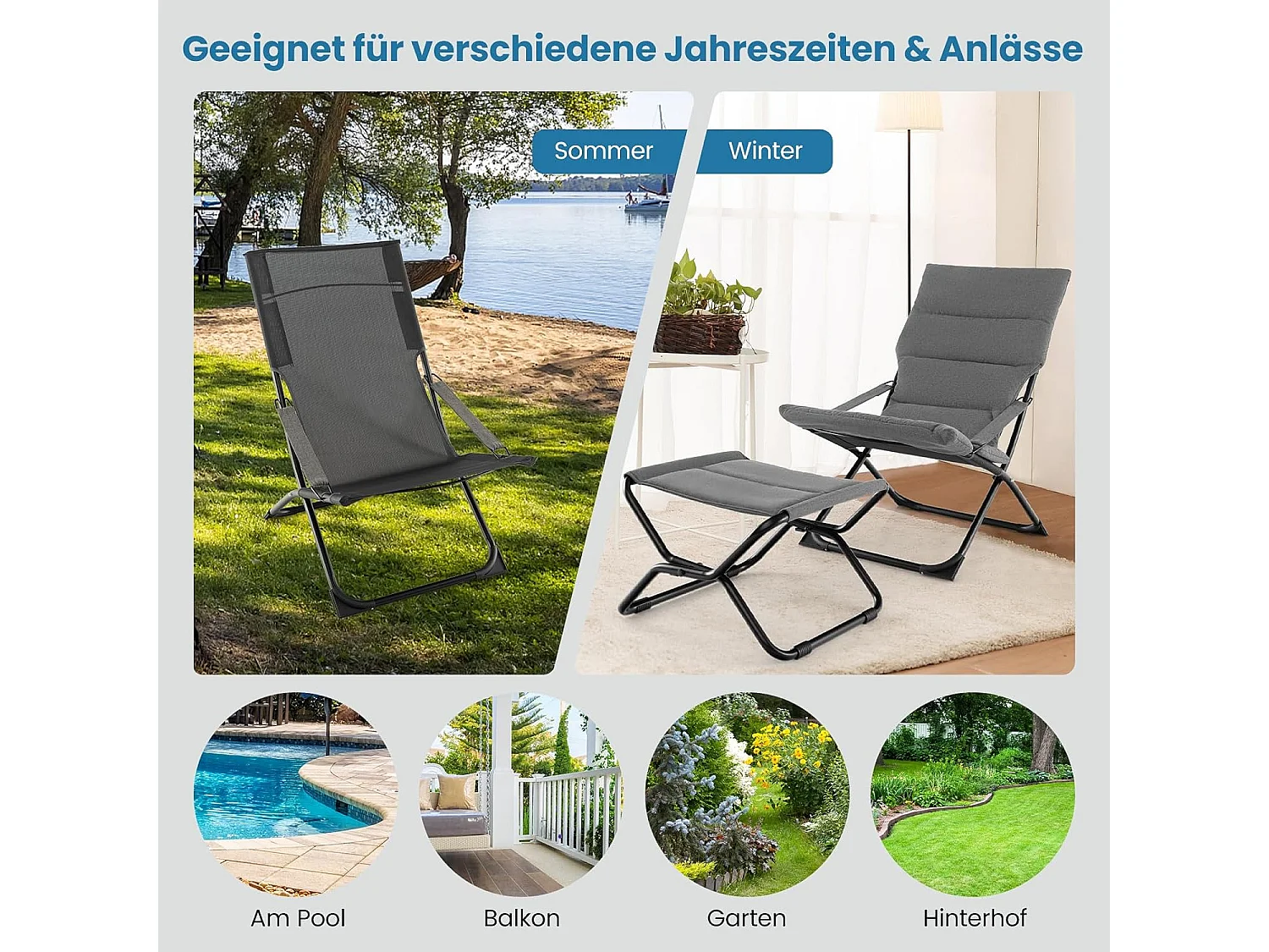 Opvouwbare ligstoel met voetenbank, ligbed met afneembaar kussen en hoge rugleuning, gevoerde ligstoel voor tuin, terras, achtertuin, grijs ZB33629