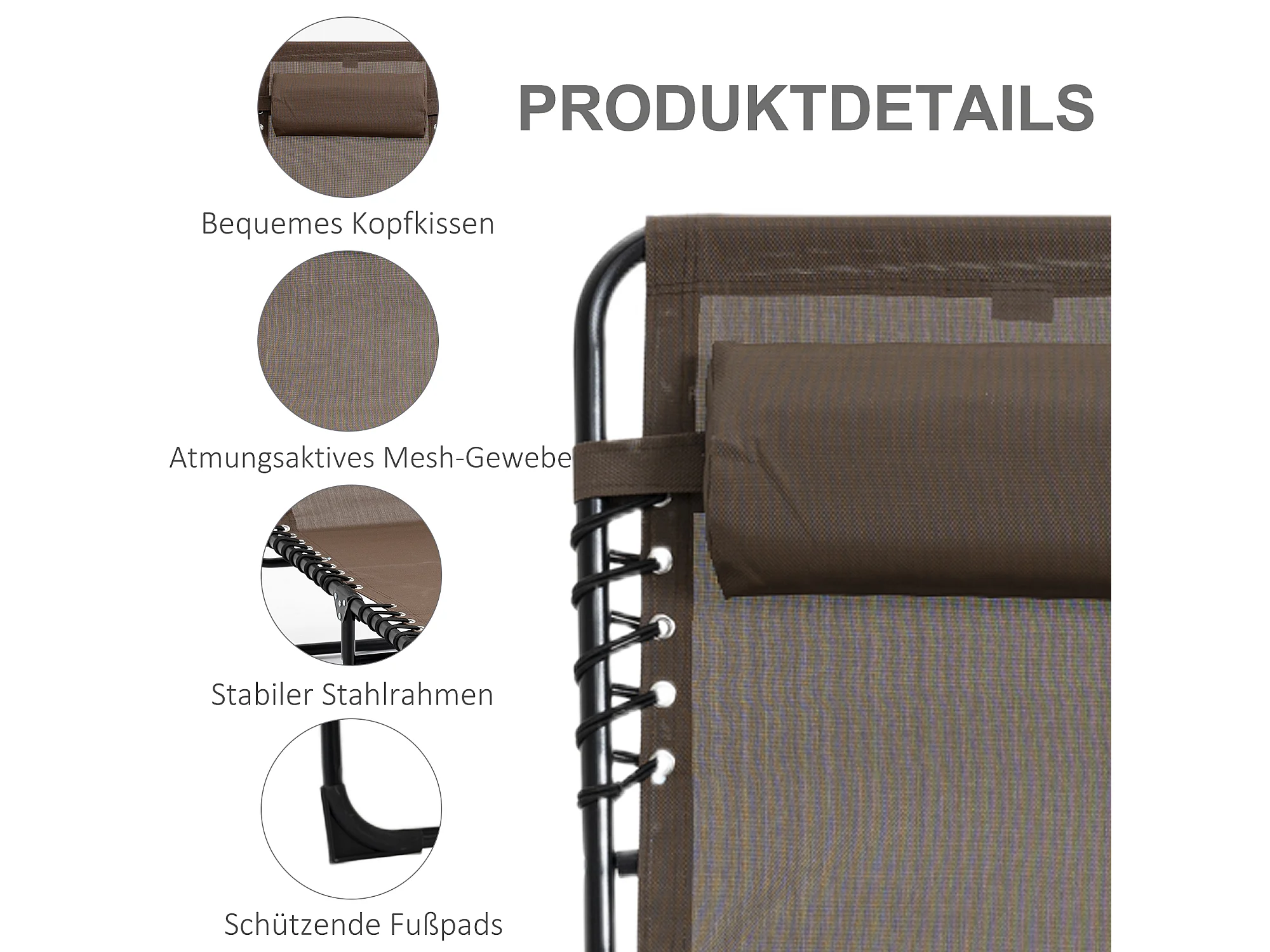 Opvouwbare loungestoel met kussen, metalen frame, Textilene stof, bruin (137x63,5x100,5cm)