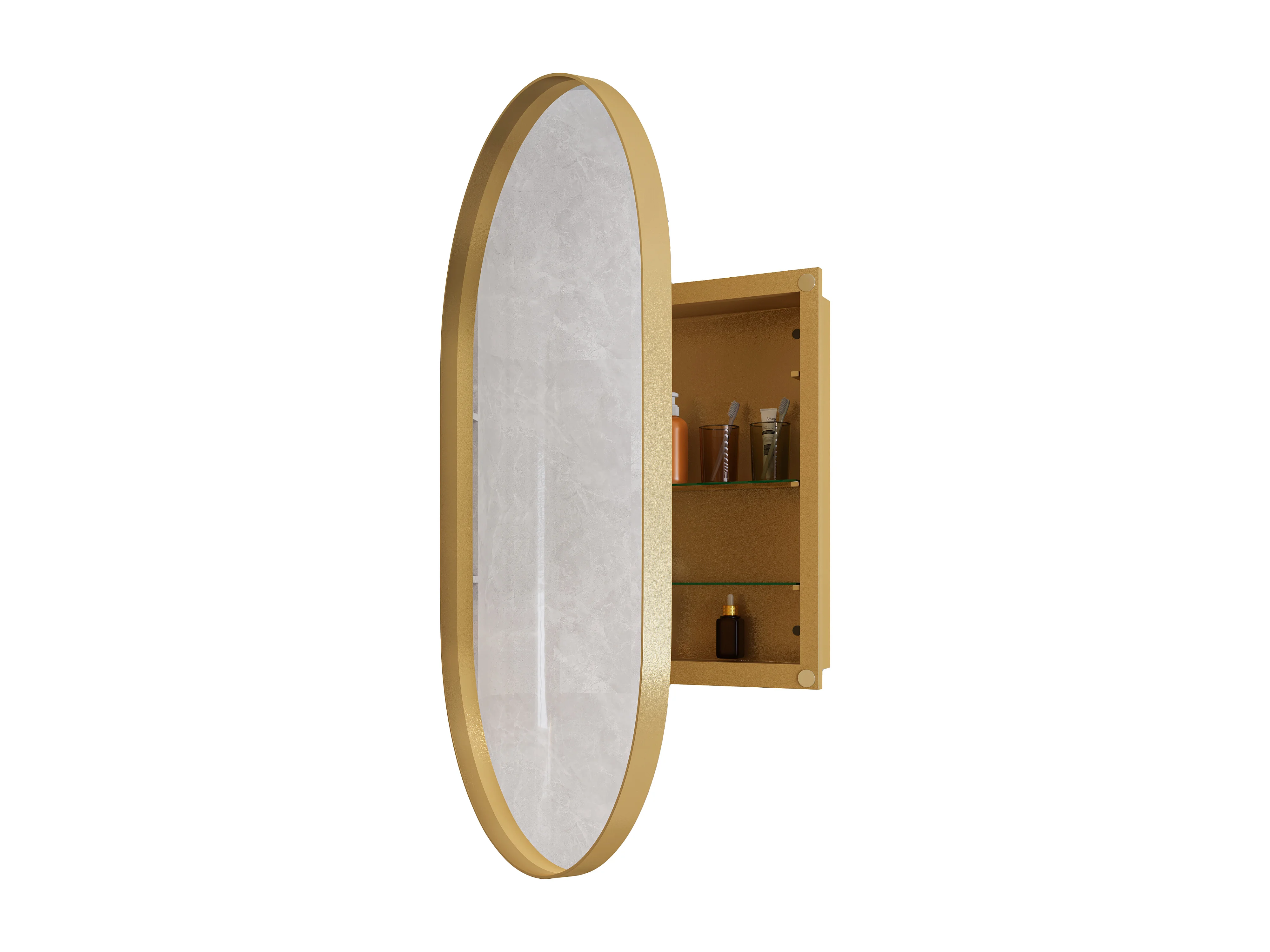 Ovale spiegelkast, wandkast met metalen frame, verstelbare planken, voor badkamer, woonkamer en slaapkamer, goud (91x61x12 cm)