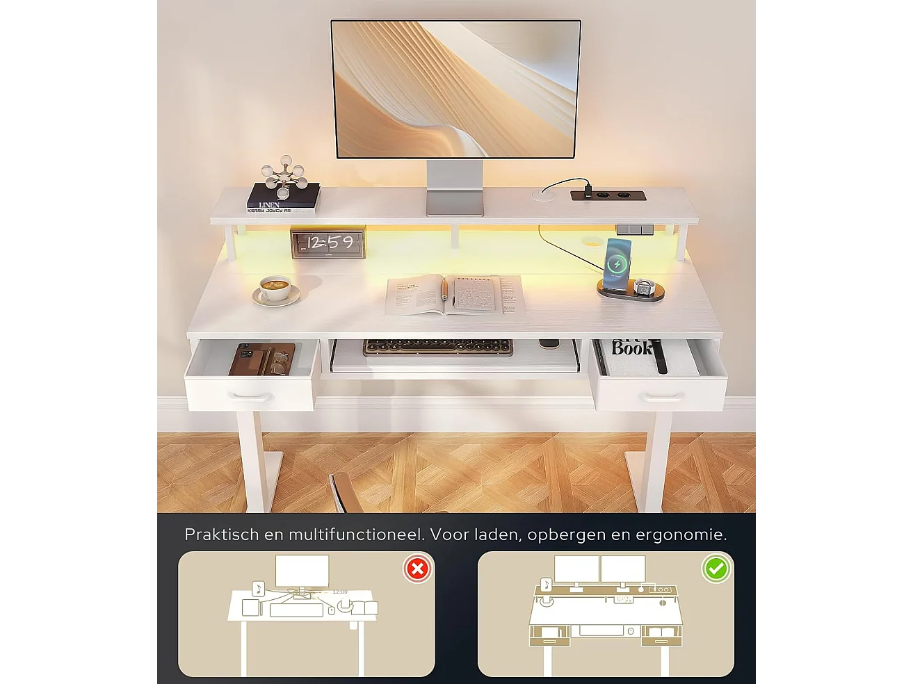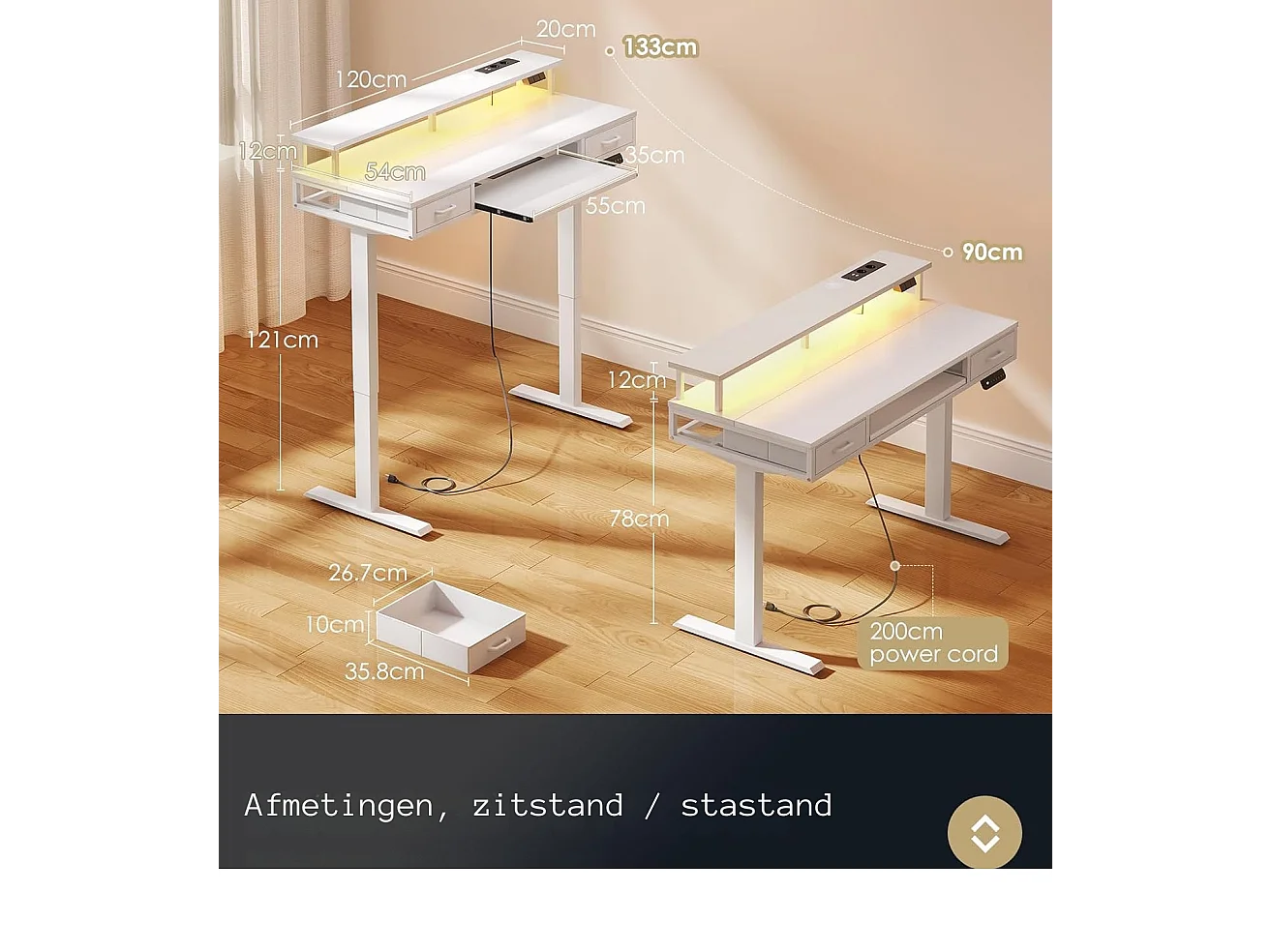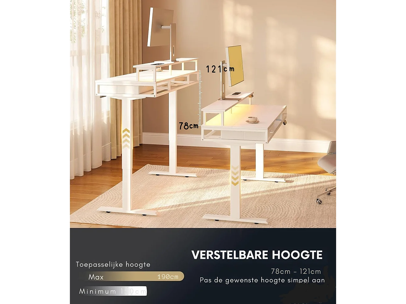 Parya Home Elektrisch Verstelbaar Bureau – 2 Lades, Toetsenbordlade, verlichting & 3 Geheugenstanden