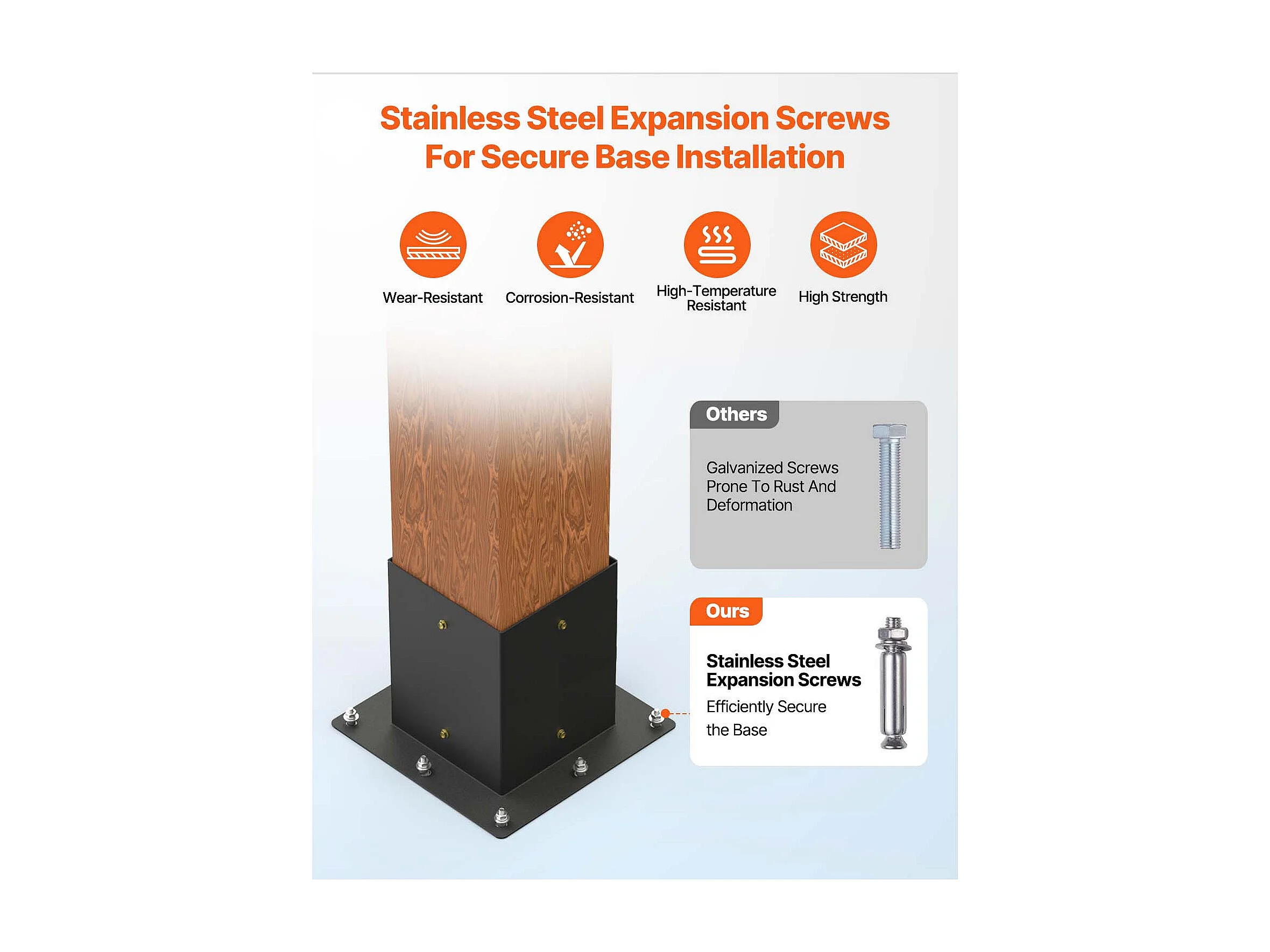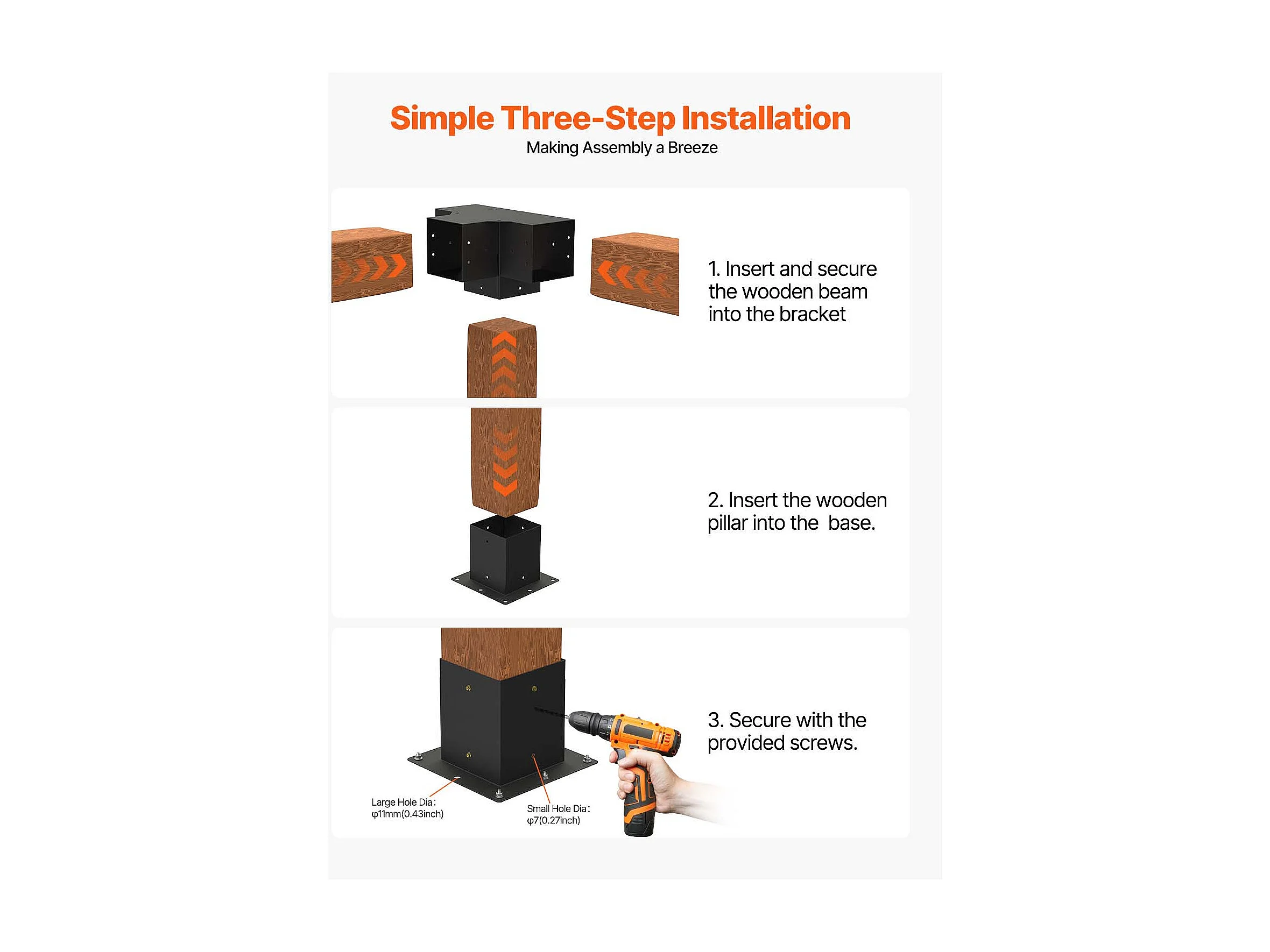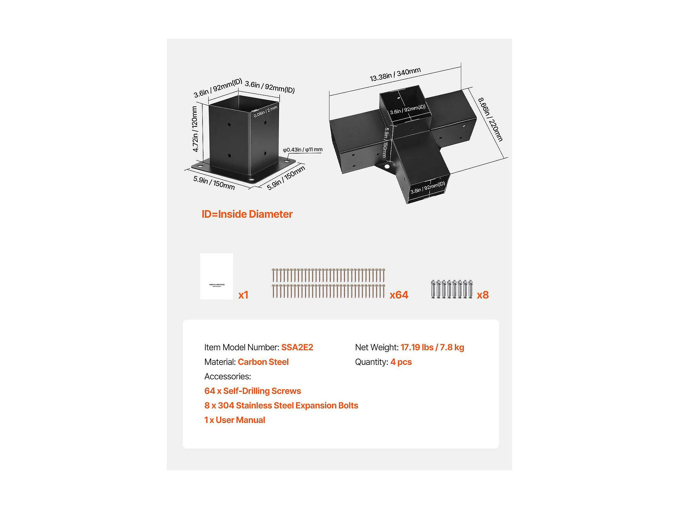 Pergola Steunset SucceBuy, Set van 4, Houten Paalsteun 9.2x9.2 cm, 2 4-Weg Hoeksteunen, 2 Paalvoeten, Koolstofstaal