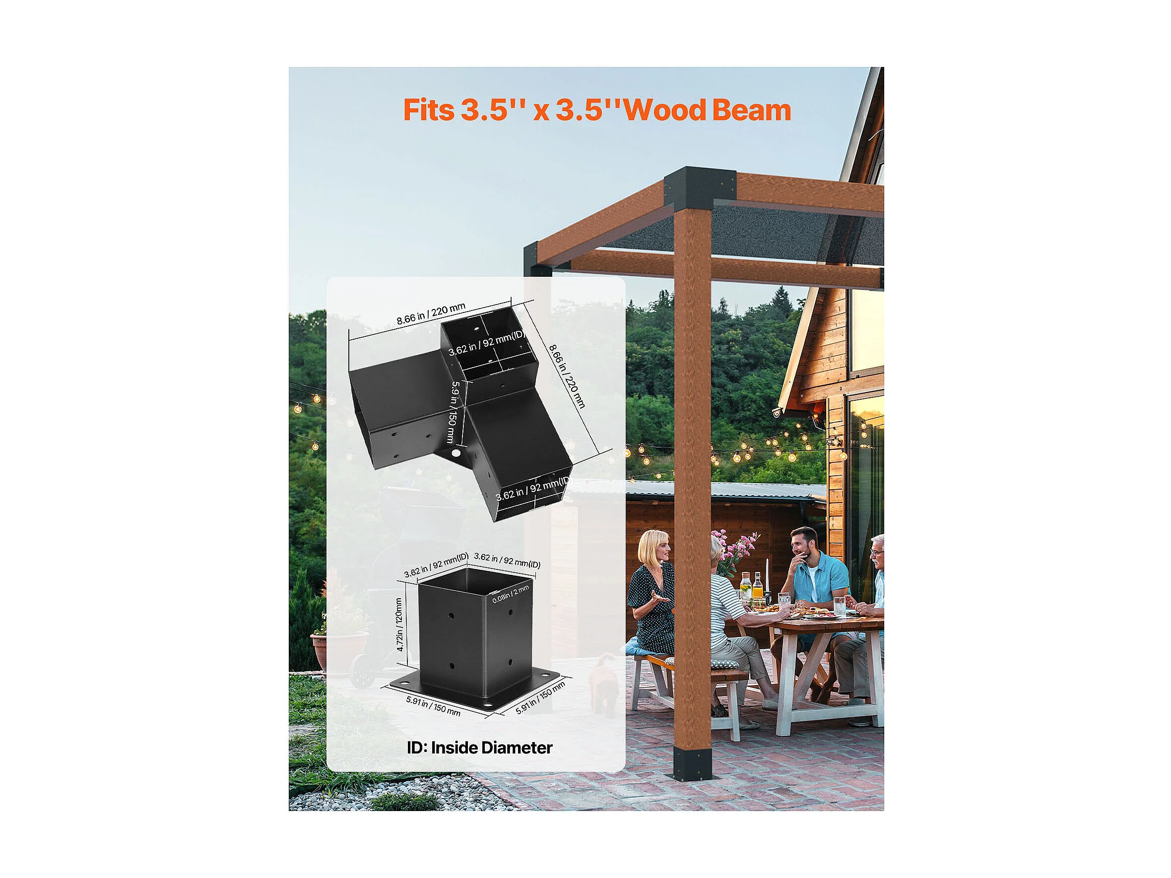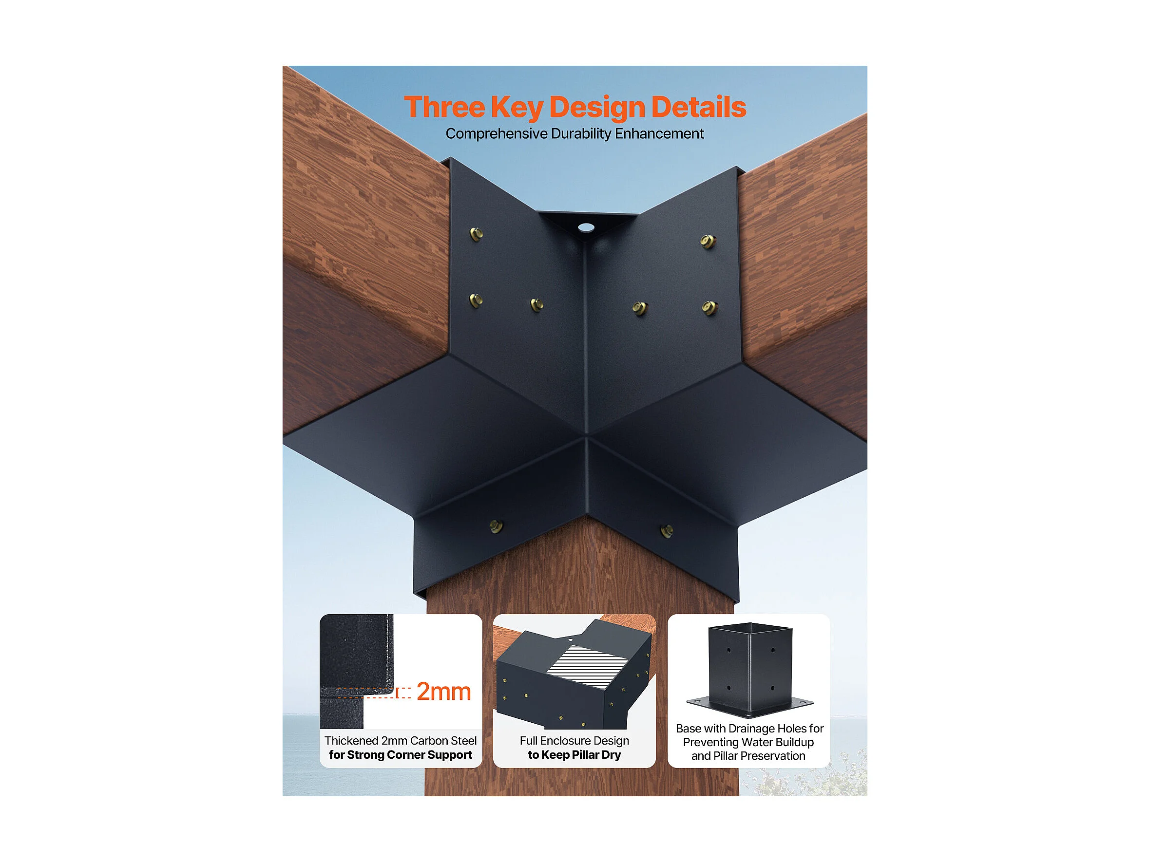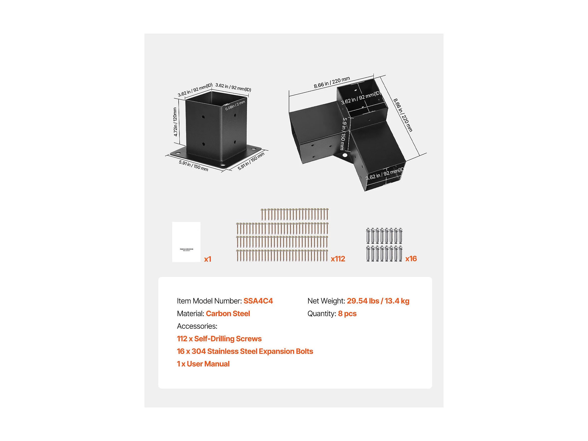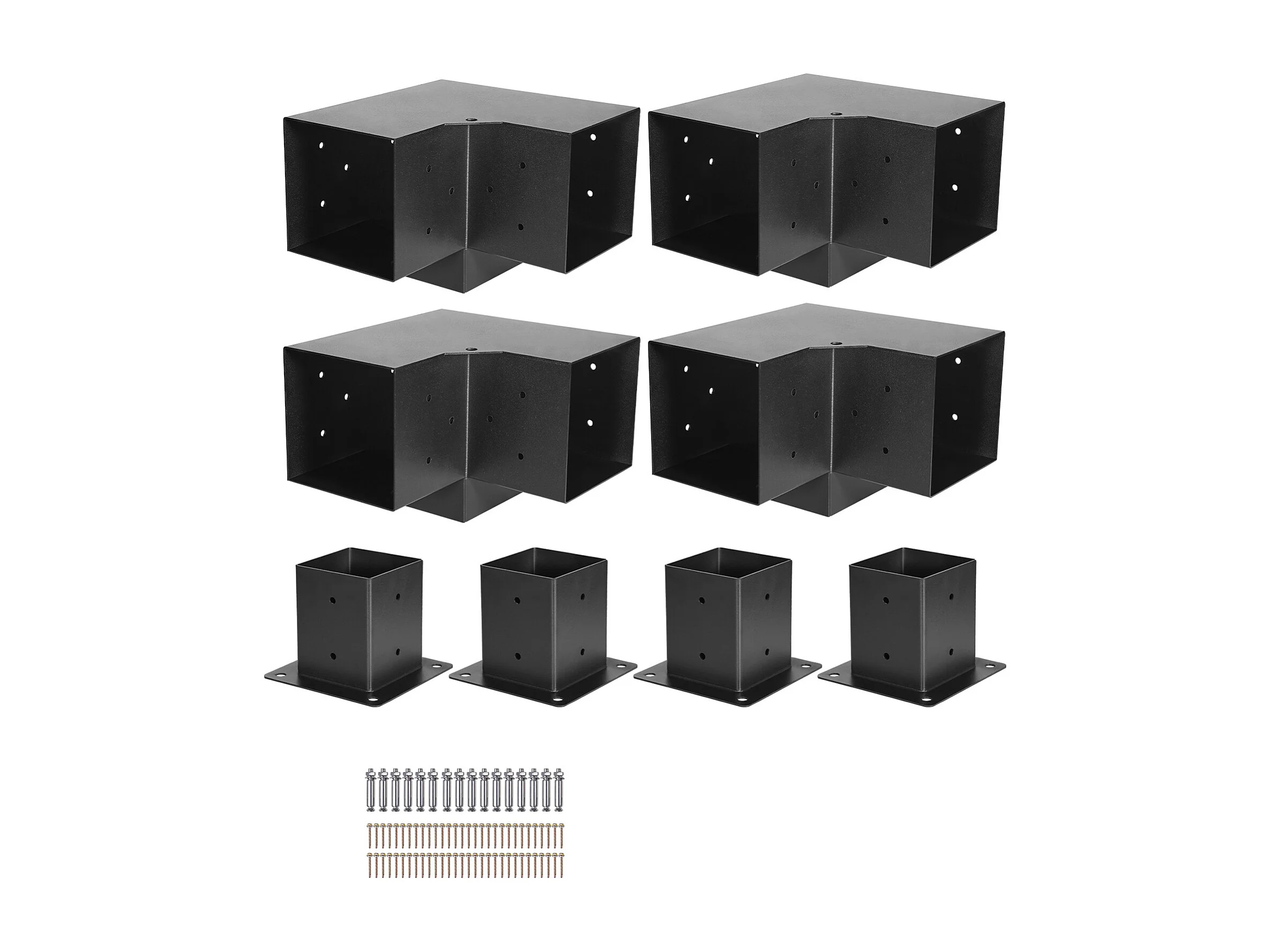Pergola Steunset SucceBuy, Set van 8, Houten Paalsteun 9.2x9.2 cm, 4 3-Weg Hoeksteunen, 4 Paalvoeten, Koolstofstaal