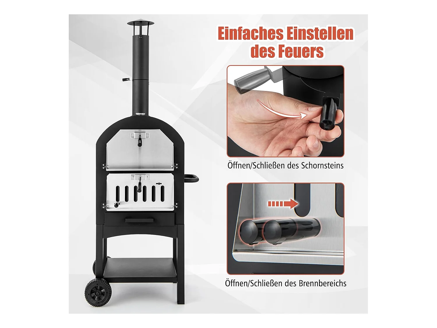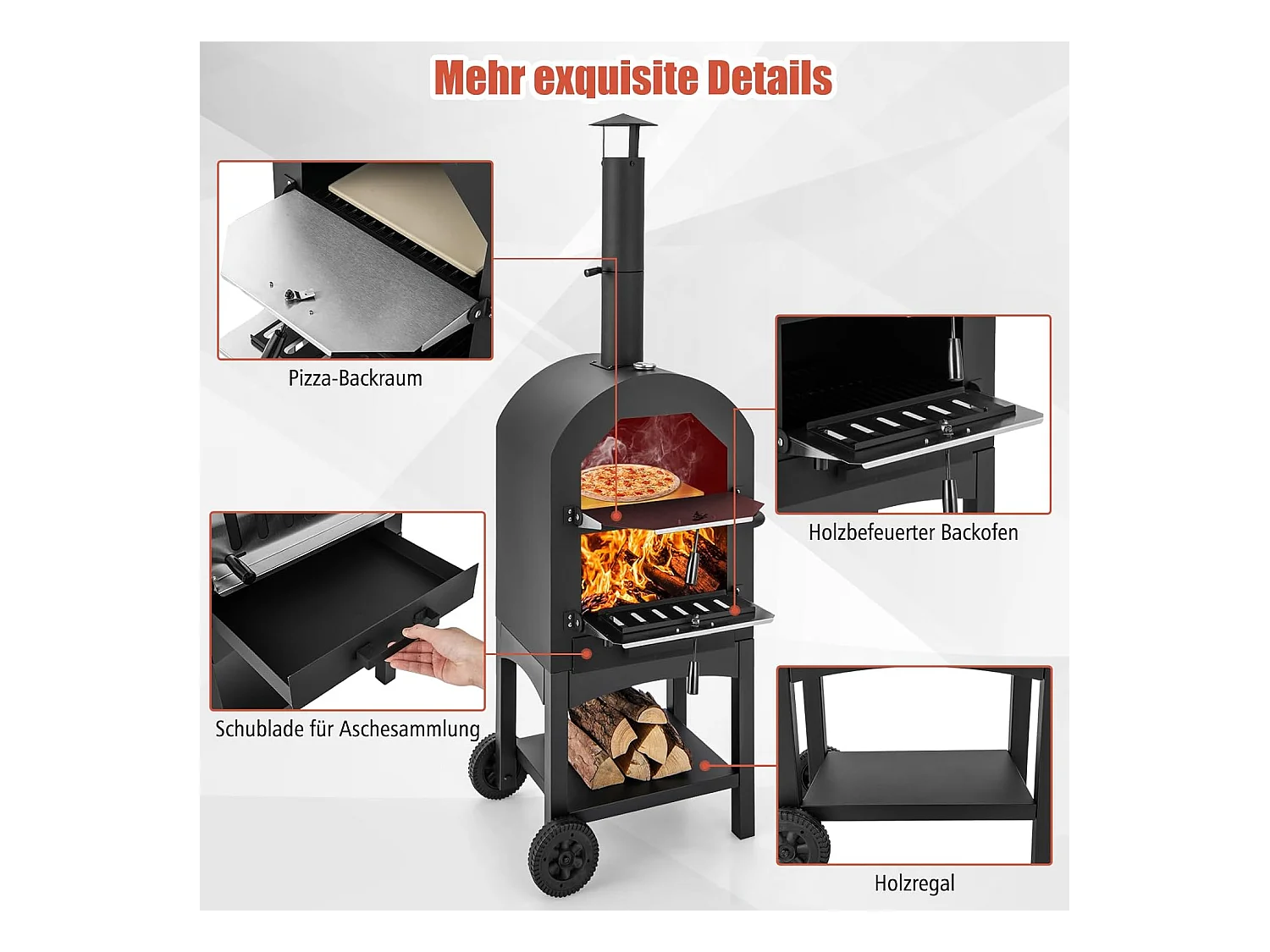 Pizzaoven voor buiten, houtgestookte pizzaoven met ingebouwde thermometer, praktische handgreep, wielen, waterdichte afdekking en asopvanglade