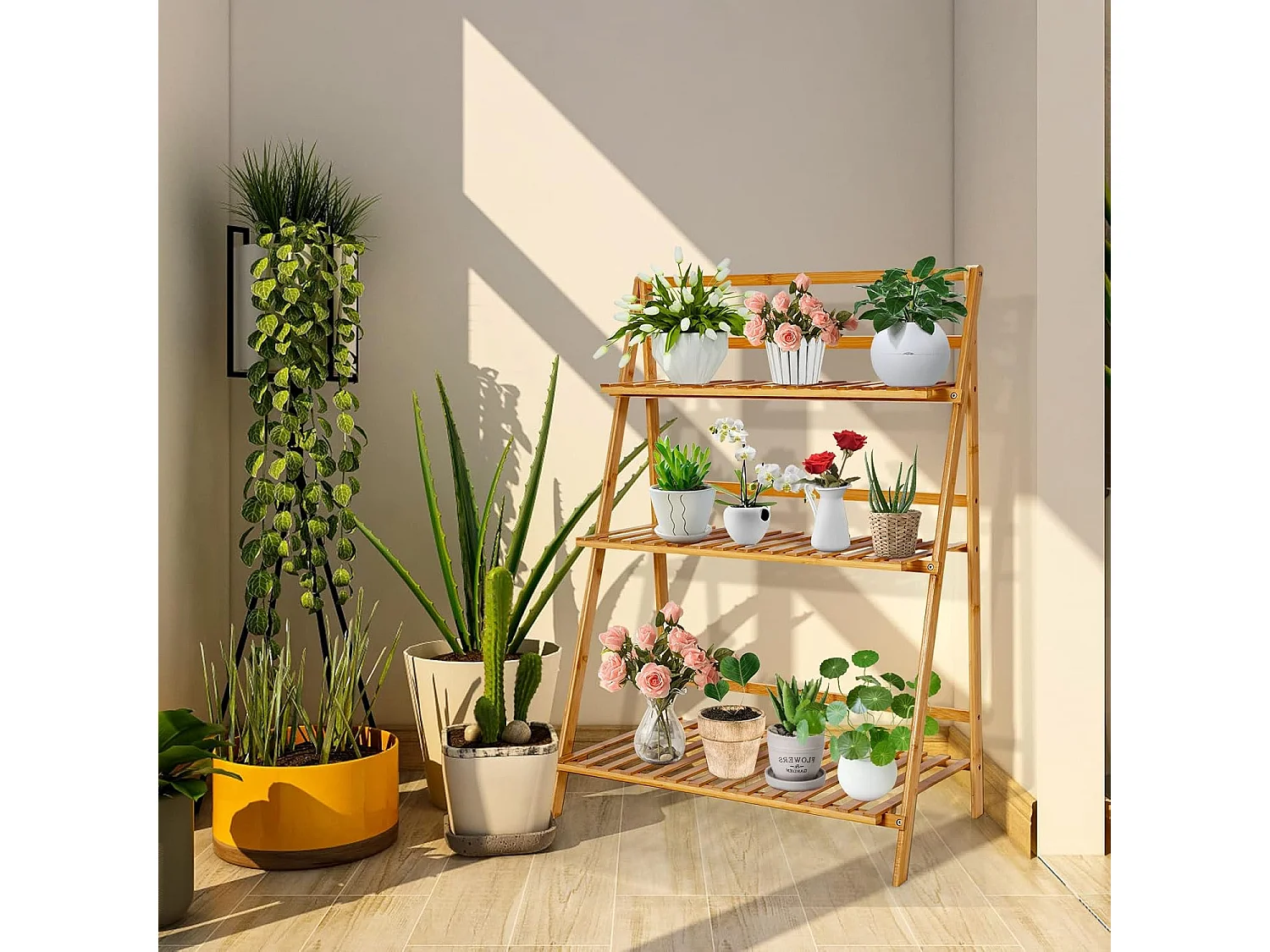 Plantenrek, bamboe, staand rek met 9 niveaus, ruimteverdeler, bloemenrek met hangframe, traprek, plantenstandaard, bamboerek voor badkamer, woonkamer, tuin