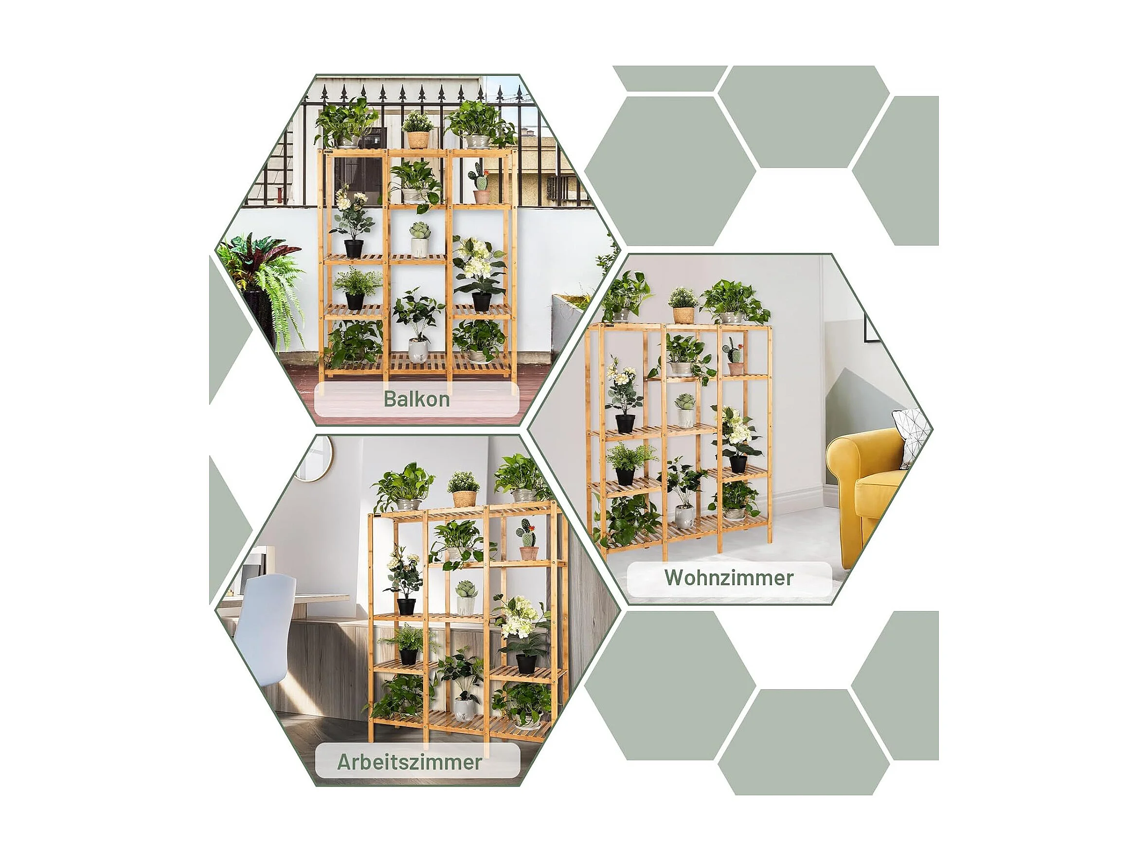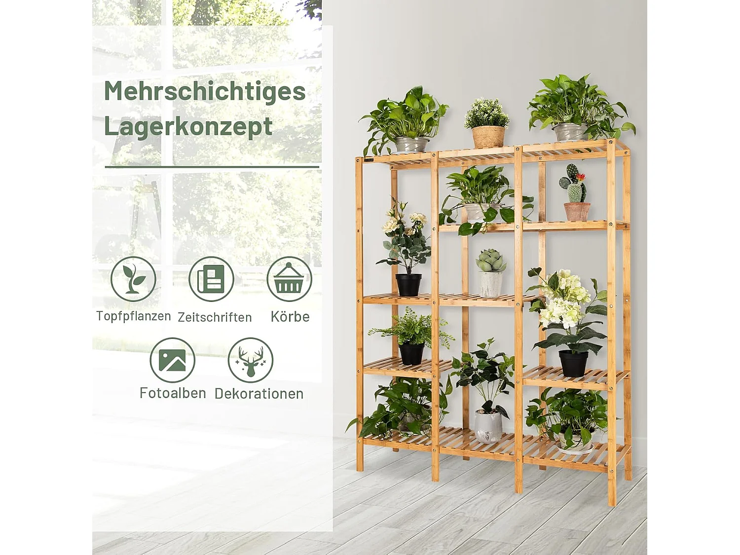 Plantenrek, bamboe, staand rek met 9 niveaus, ruimteverdeler, bloemenrek met hangframe, traprek, plantenstandaard, bamboerek voor badkamer, woonkamer, tuin