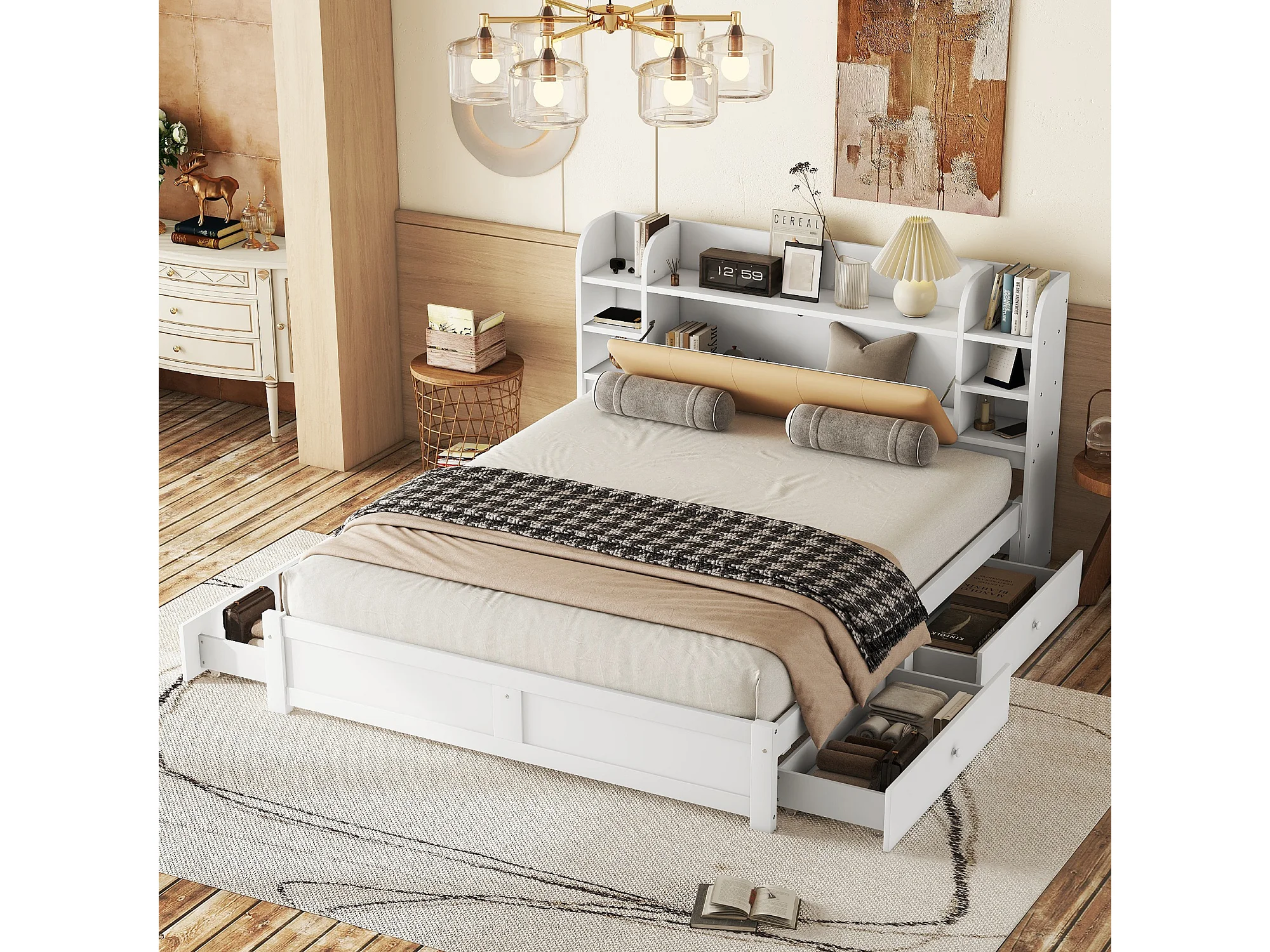 Plat bed 180x200cm, gedeeltelijk inklapbaar hoofdeinde, vier lades, diverse opbergvakken, wit, matras niet inbegrepen