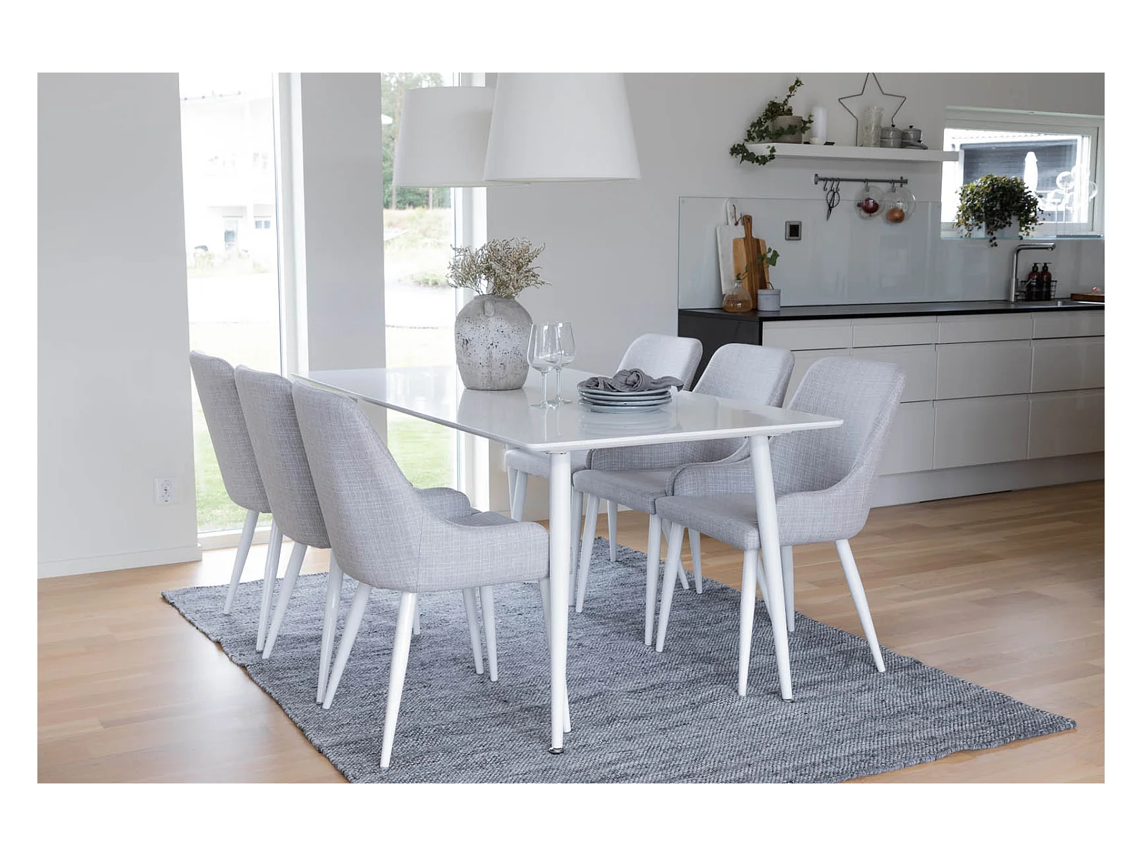 Polar180X90WHWH eethoek eetkamertafel wit en 6 Plaza eetkamerstal grijs, wit.