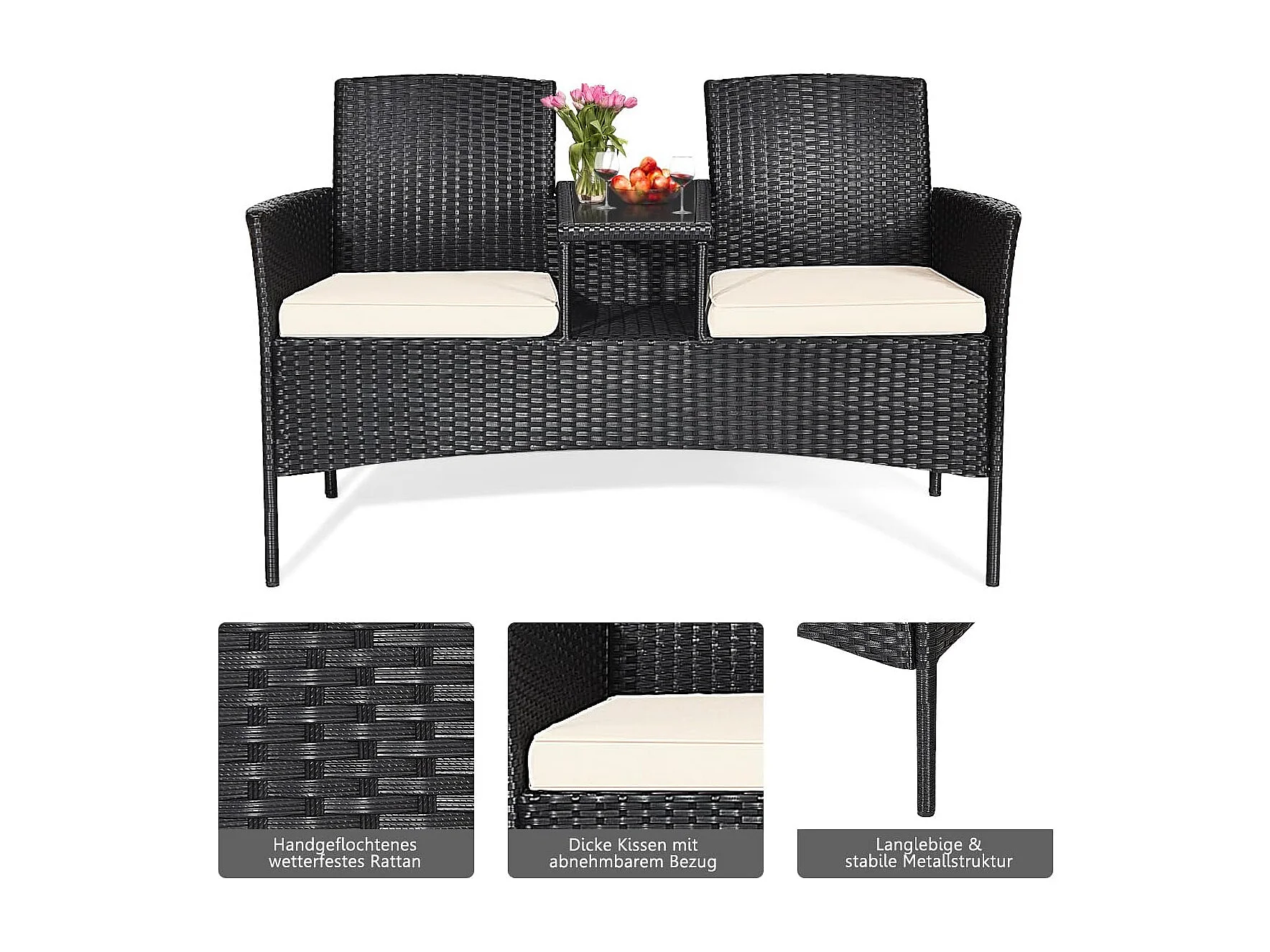 Polyrotan tuinbank, 2-zits tuinmeubelset met tafel en kussens, 138 x 61 x 85 cm, rotan zitbank, weerbestendig, balkonmeubels voor tuin, balkon (wit)TI85456