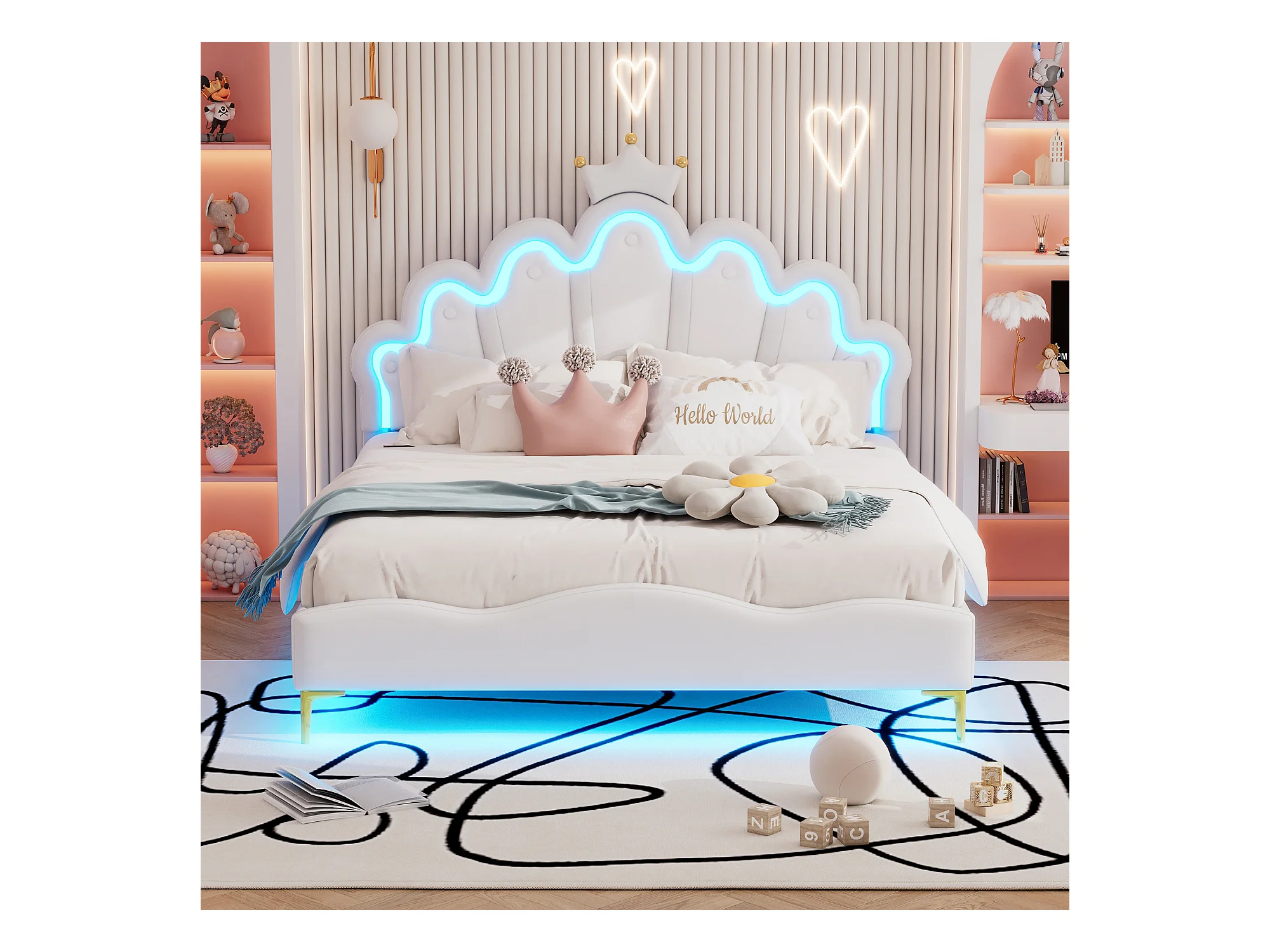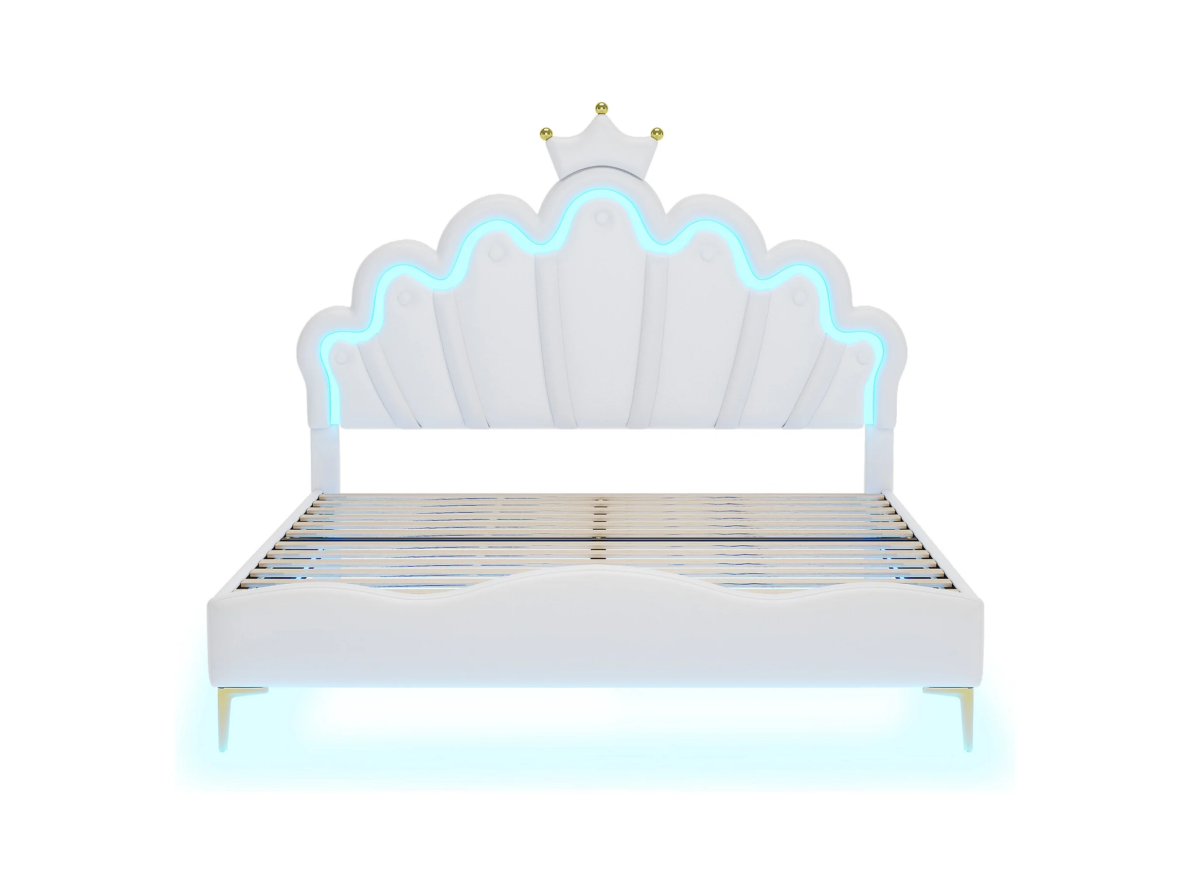 Prinsessenbed 140x200 cm met verstelbare LED-verlichting, kroonvormig hoofdeinde, PU, wit (203x140x129 cm)