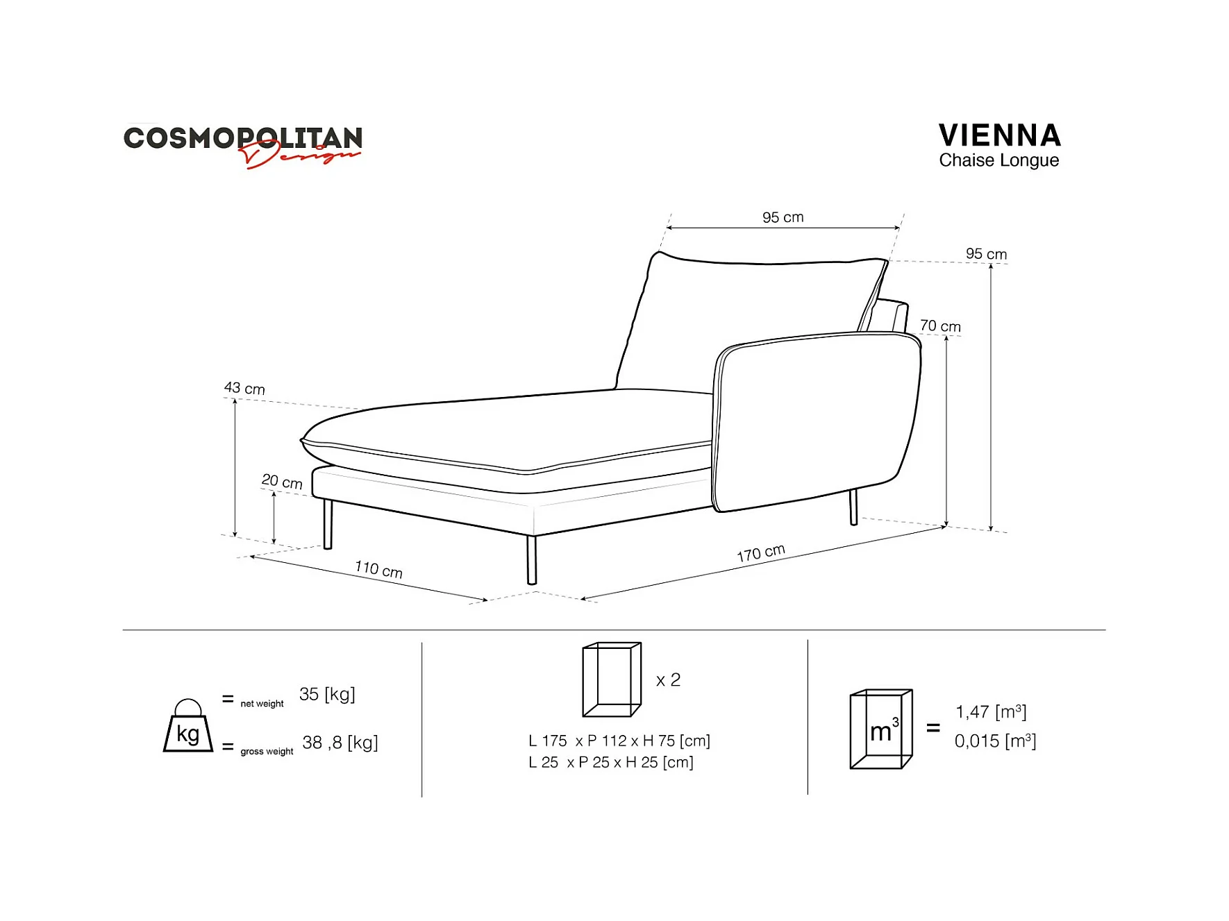 Cosmopolitan Design - Rechter chaise longue "Vienna" Flueel, Donkerblauw - 170x110x95cm