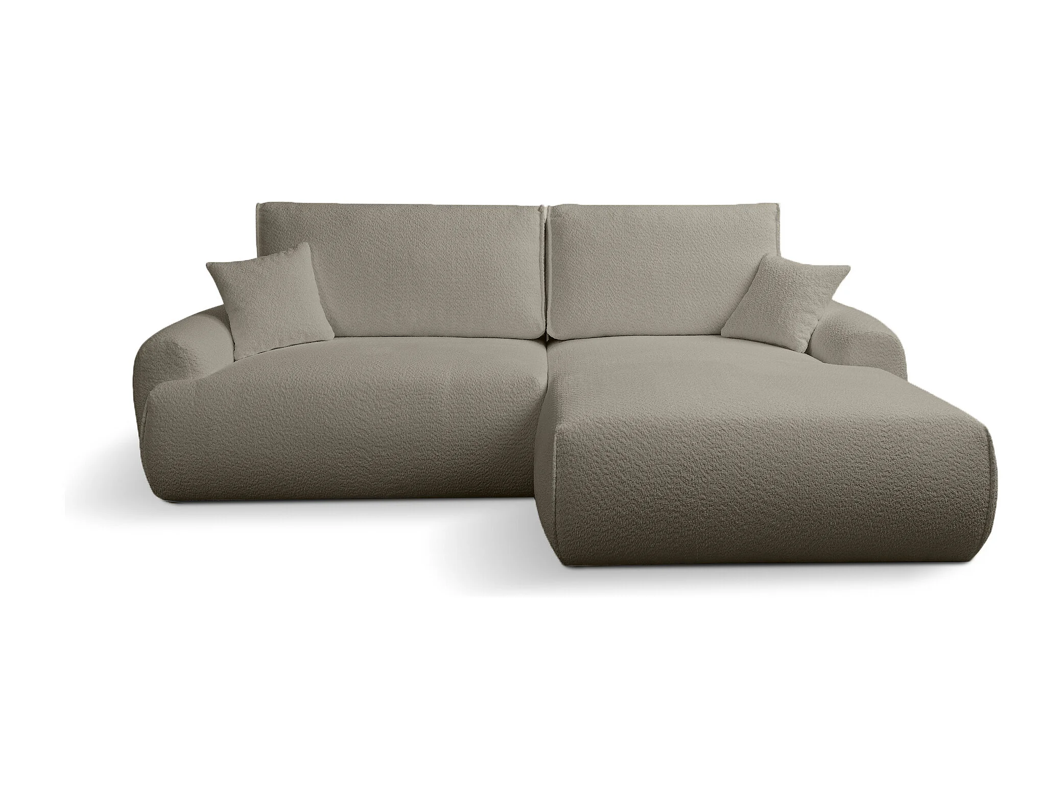 Rechter hoekslaapbank Noboo met slaapfunctie en opbergbox in lichtgrijze bouclé – rechtstreeks van de fabrikant, levering en montage gratis!