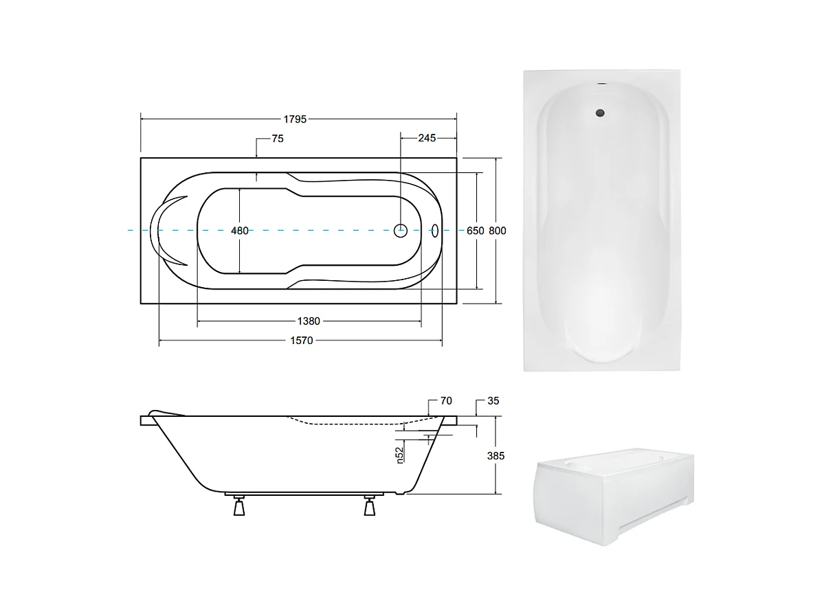 Rechthoekige badkuip BONA 180x80 met badframe | Afvoer & poten GRATIS!