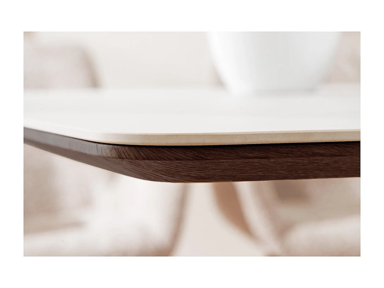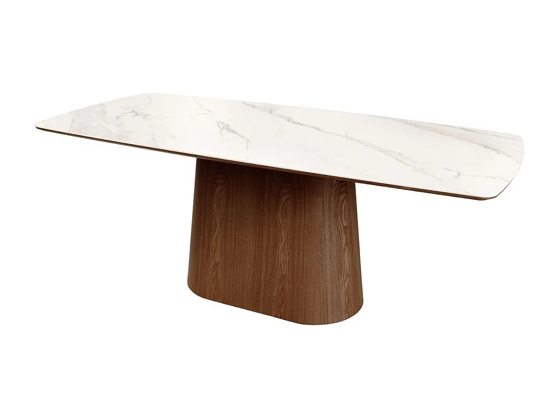 Rechthoekige tafel LUMEA – 200 cm – Tafelblad van keramiek met wit marmer effect en donker houten poot – Hedendaagse stijl