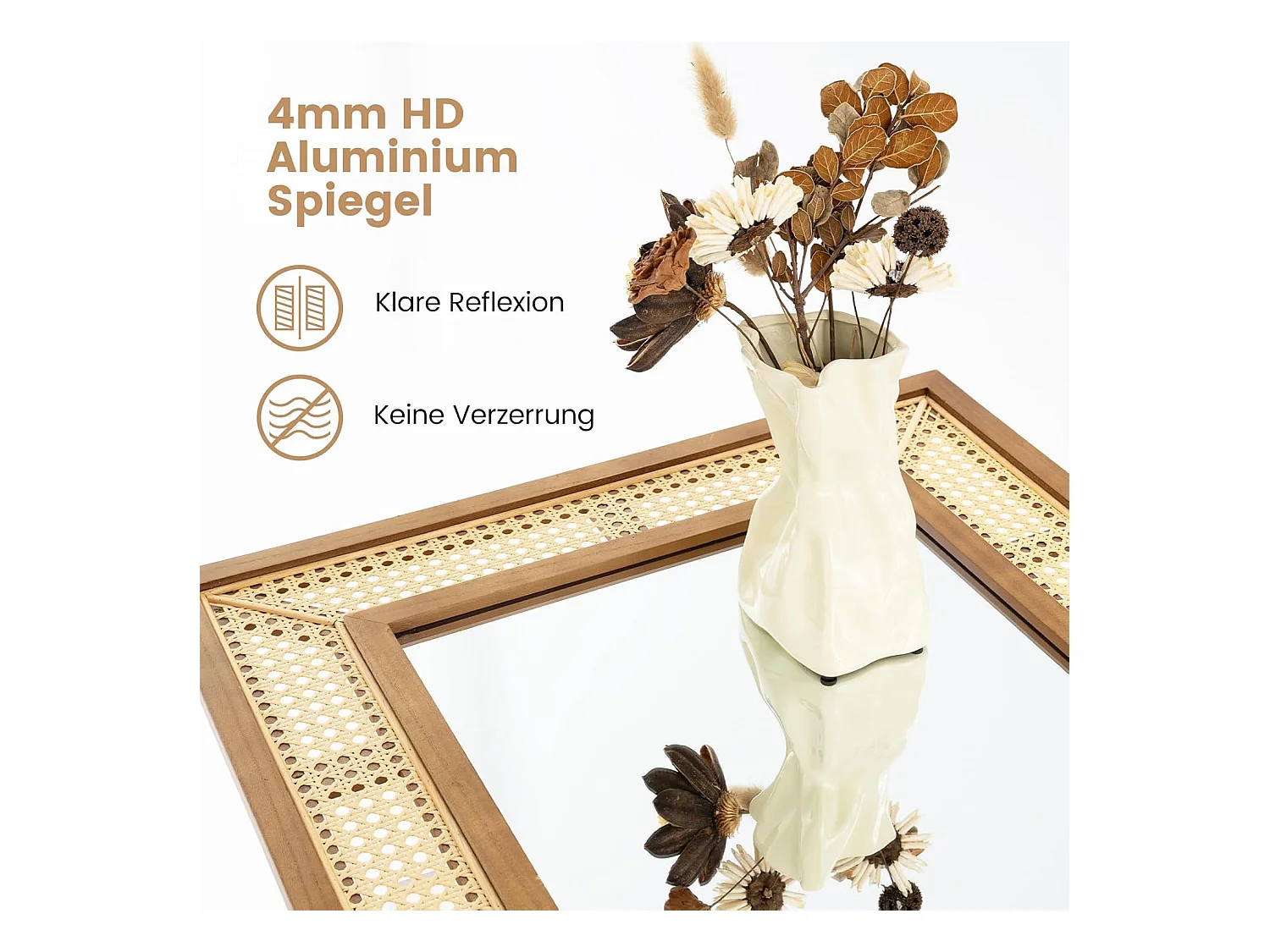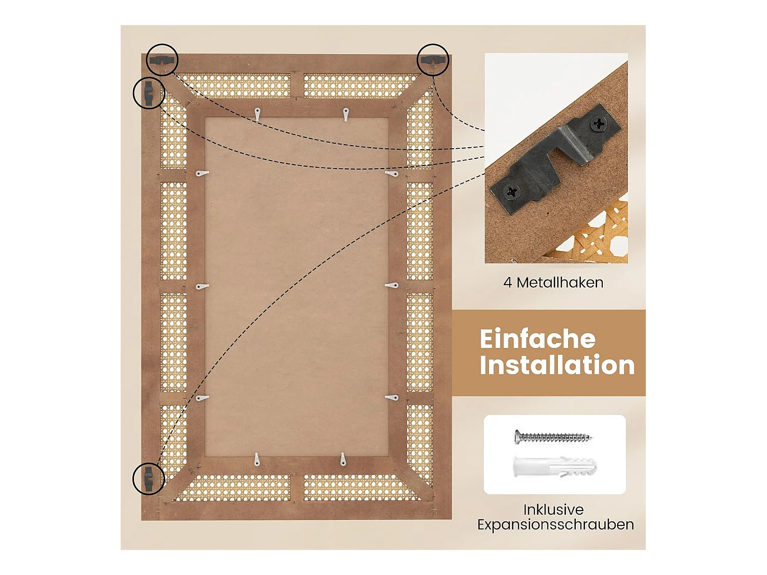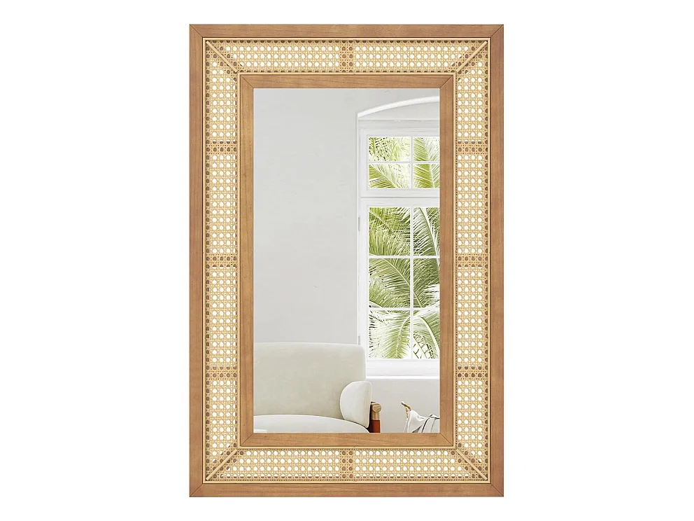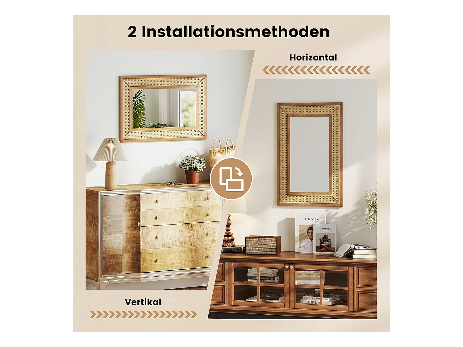 Rechthoekige wandspiegel rotan, 90 x 60 cm, decoratieve spiegel met houten frame en haken, horizontaal of verticaal, decoratieve spiegel, wandmontageTL32443