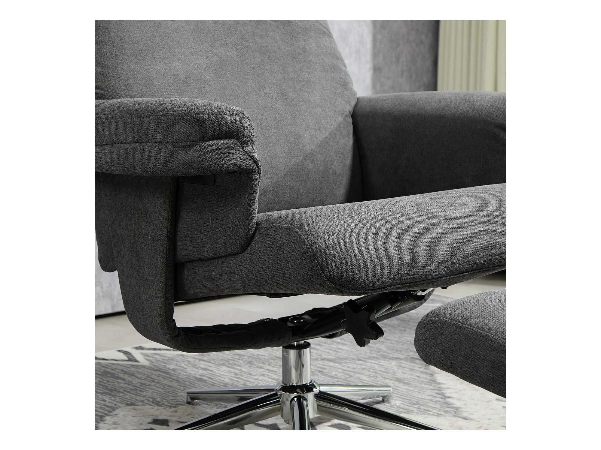 Draaibare relaxfauteuil met relaxfunctie, houten armleuningen, grijze linnen stof (86x68x100cm)