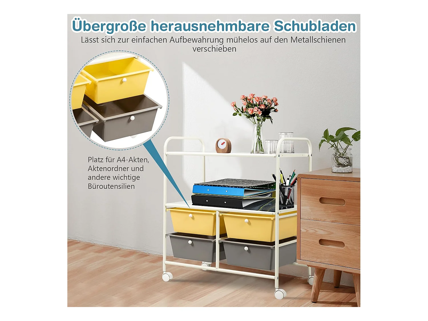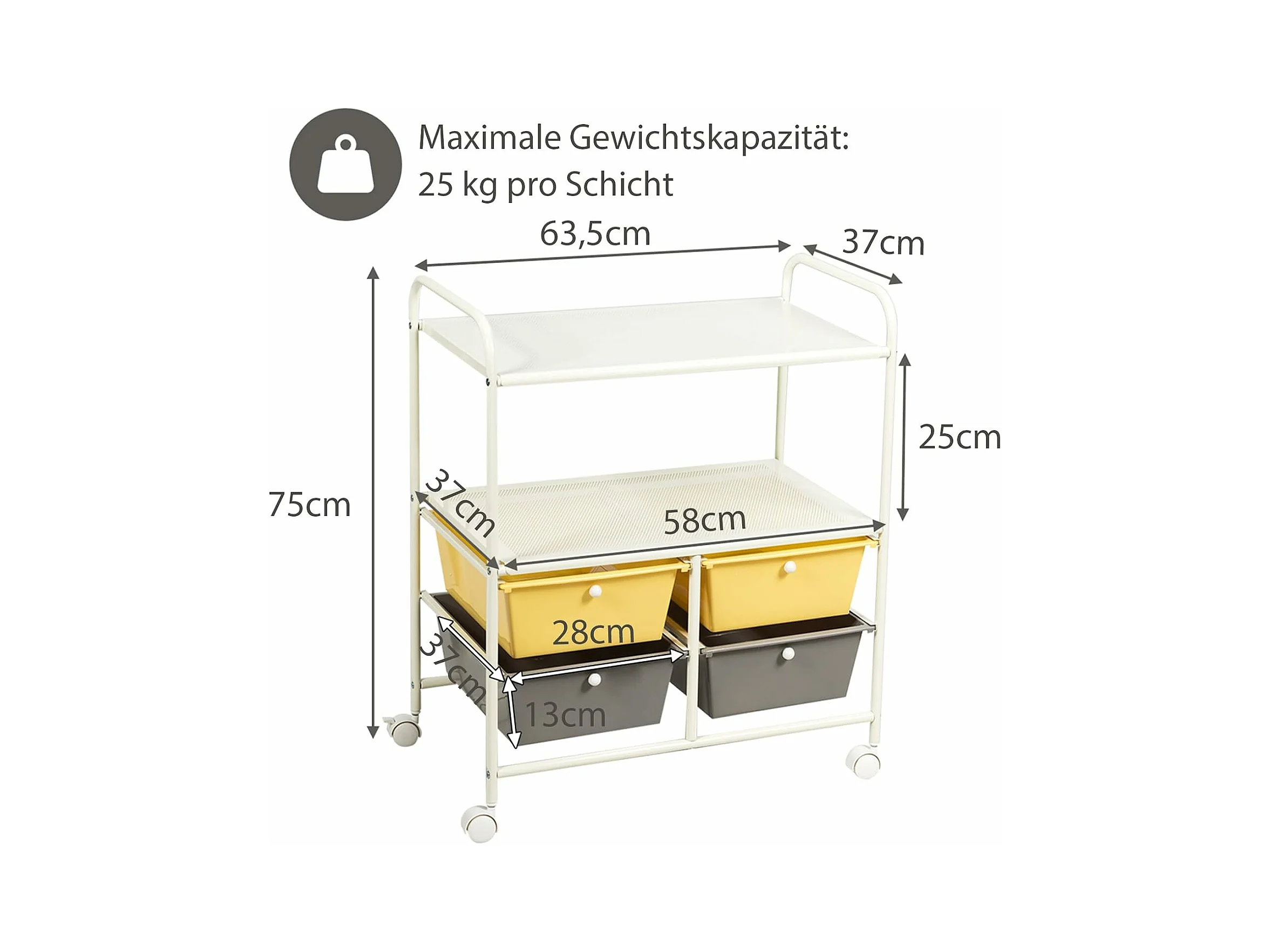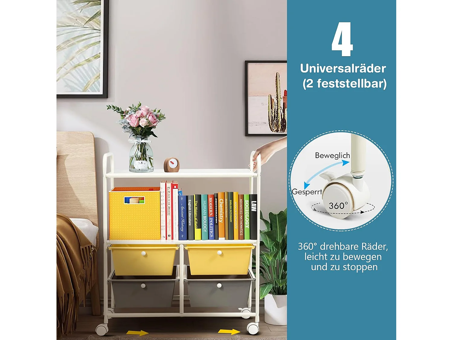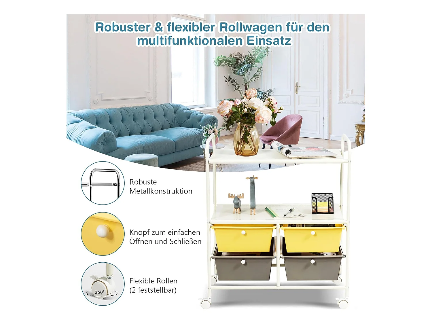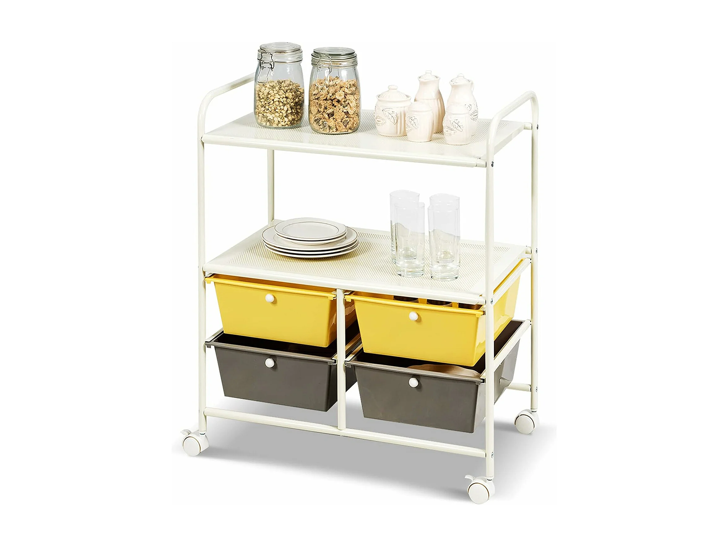Rolwagen met 4 stapelbare laden, ladewagen, rolcontainer met metalen frame en legplanken, badkamerrolwagen, opbergwagen voor kantoor, woonkamer