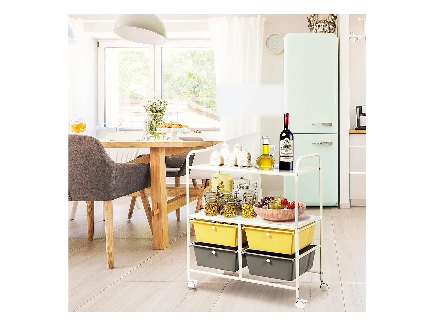 Rolwagen met 4 niveaus, serveerwagen met verstelbare planken, keukentrolley met wielen en handvat, opbergwagen voor keuken, woonkamer, slaapkamer, witVL32468