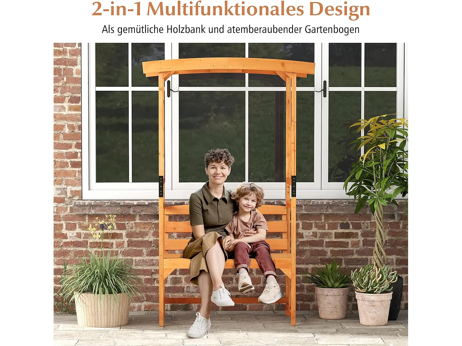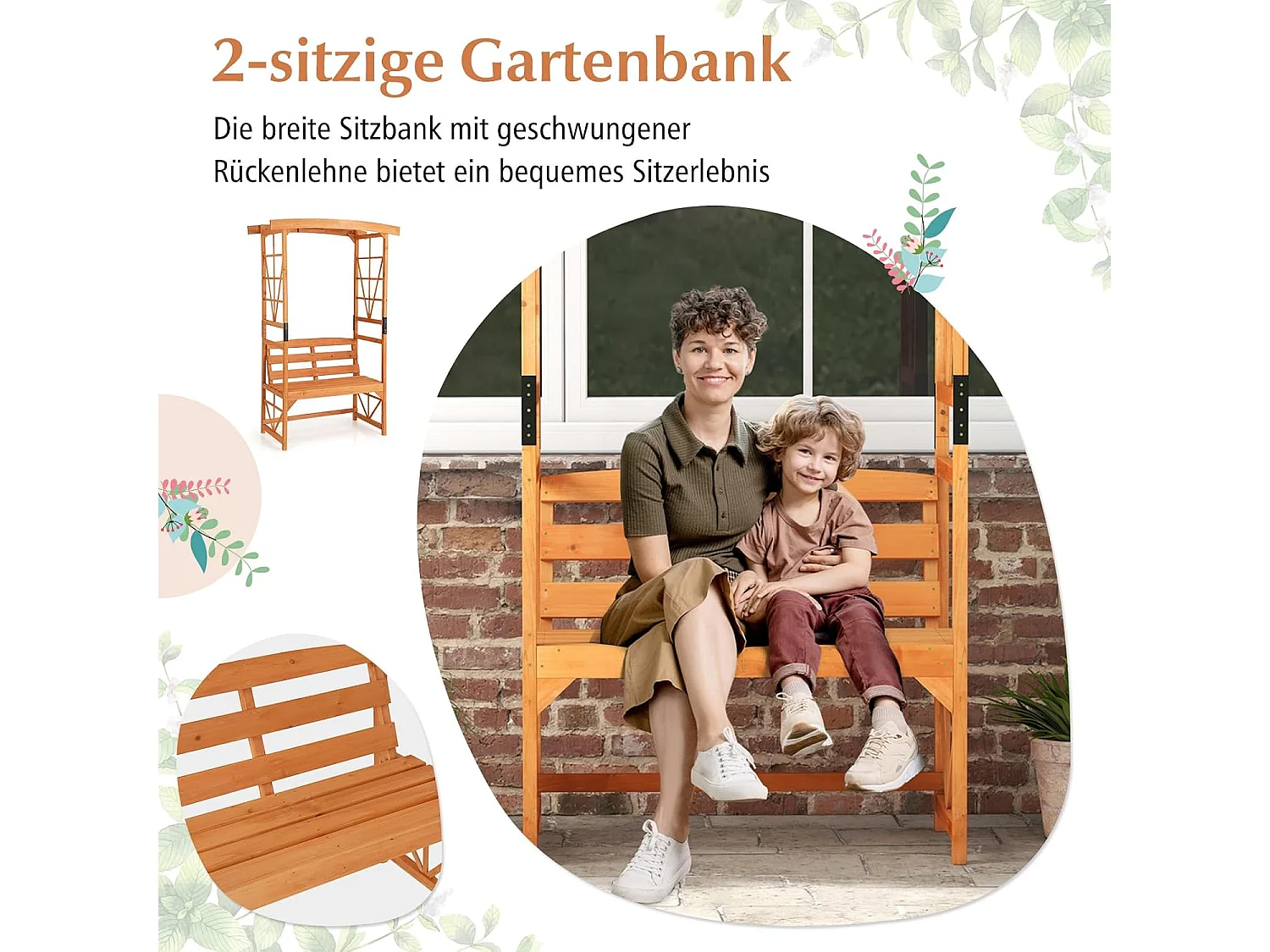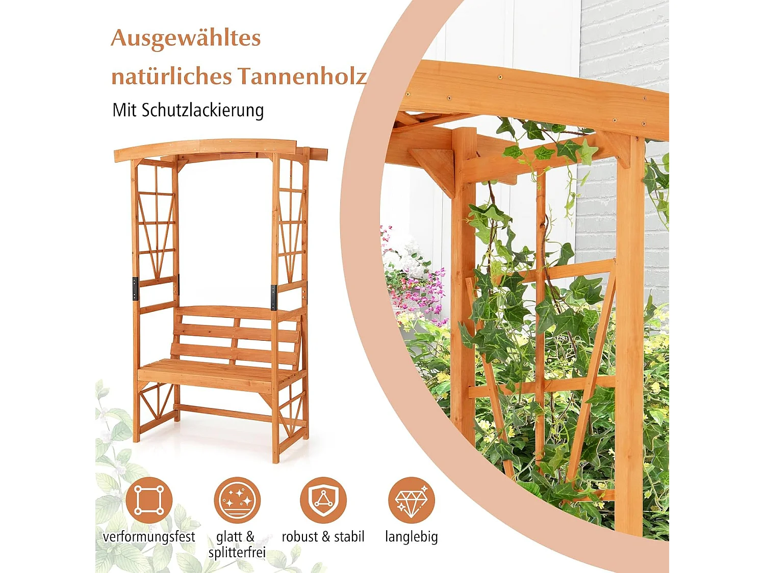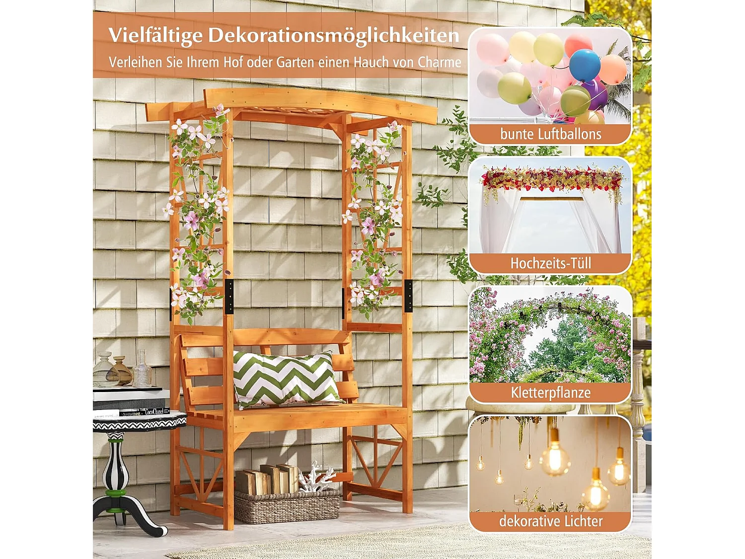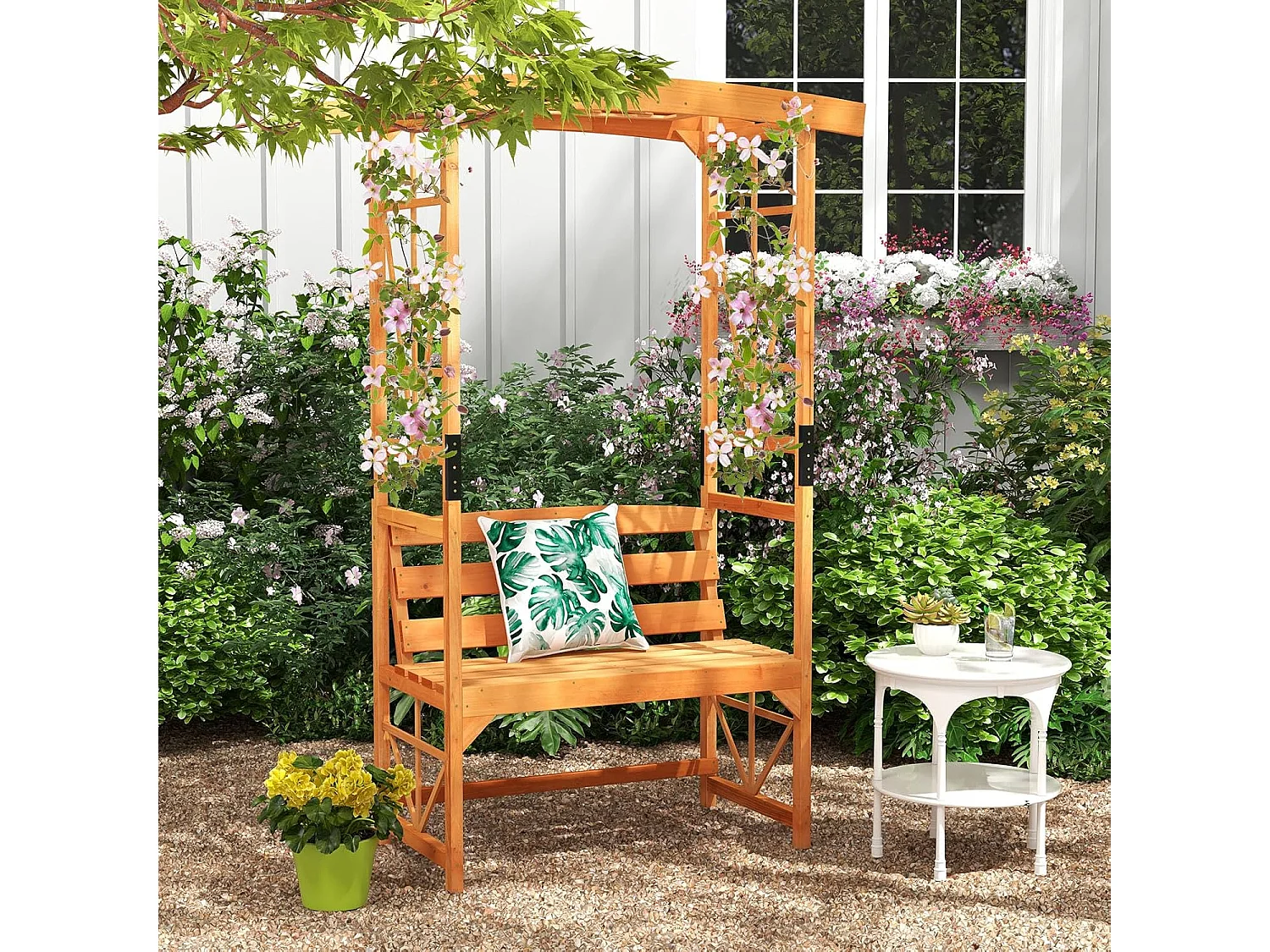 Rozenboog met bank, houten boog voor klimplanten, 2-zits tuinbank met klimhulp, zitbank met rankrooster, klimboog voor tuin, 160 x 50 x 199 cm ZB33821