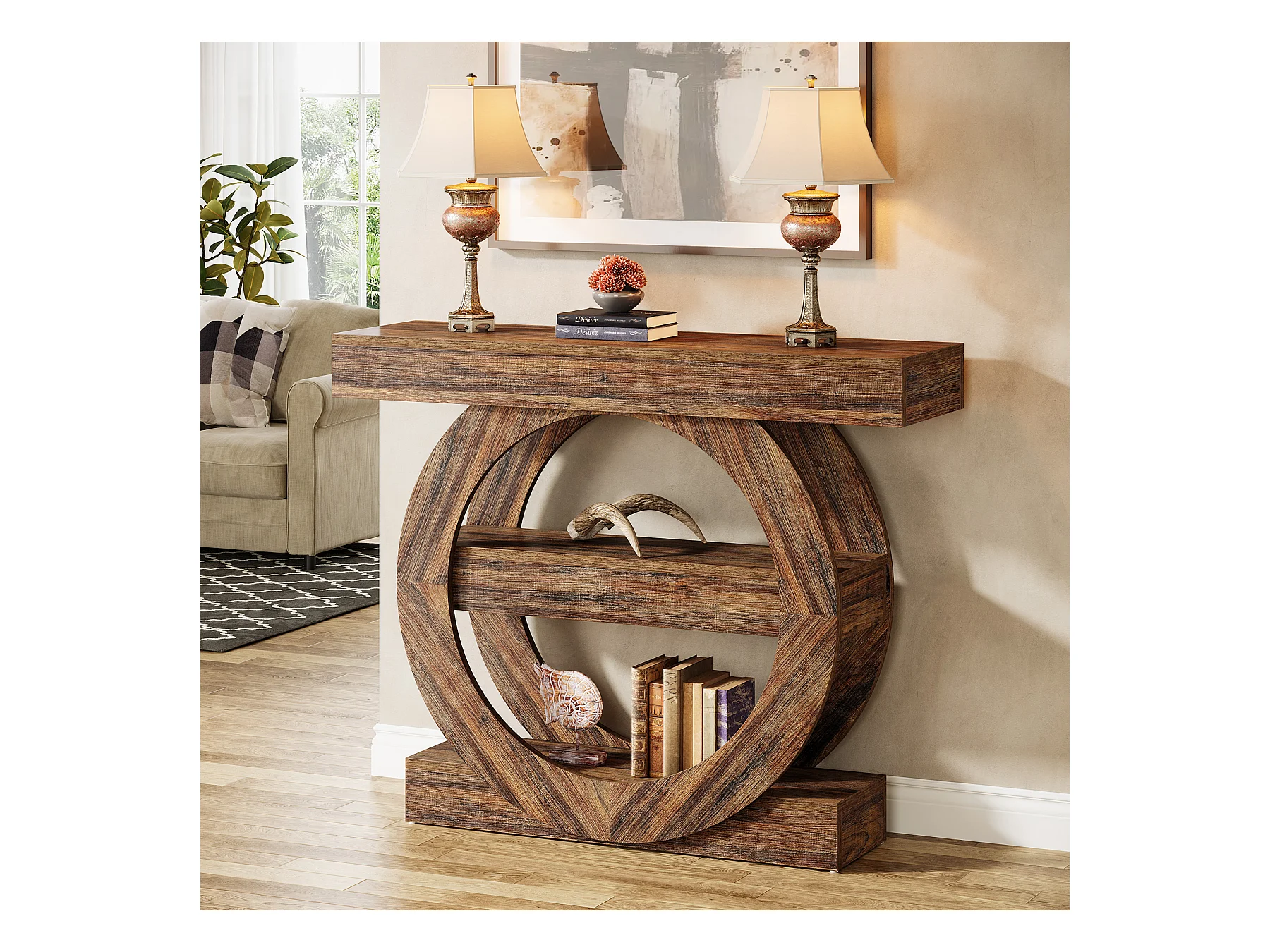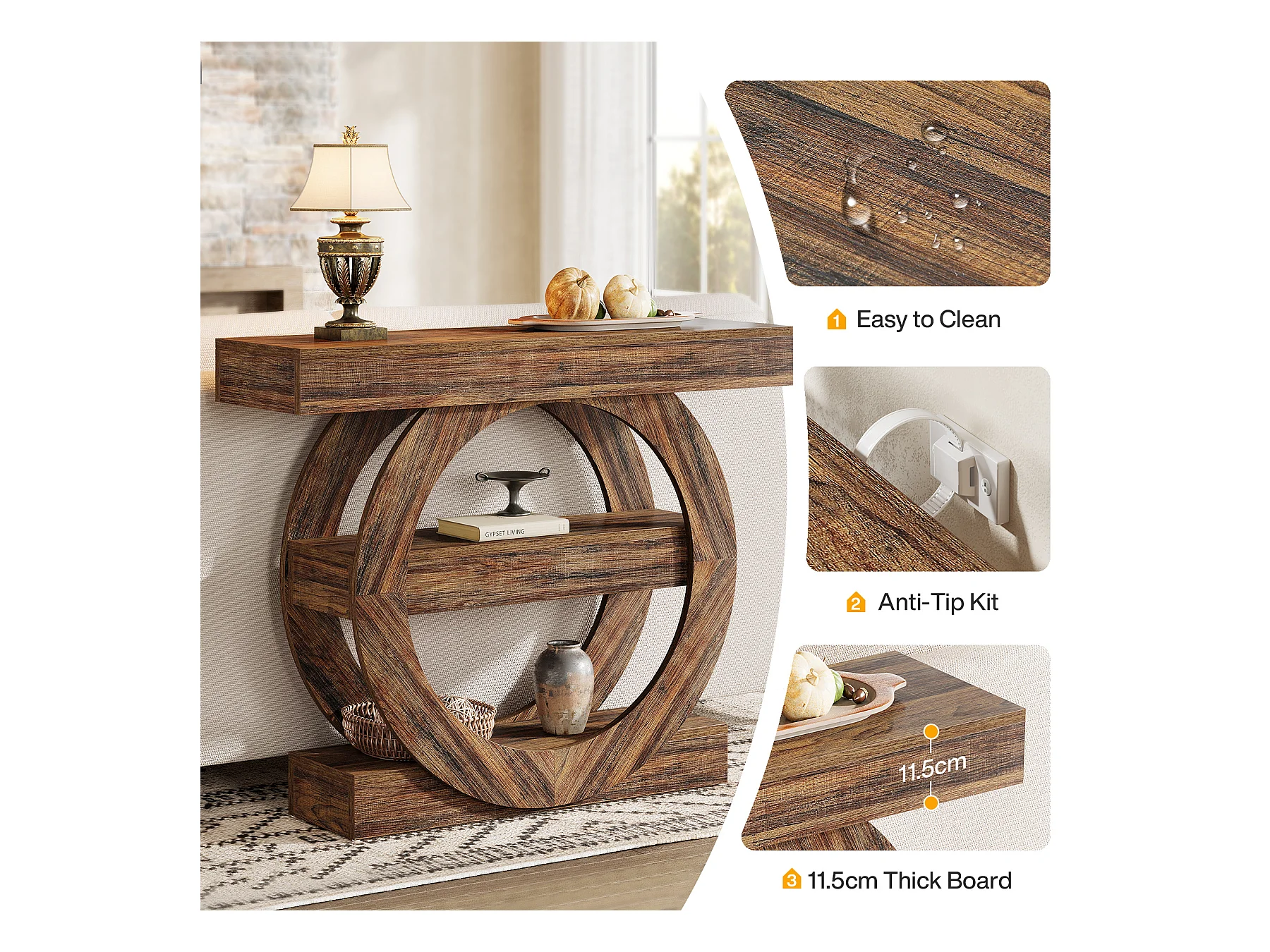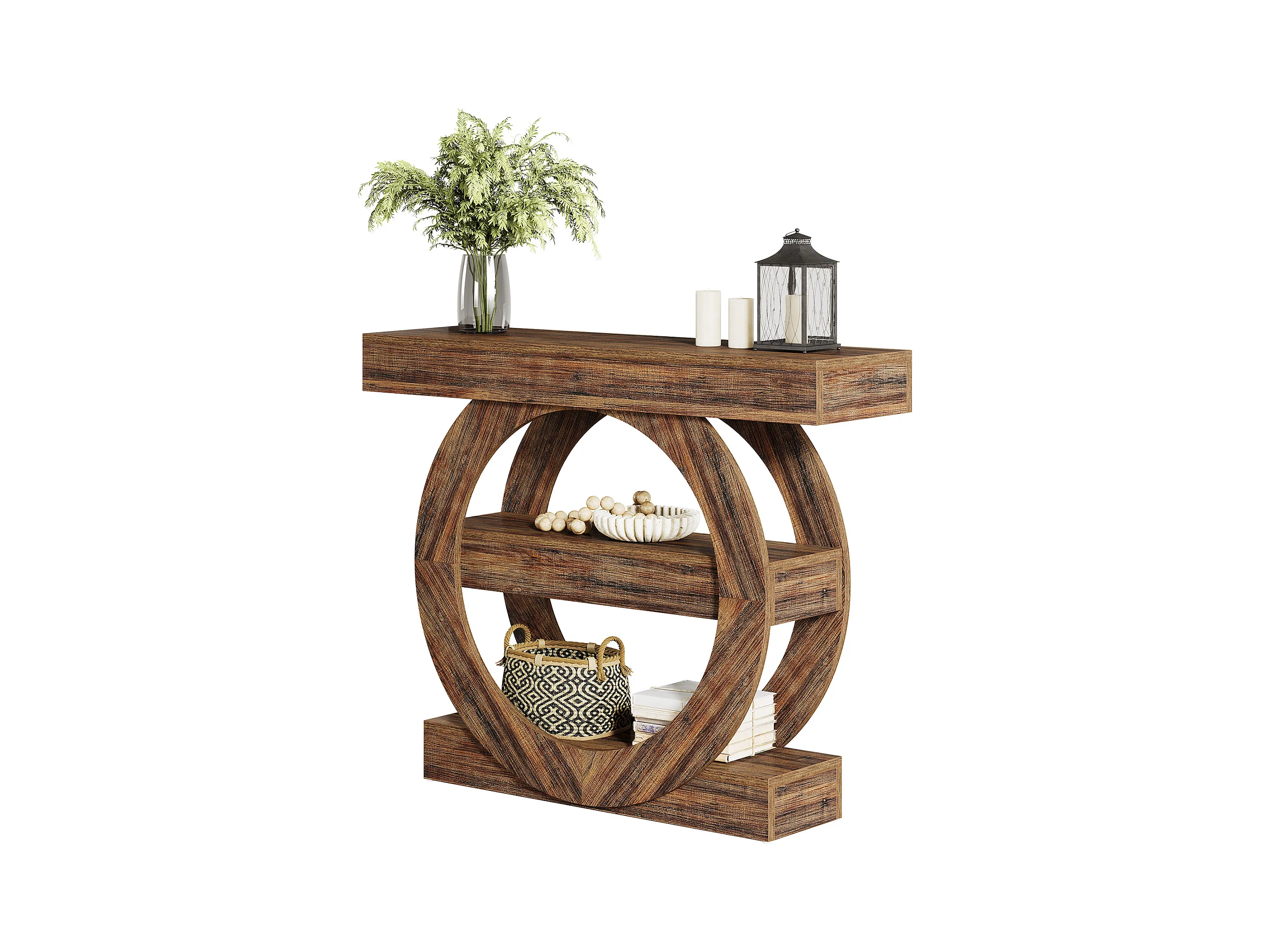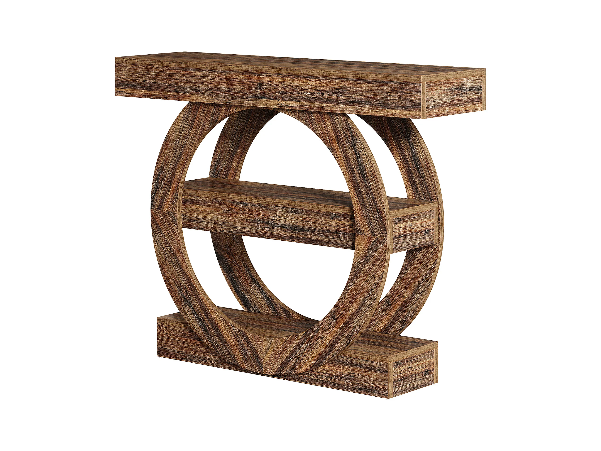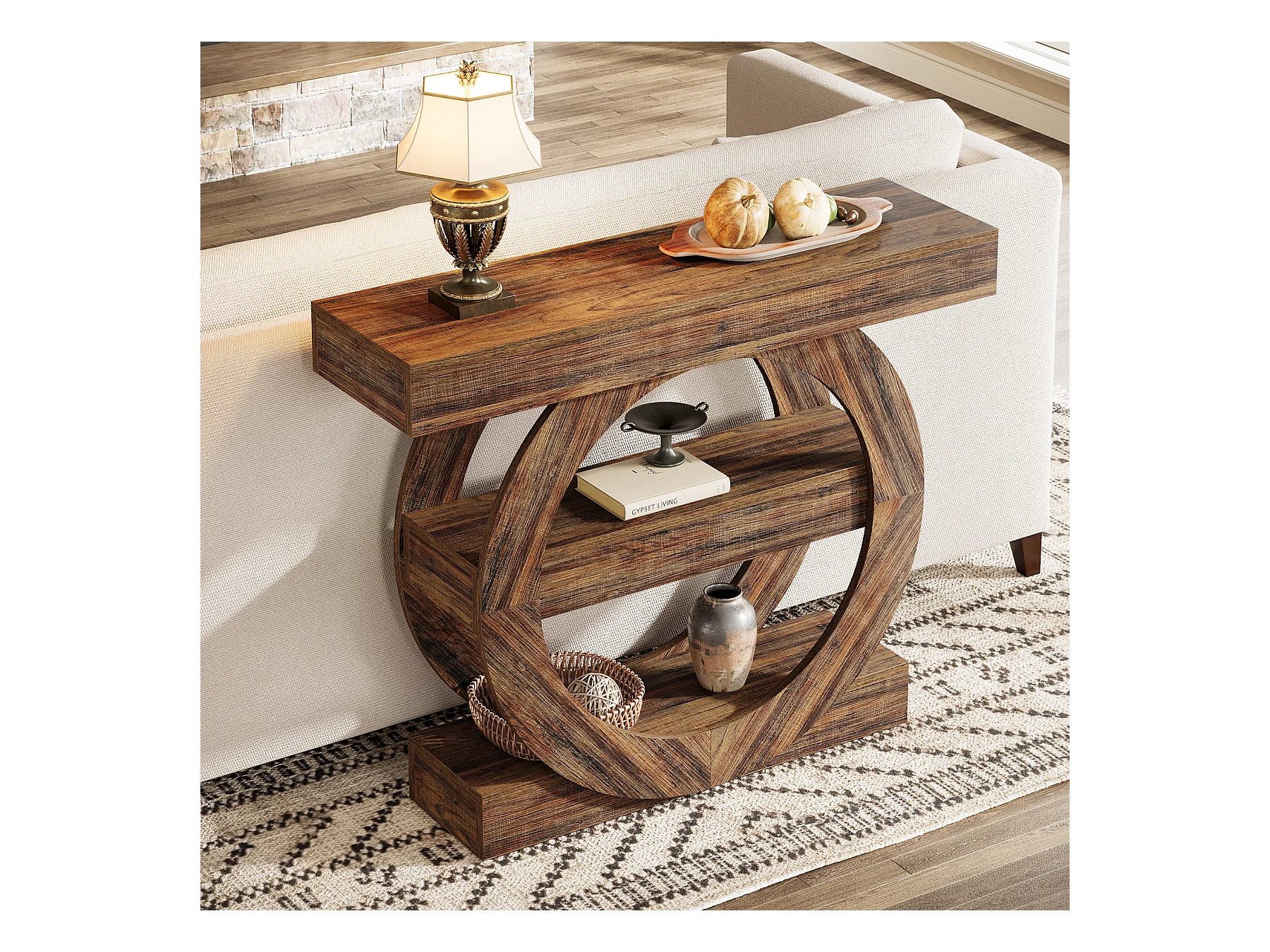 Rustieke smalle entreetafel met 3 lagen en opbergplanken, 105 cm salontafel achter de bank