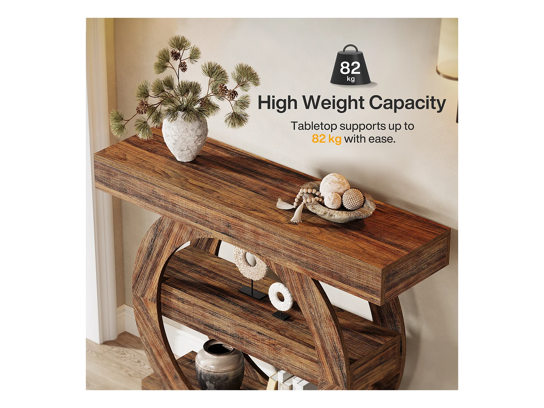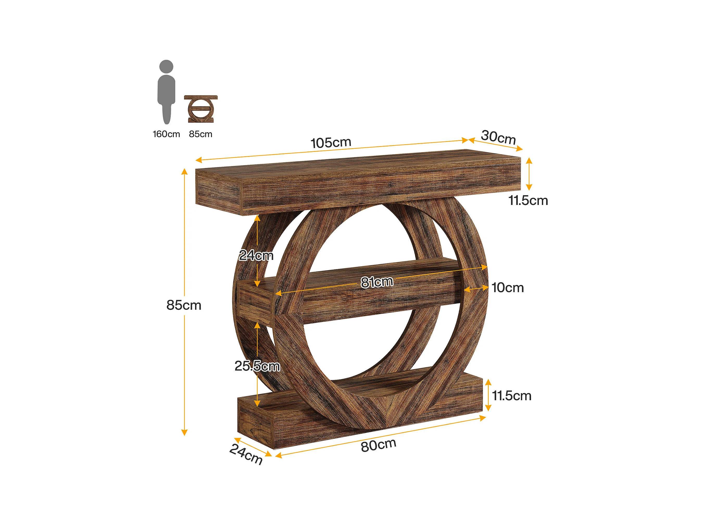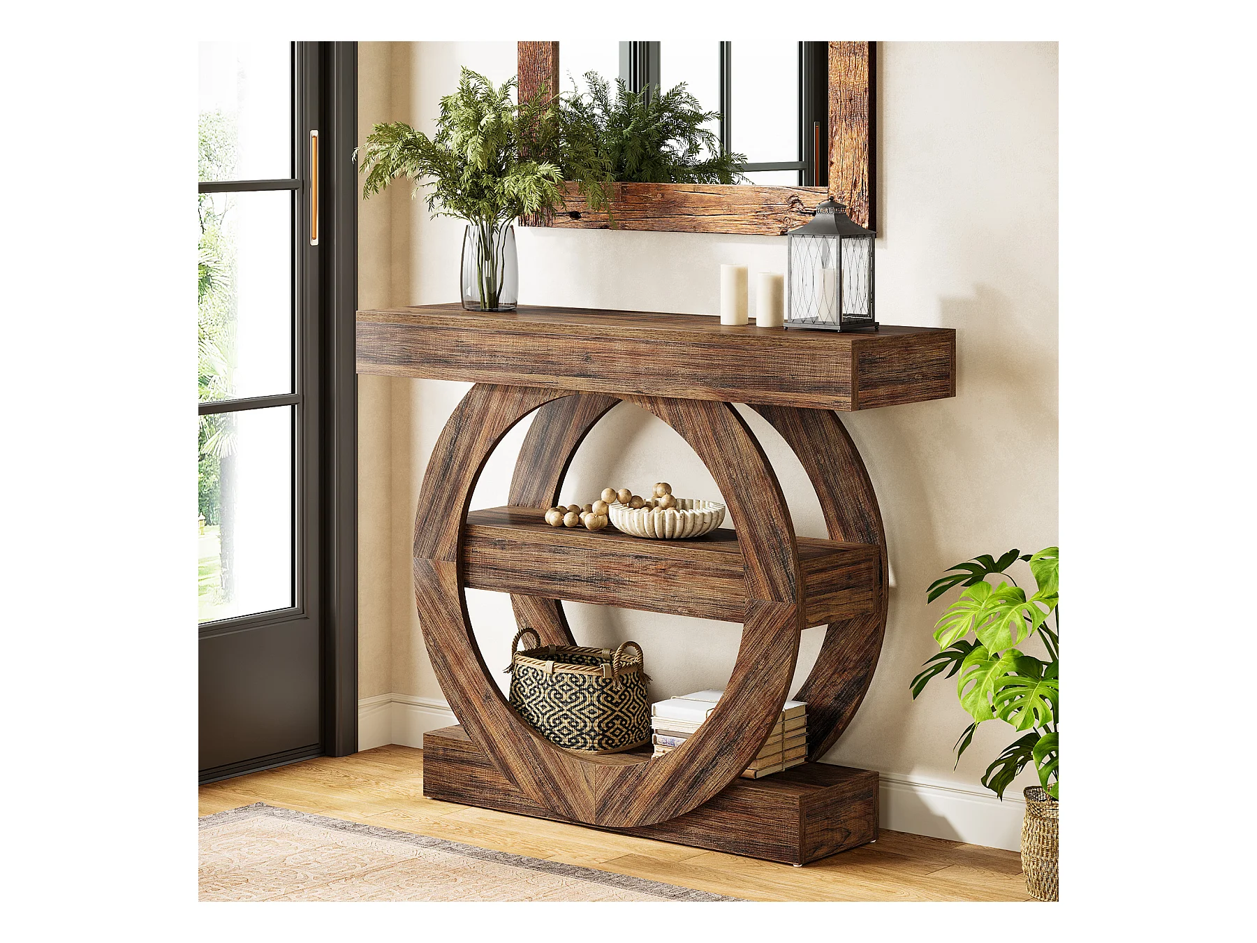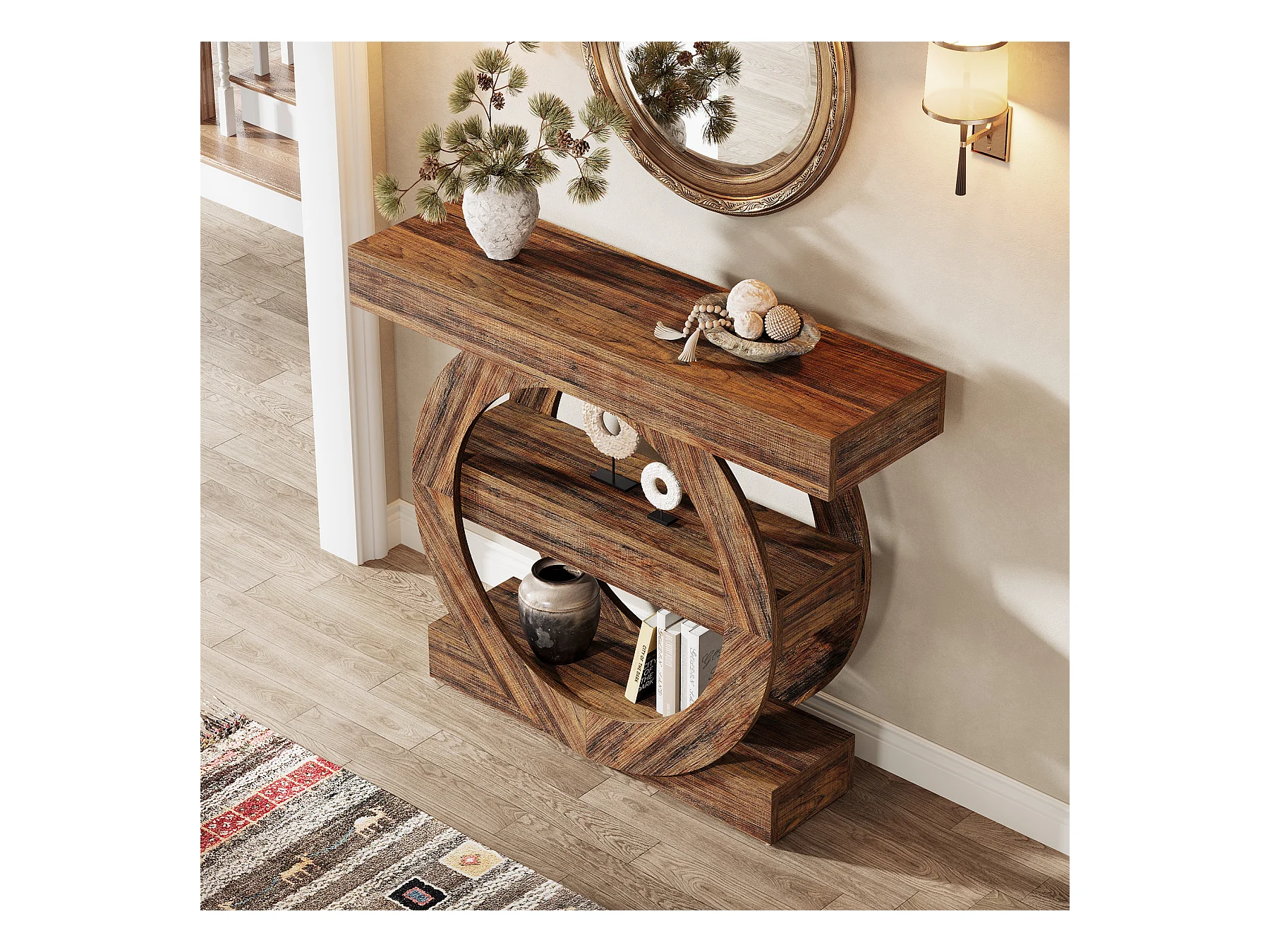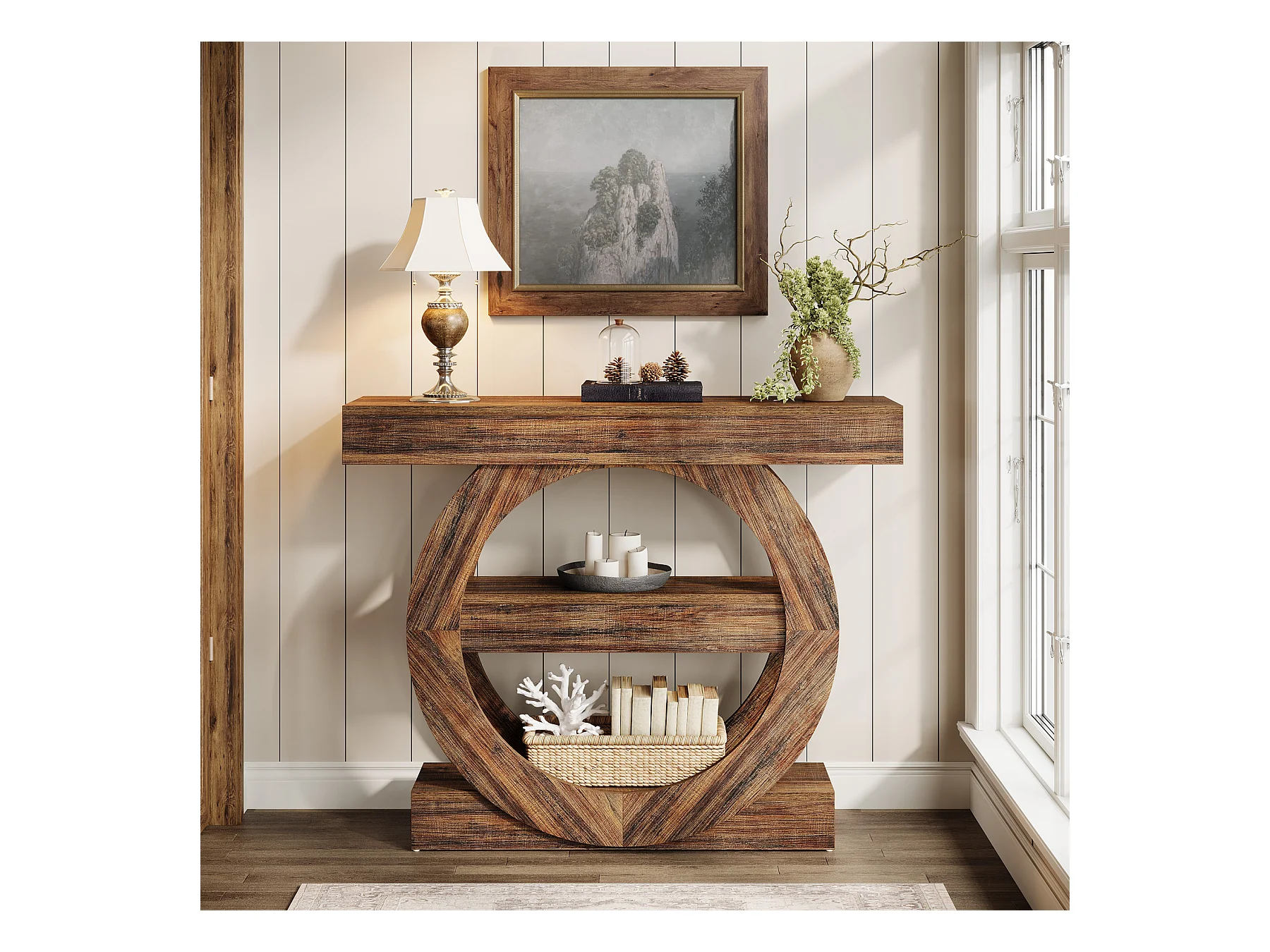 Rustieke smalle entreetafel met 3 lagen en opbergplanken, 105 cm salontafel achter de bank