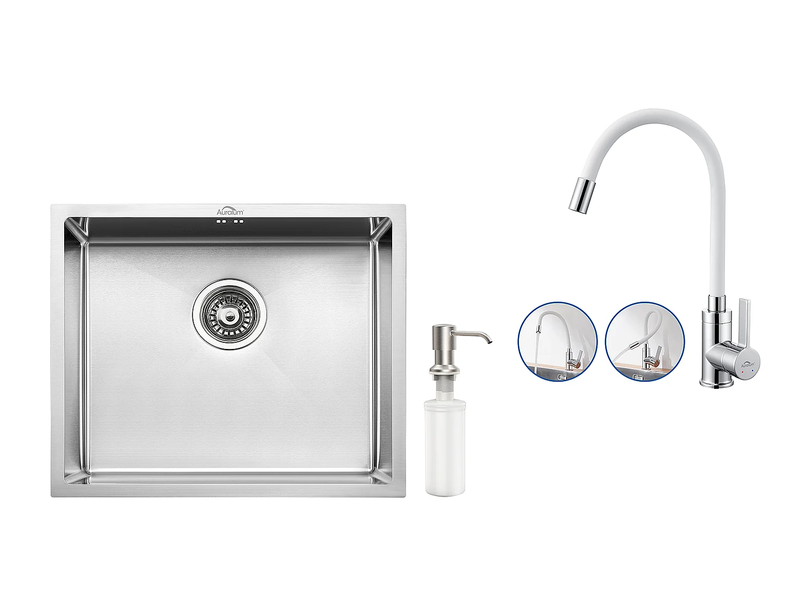RVS Aanrecht 1 Bak 50*43*18CM met Zeepdispenser+Flexibele Keukenkraan Hoge Uitloop Vrij Draaibaar, in Messing,Monogat,Wit