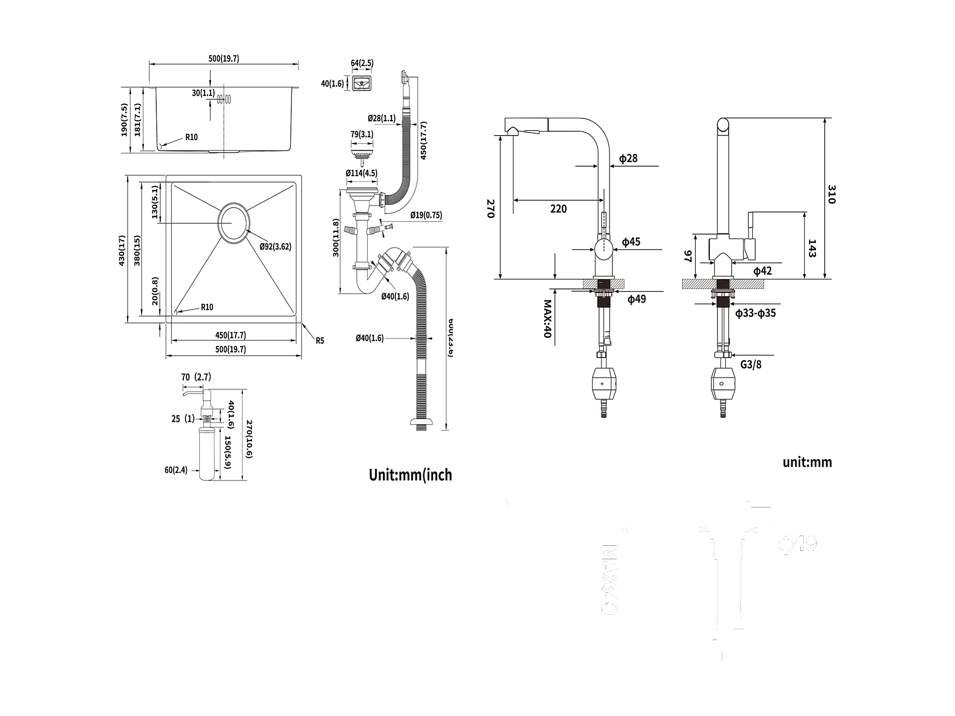 RVS Aanrecht 1 Bak 50*43*18CM met Zeepdispenser+trekbare keukenkraan met twee functies, chroom
