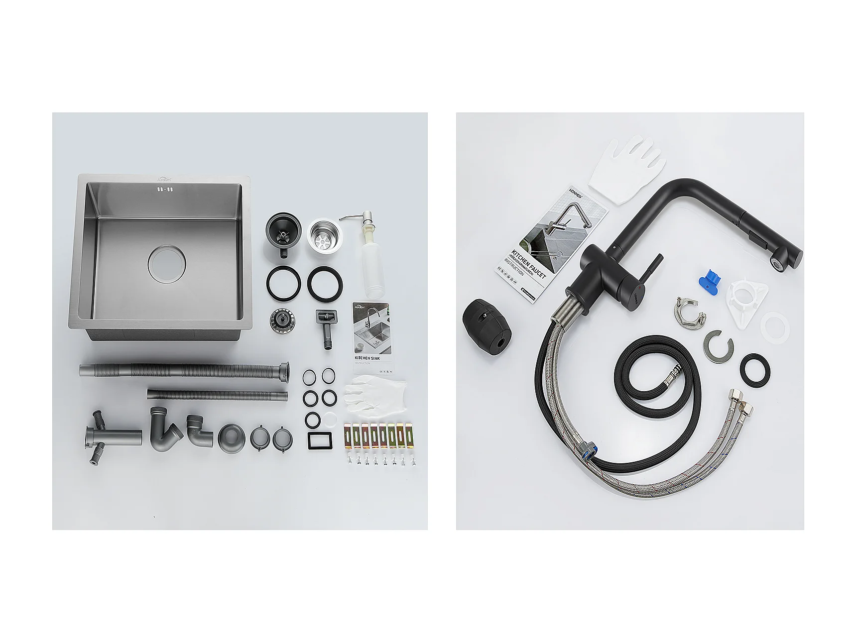 RVS Aanrecht 1 Bak 50*43*18CM met Zeepdispenser+ Keukenkraan met Uittrekbare Handdouche, Zwart+Chroom