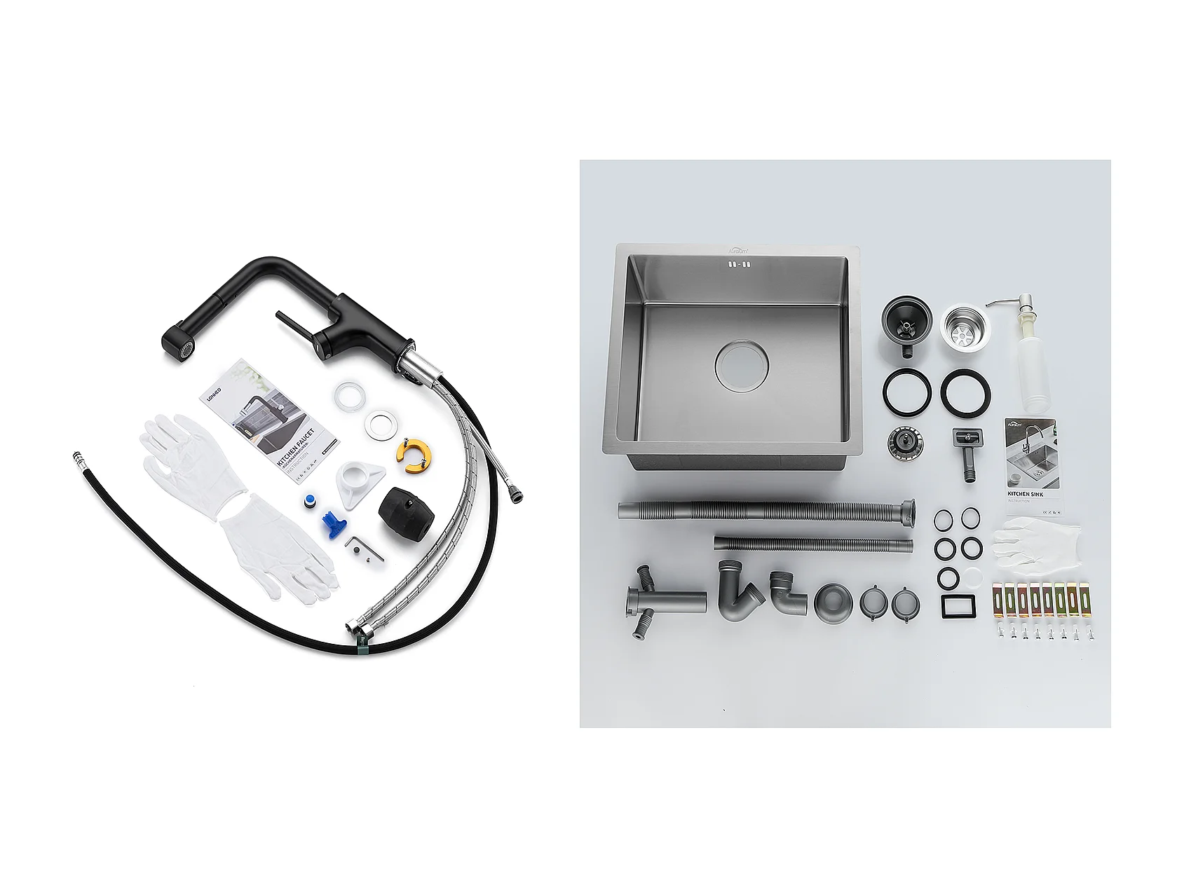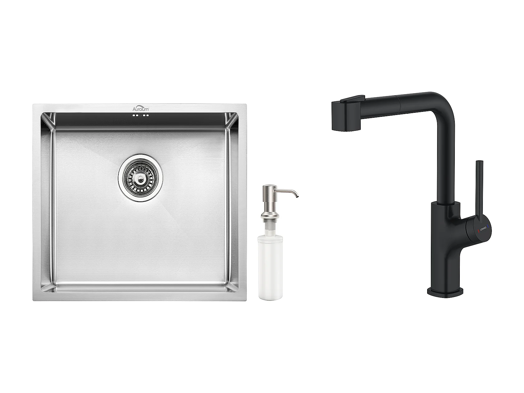 RVS Aanrecht 1 Bak 50*43*18CM met Zeepdispenser+ Zwarte Keukenkraan met Uittrekbare Douchekop