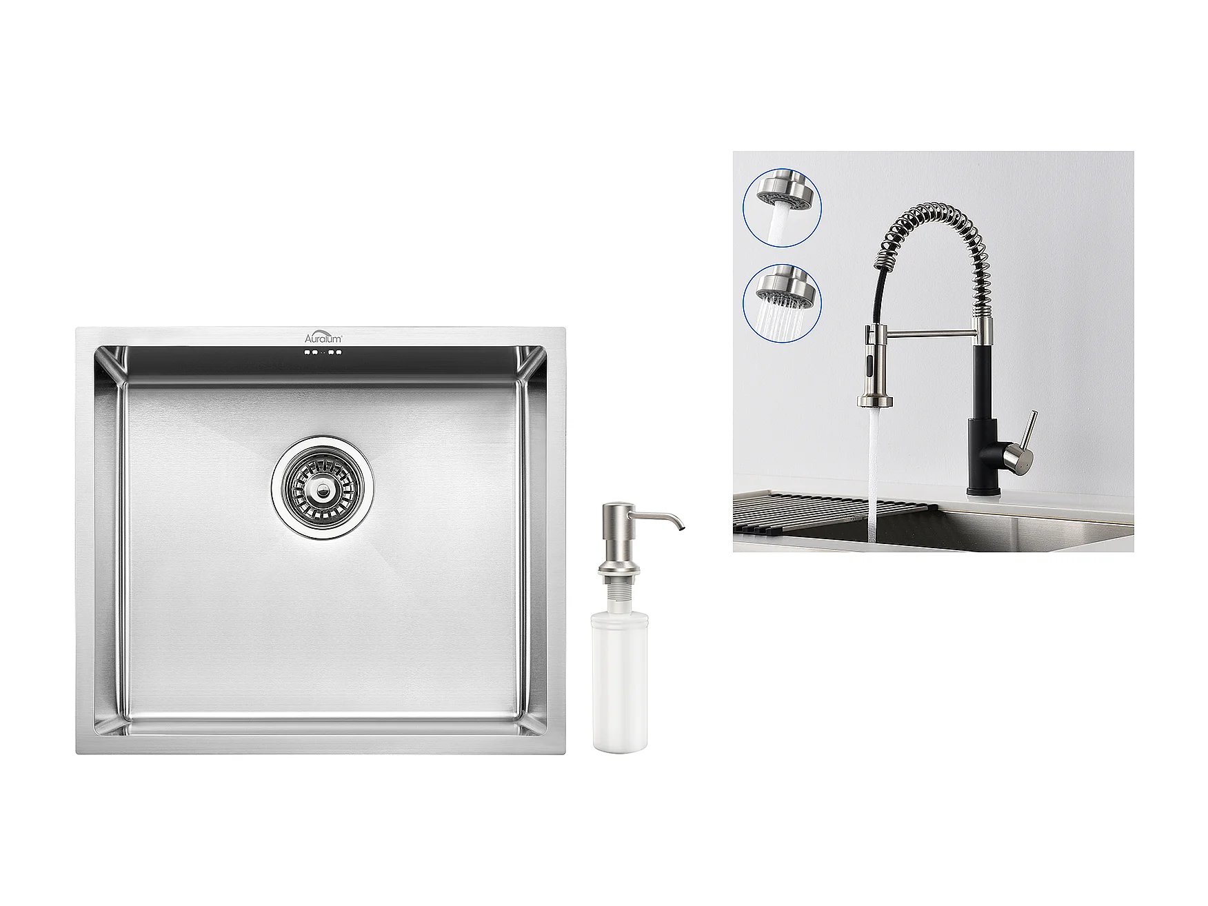 RVS Aanrecht1 Bak 50*43*18CM met Zeepdispenser + Keukenkraan met Uittrekbare Handdouche 360 °2 Functies, Chrome