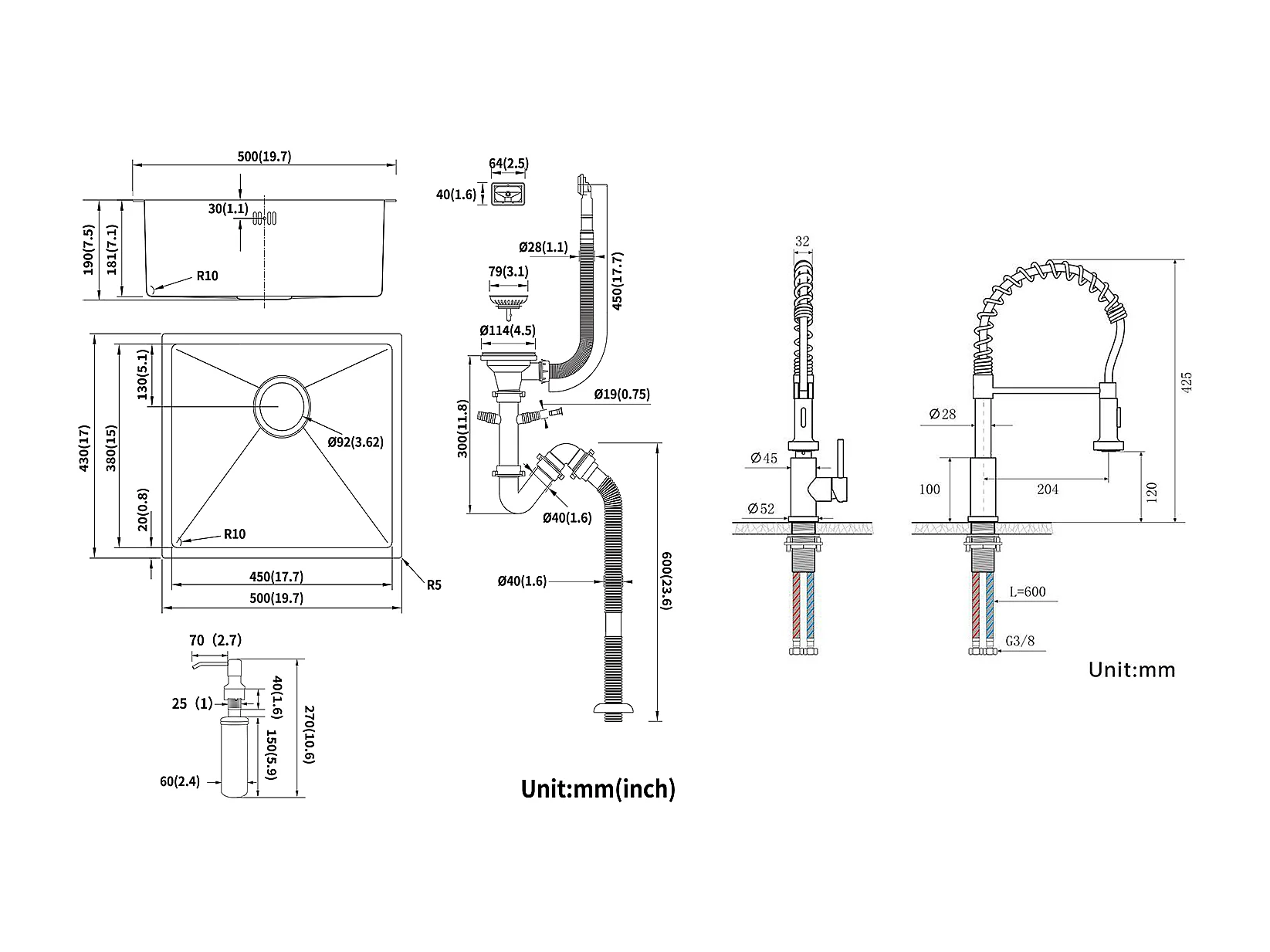 RVS Aanrecht 1 Bak 50*43*18CM met Zeepdispenser+trekbare keukenkraan met twee functies, chroom