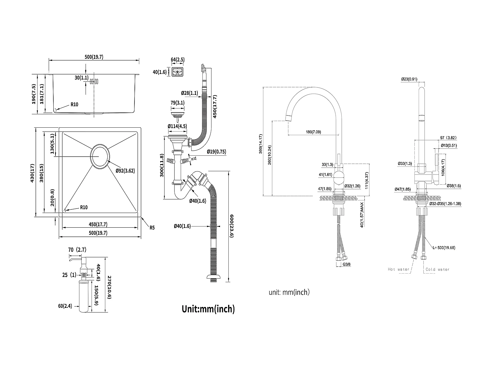 RVS Wastafel 1 Bak 50*43*18CM met Zeepdispenser+ Keukenkraan Verchroomd PIvotant 360° Koud /Warm Water