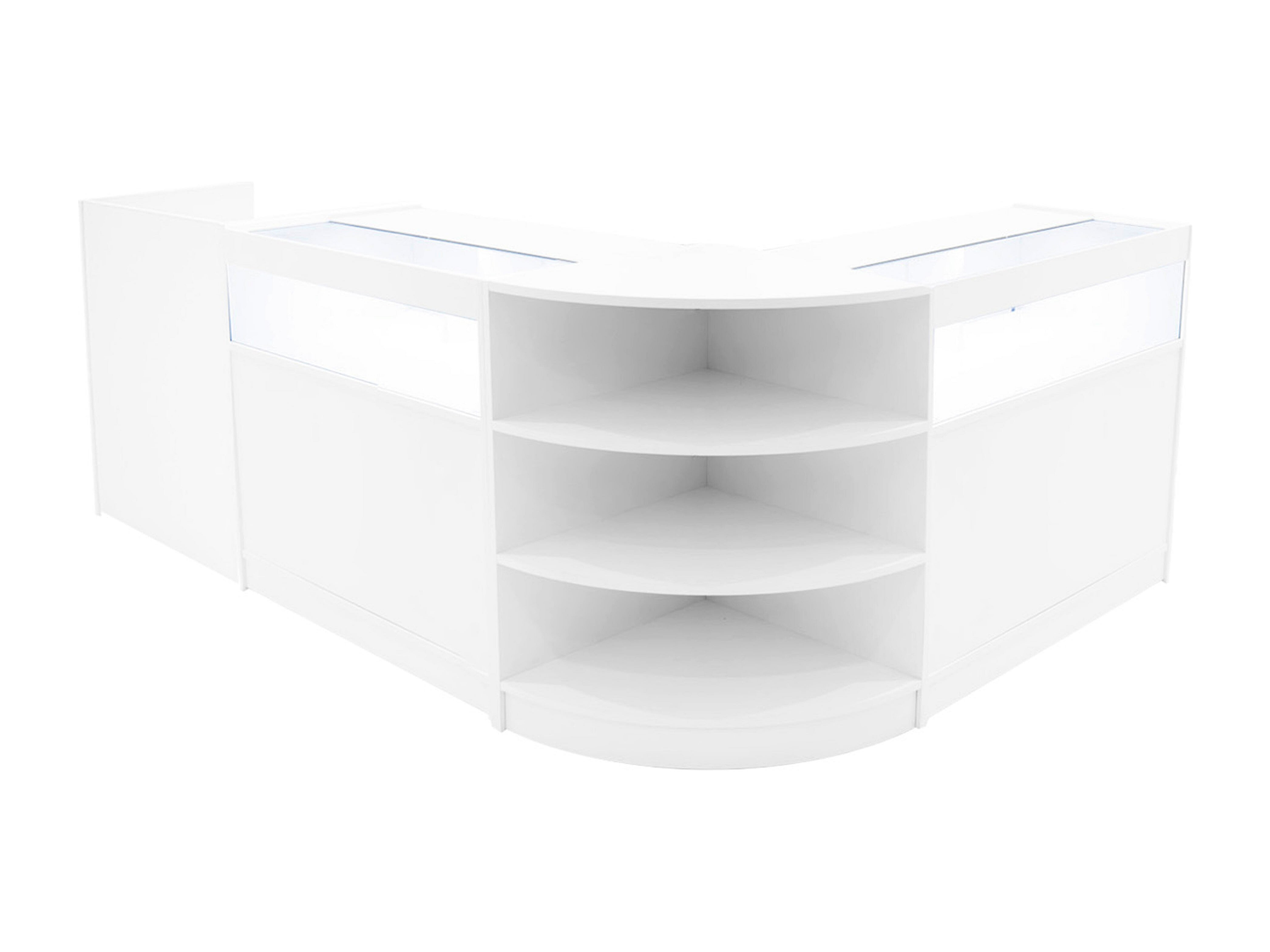 Tous les comptoirs sont fabriqués en MDF de haute qualité avec une finition en mélamine blanc durable, assurant une performance longue durée et une esthétique moderne uniforme. Ce matériau commun et cette finition coordonnée garantissent une apparence harmonieuse dans l ensemble de votre agencement, tandis que les éléments en verre trempé du B900 ajoutent une touche raffinée aux zones d exposition.