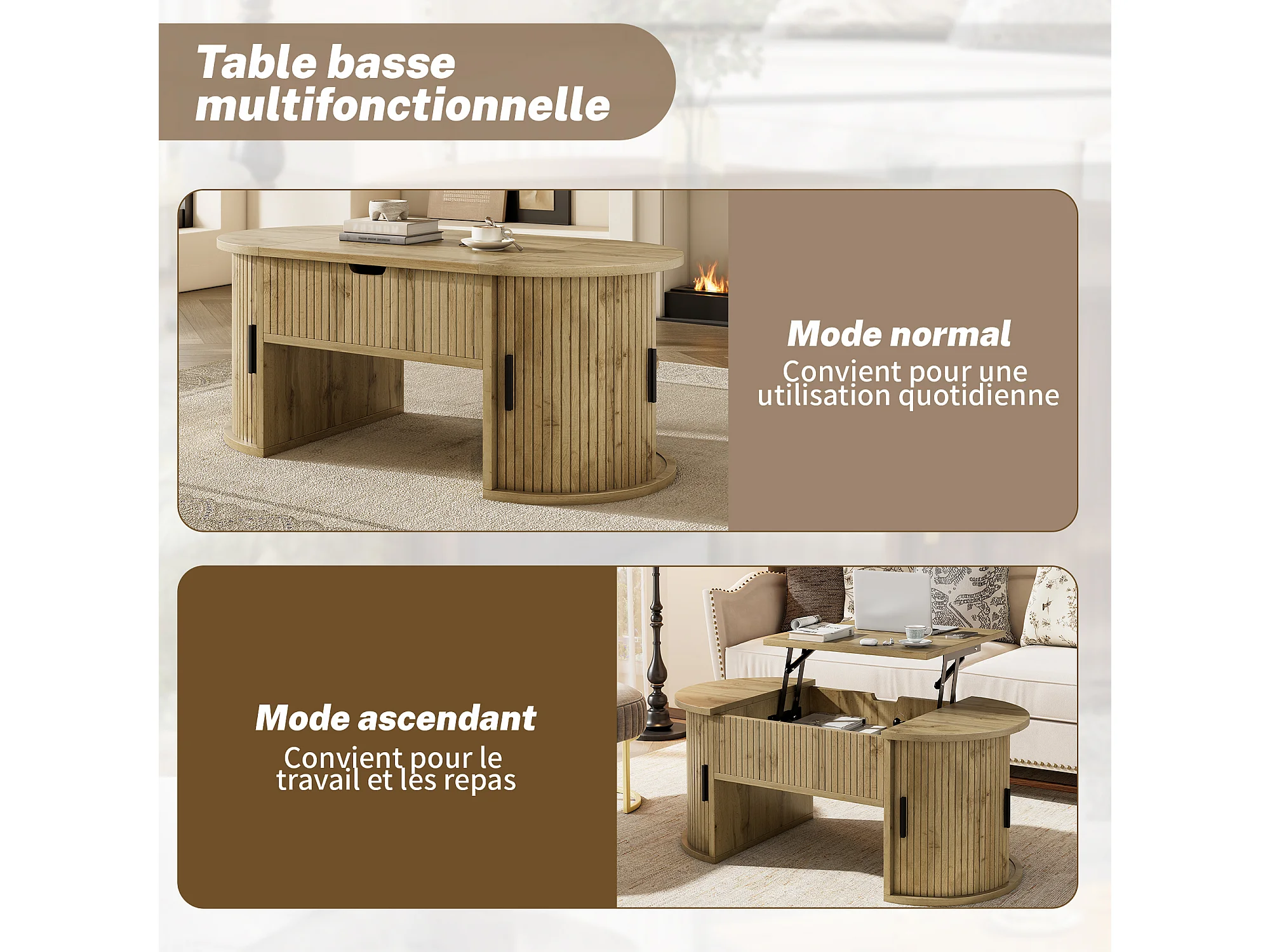 Salontafel met opklapbaar blad en schuifdeuren - Licht naturel 100x50x40,5 cm
