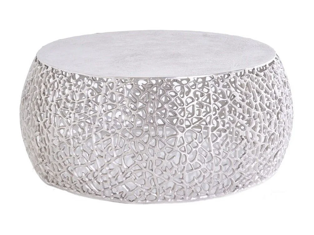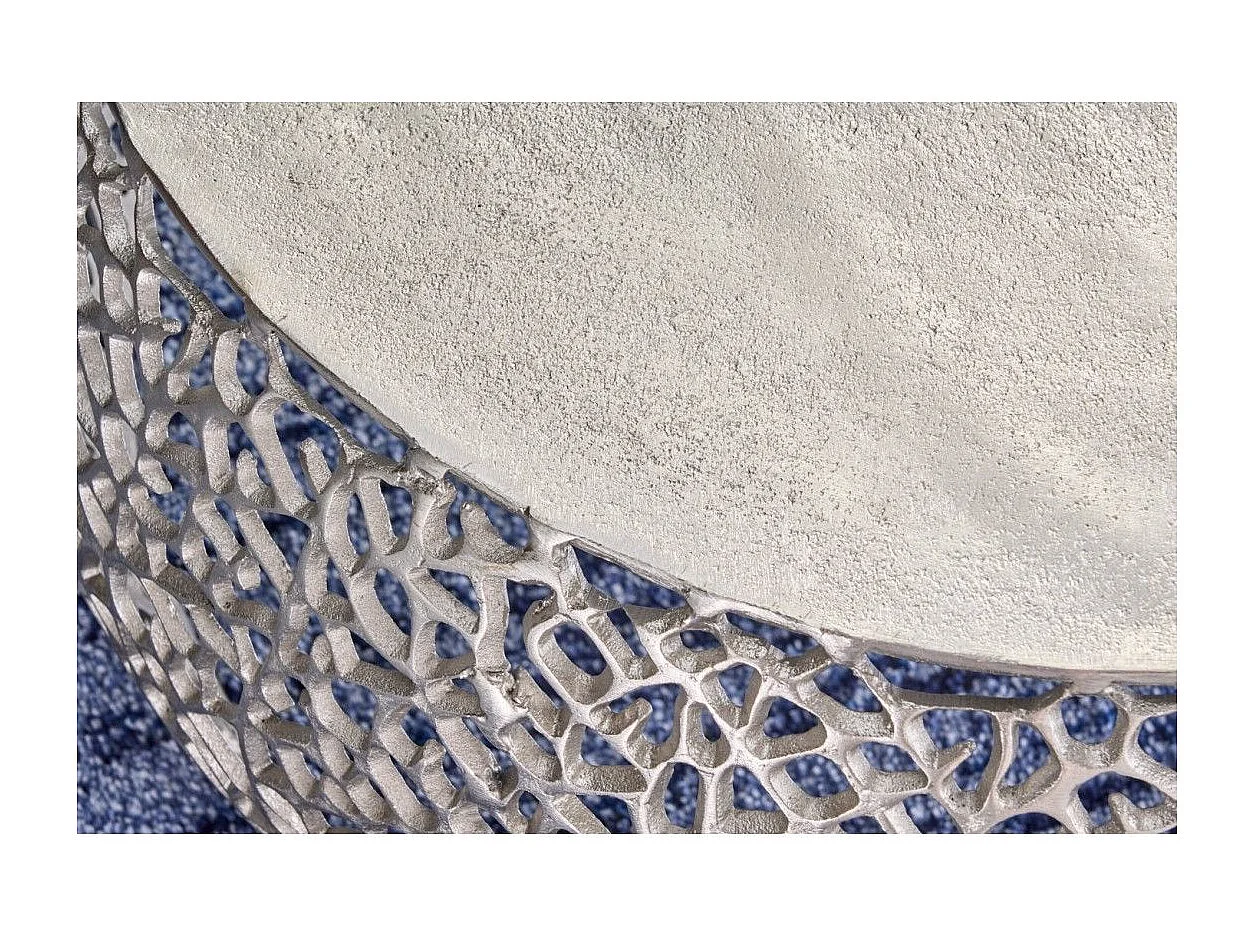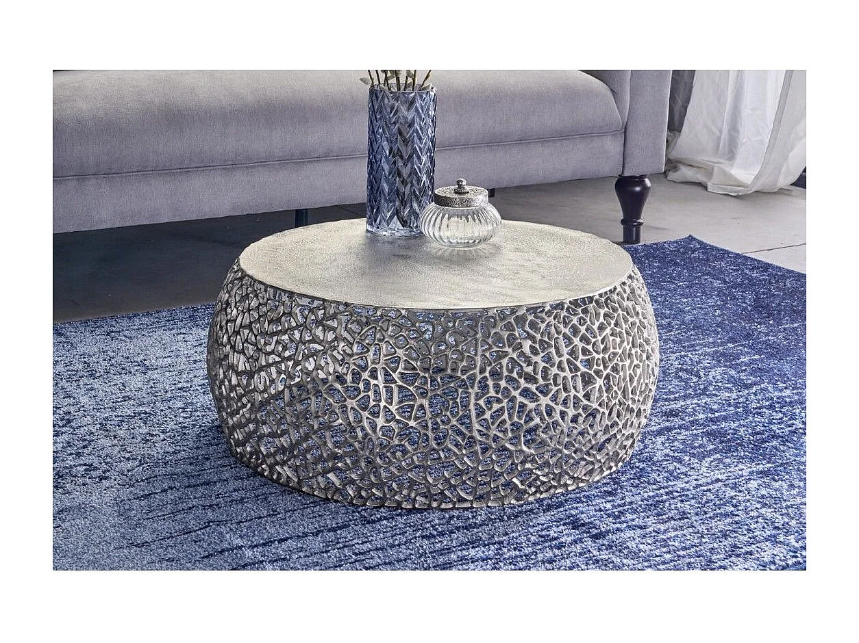 Salontafel METRIX rond 73 cm zilverkleurig met geometrisch patroon – Design salontafel van aluminium en mat wit blad