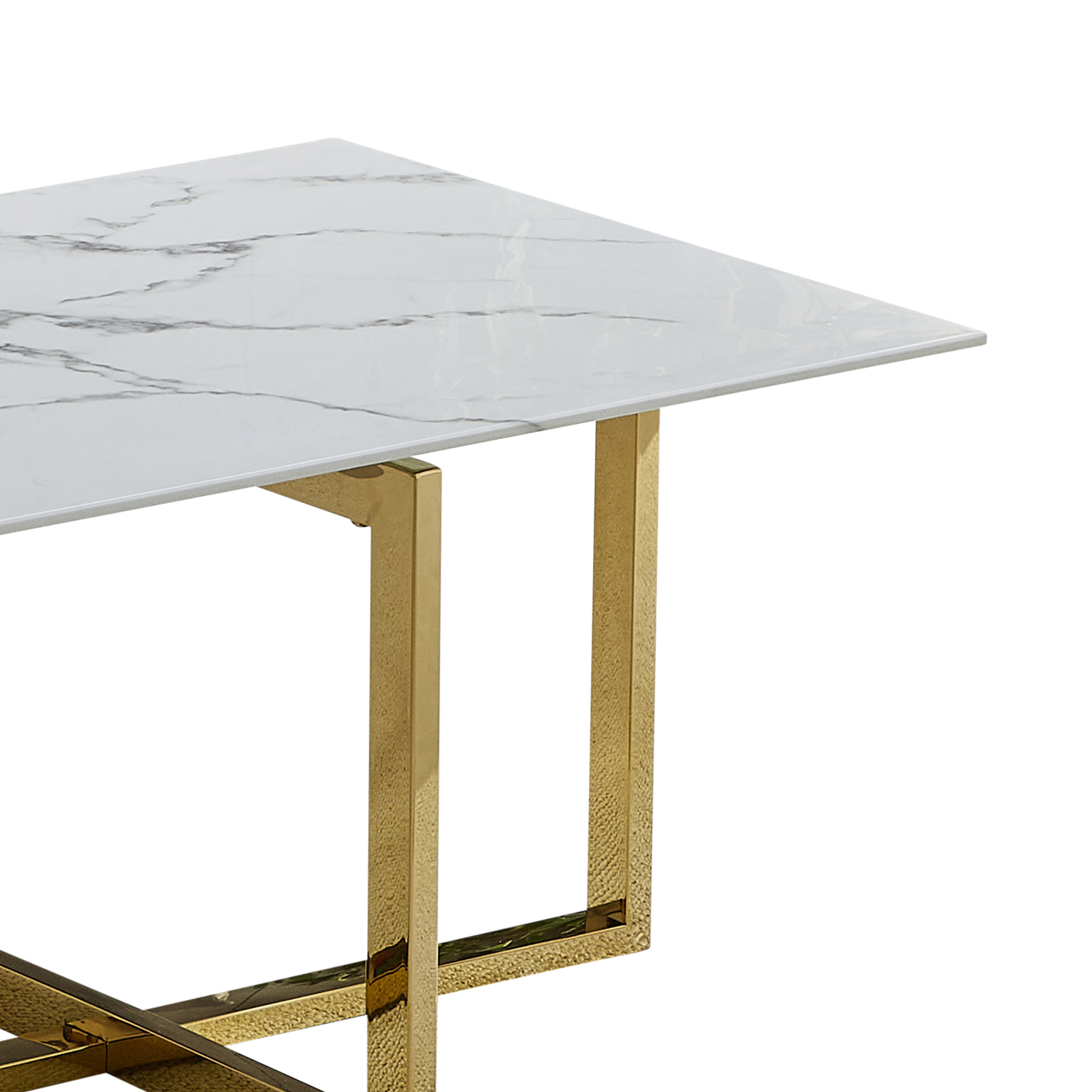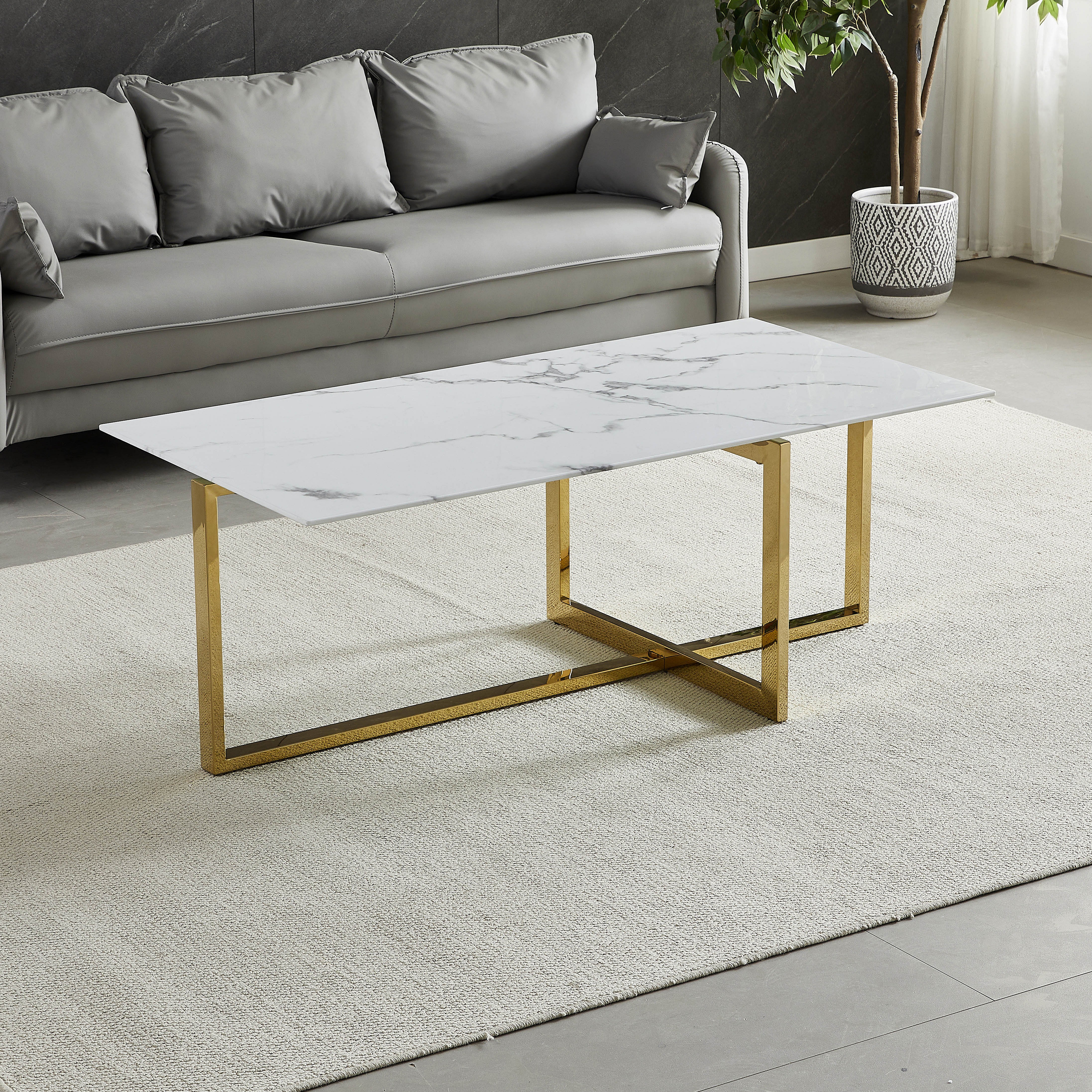 Salontafel rechthoekig - Gehard glas wit marmer - Goudkleurig metaal