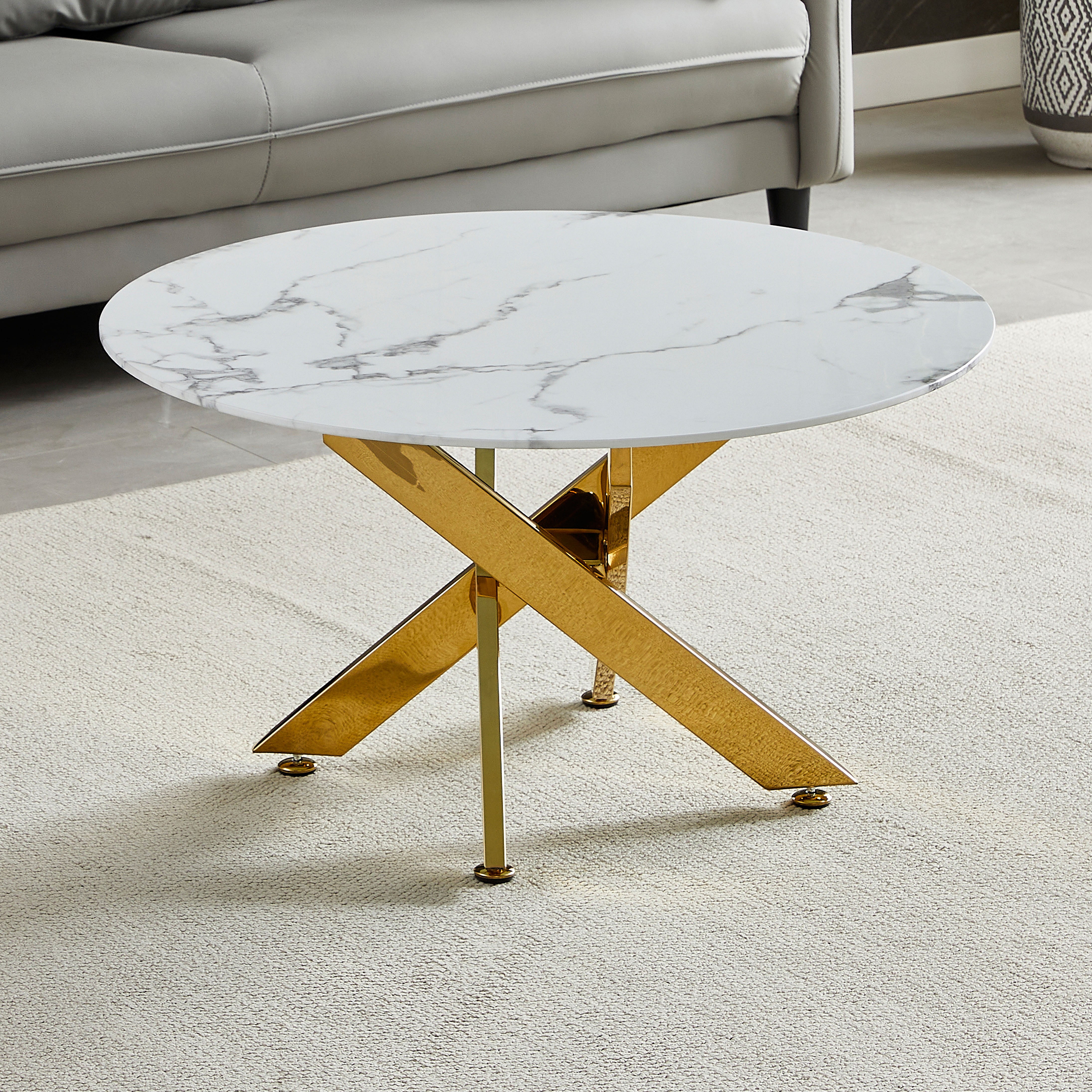 Salontafel rond - Gehard glas wit marmer - Goudkleurig metaal