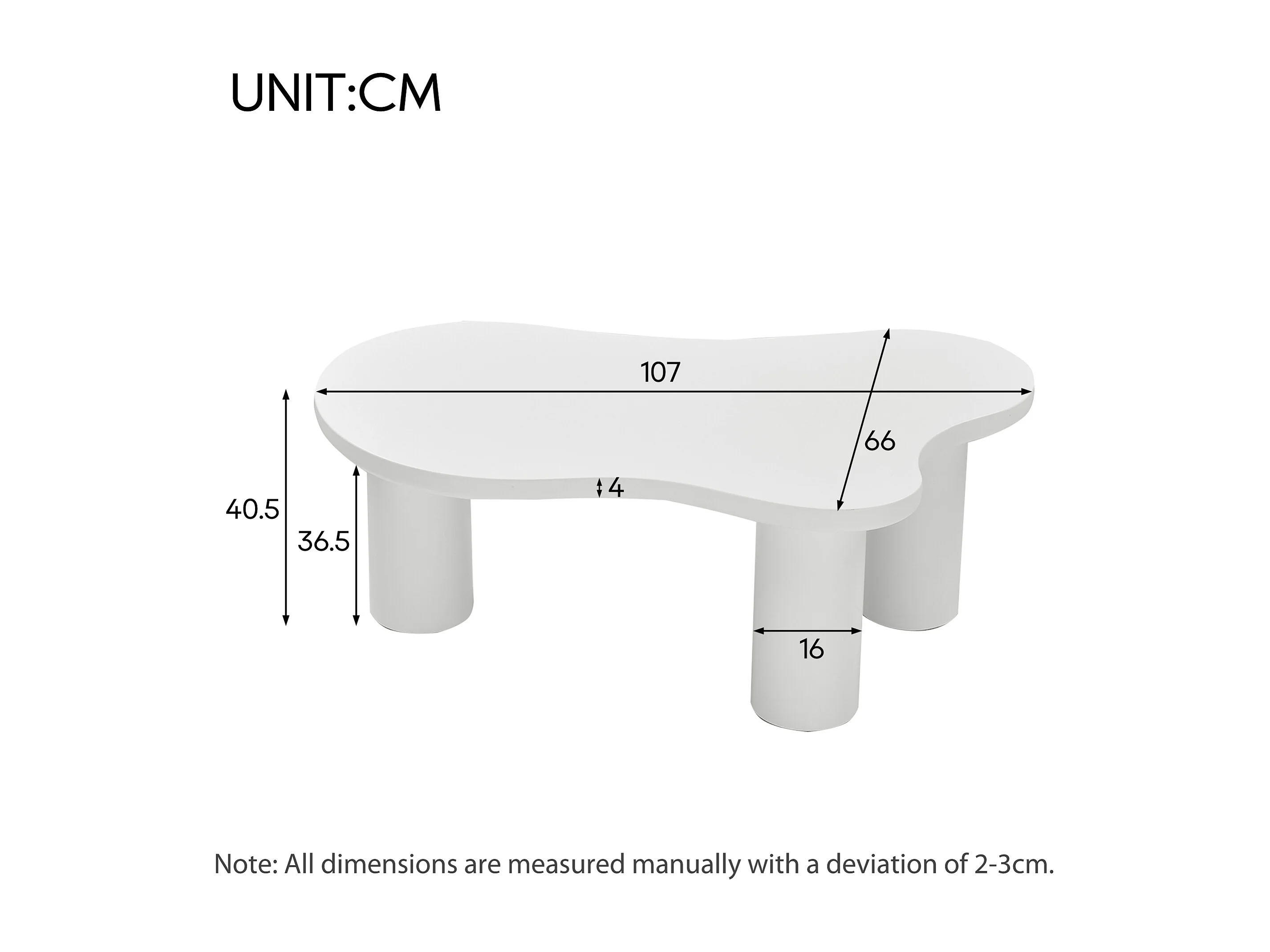 Salontafel 107x66x40.5cm wolkenvorm, MDF blad gelakt, PVC poten met vilt, wit