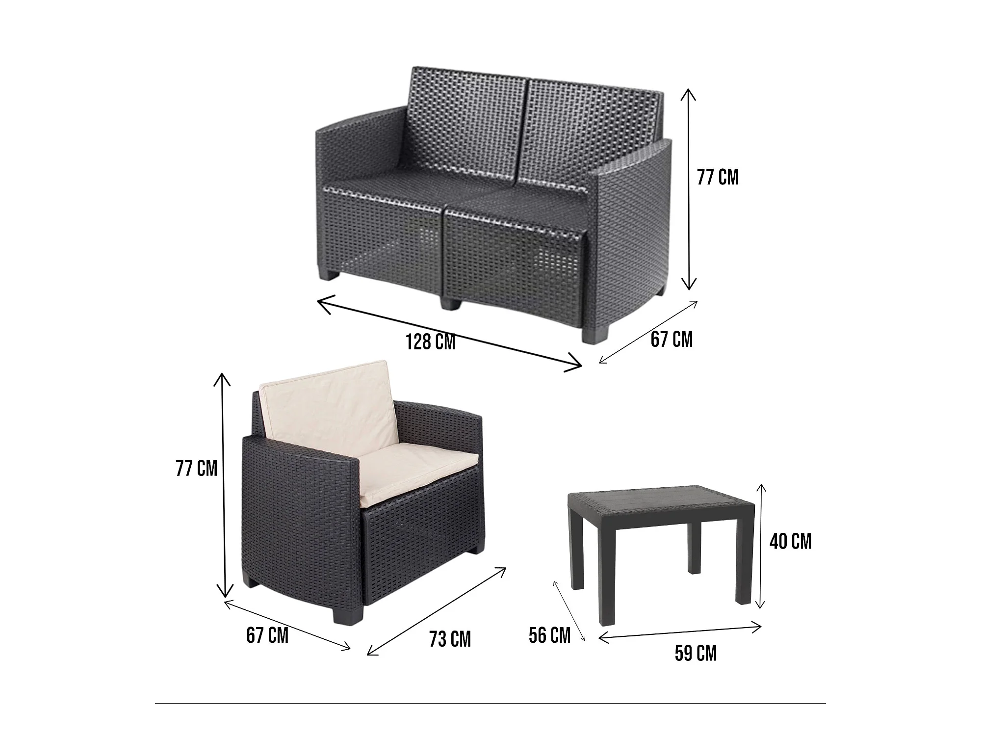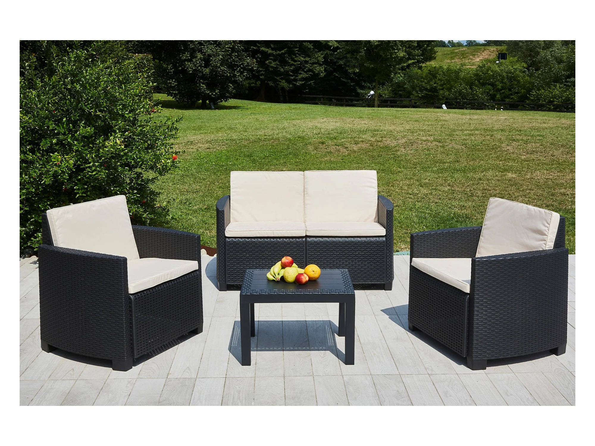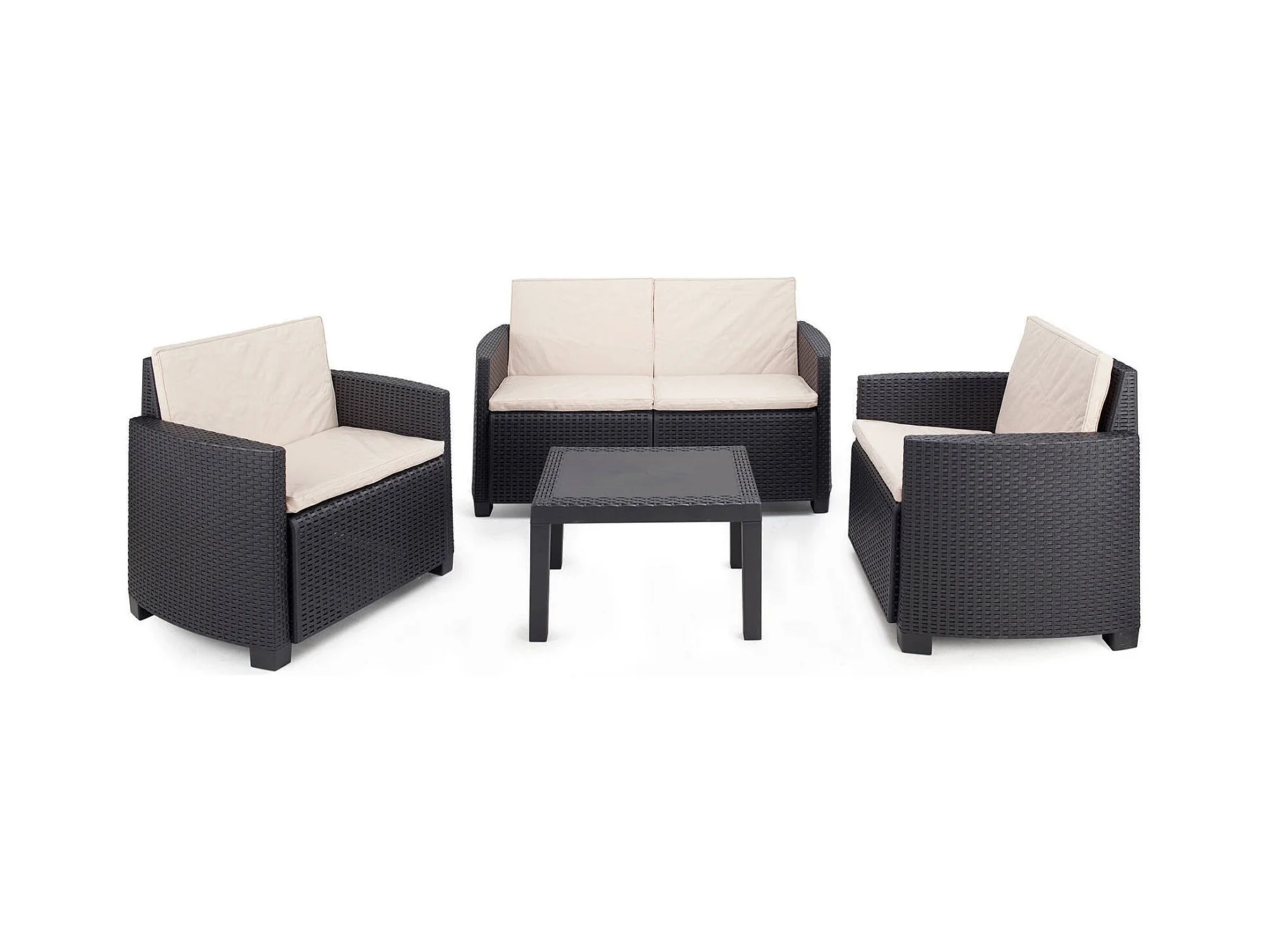 Sassari buitenloungeset, Tuinset met 2 fauteuils, 1 bank en 1 salontafel, Rotan effect lounge met kussens, 100% Made in Italy, Antraciet