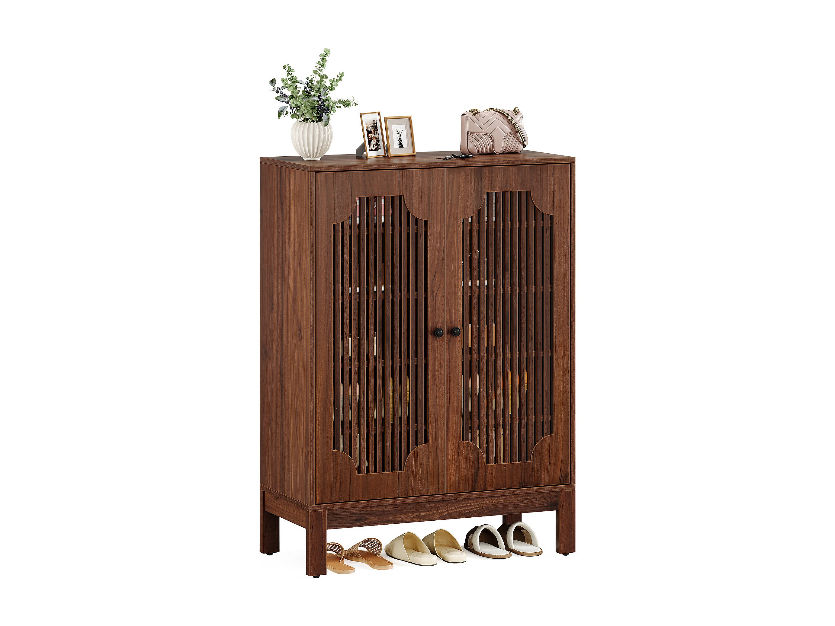 Schoenenkast voor de hal met 2 klapladen, smalle houten schoenenkast met gecanneleerd paneel