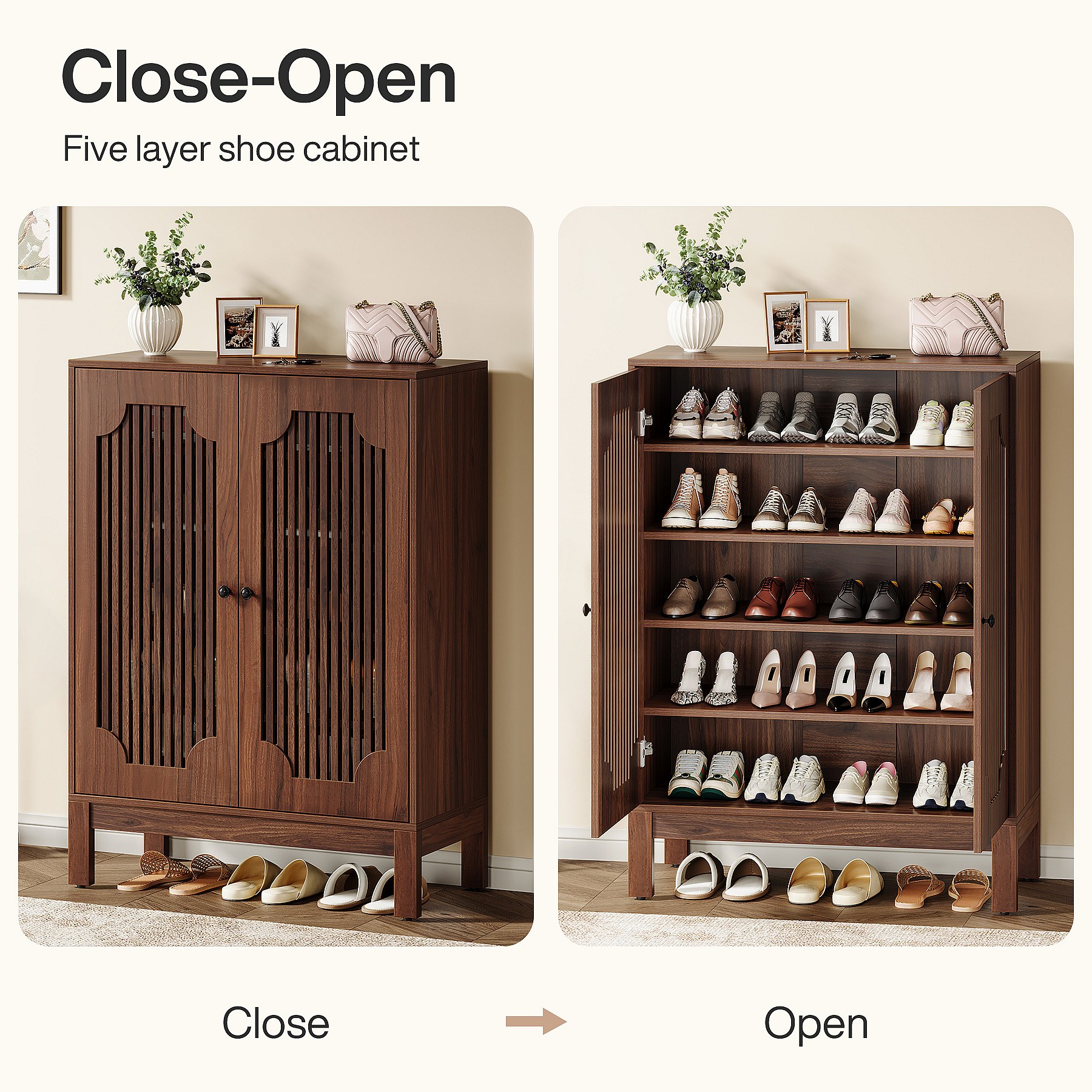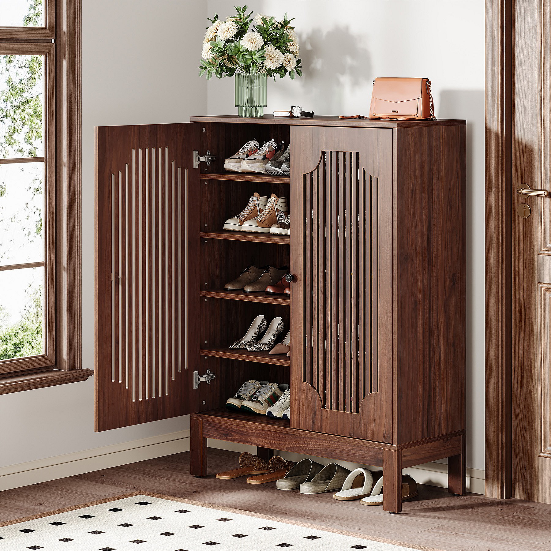Schoenenkast met lamellendeuren, schoenenkast met 5 niveaus en verstelbare planken, schoenenrek voor 20 paar