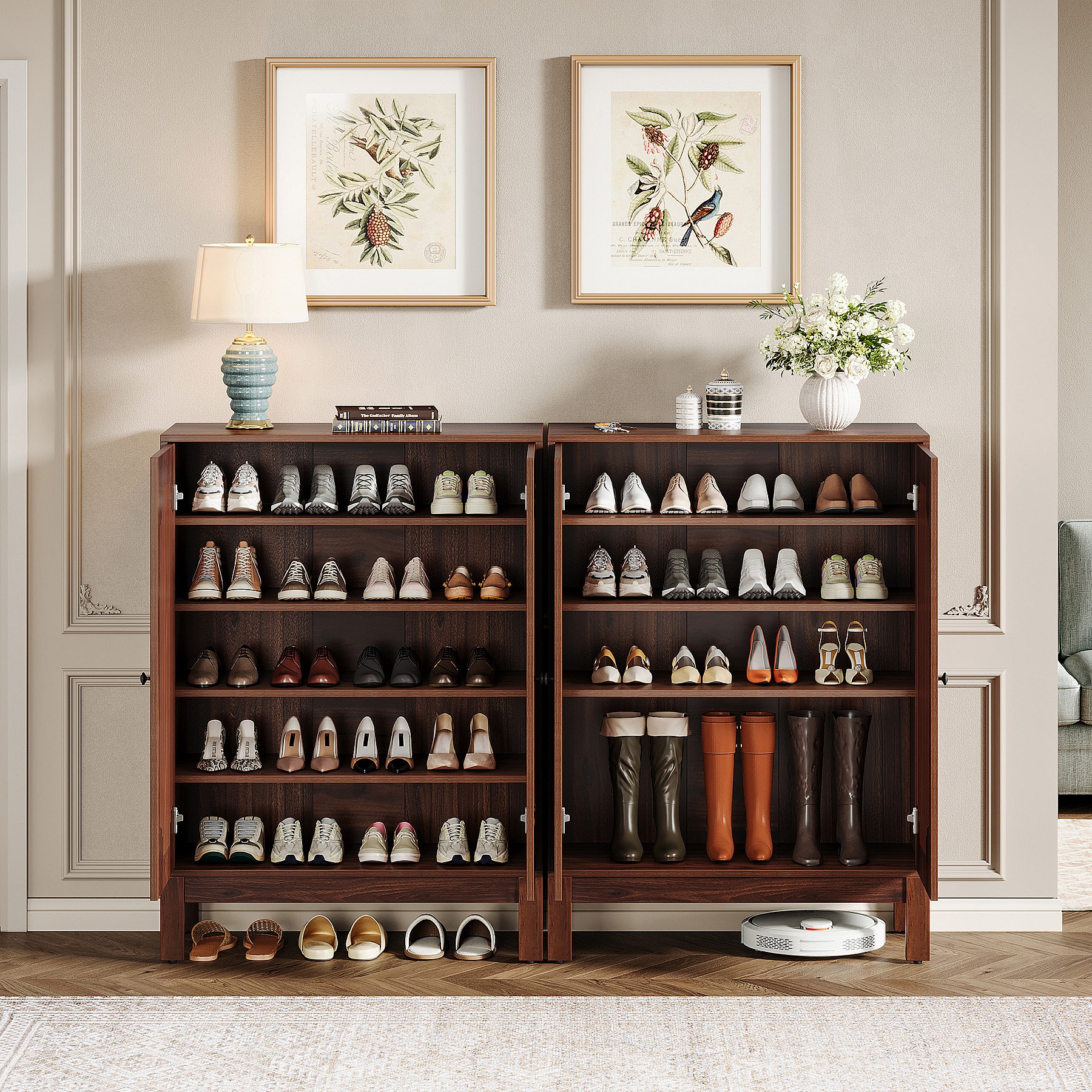 Schoenenkast, 25 paar schoenenkasten met deuren, wit en bruin