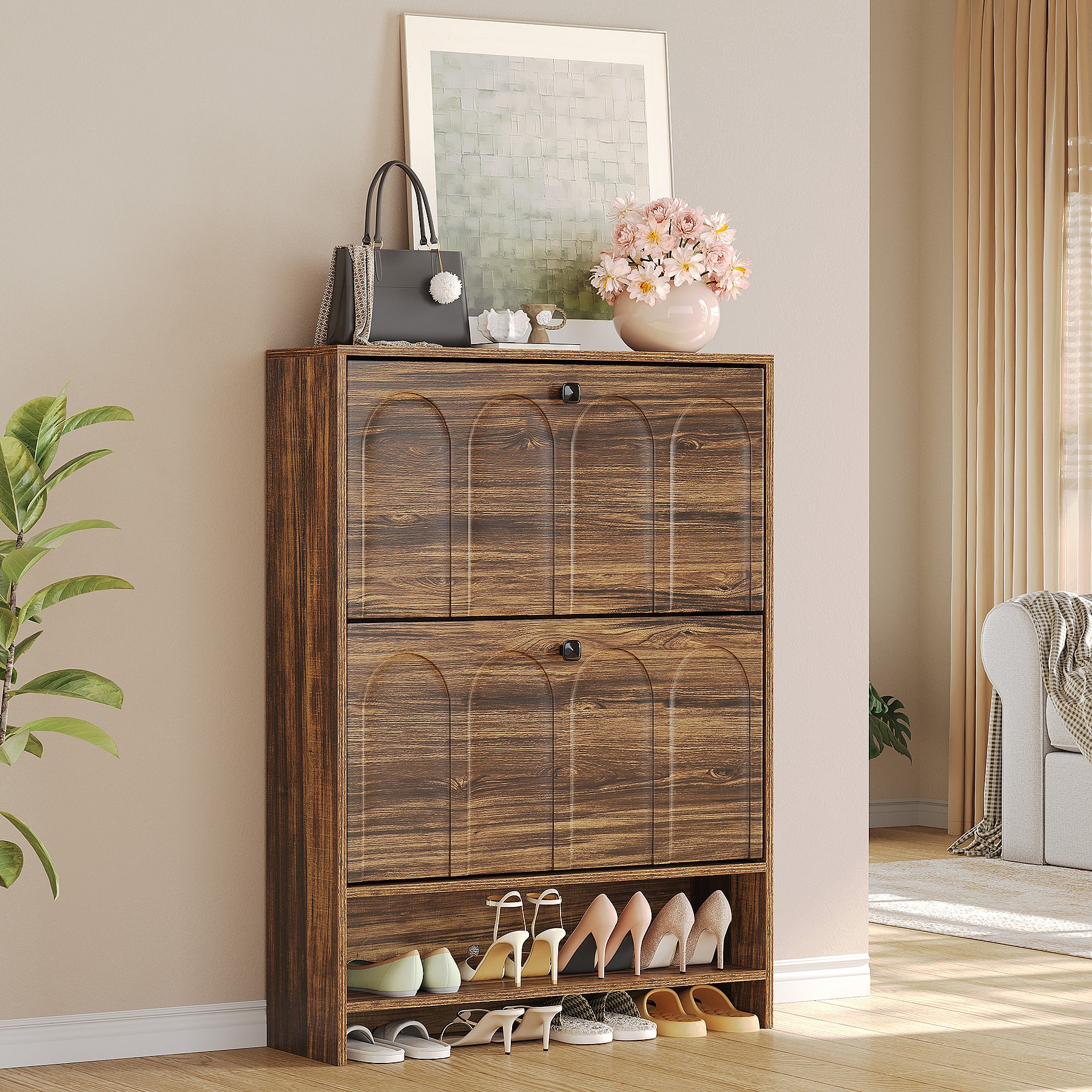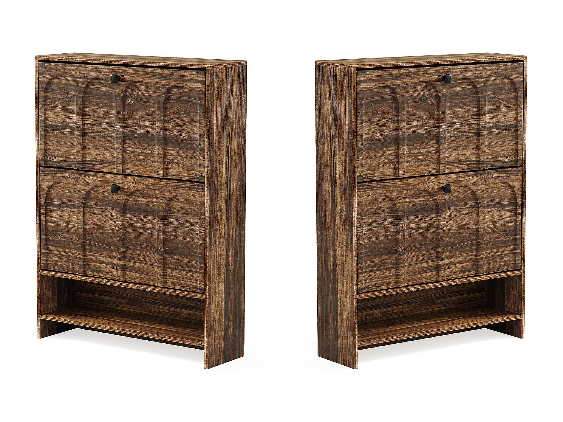 Schoenenkast voor de hal met 2 klapladen, smalle houten schoenenkast met gecanneleerd paneel