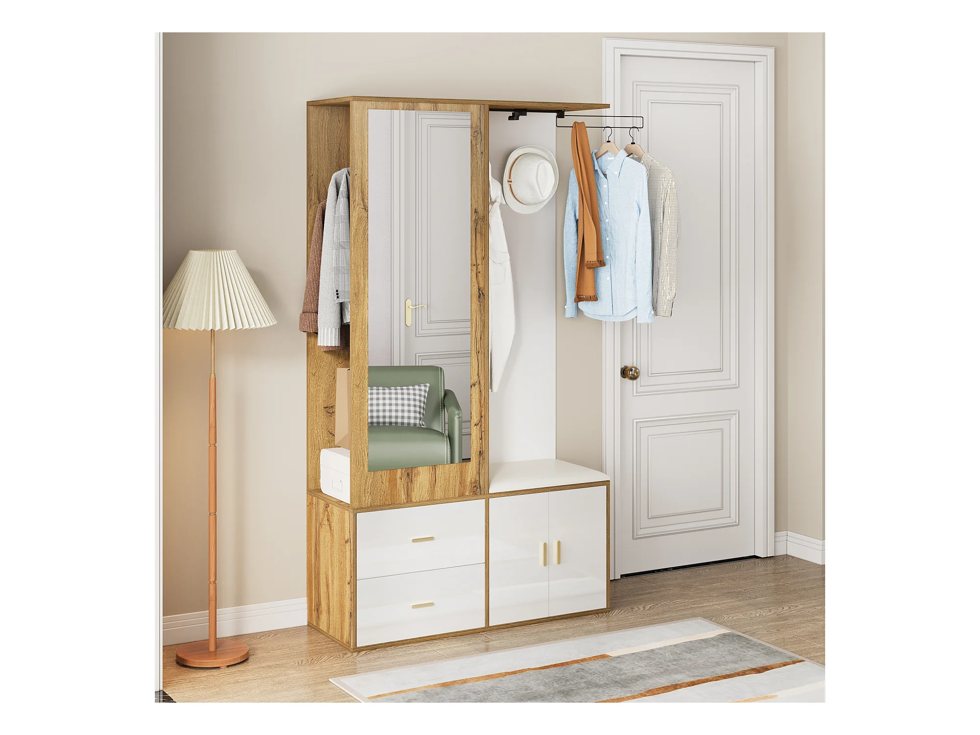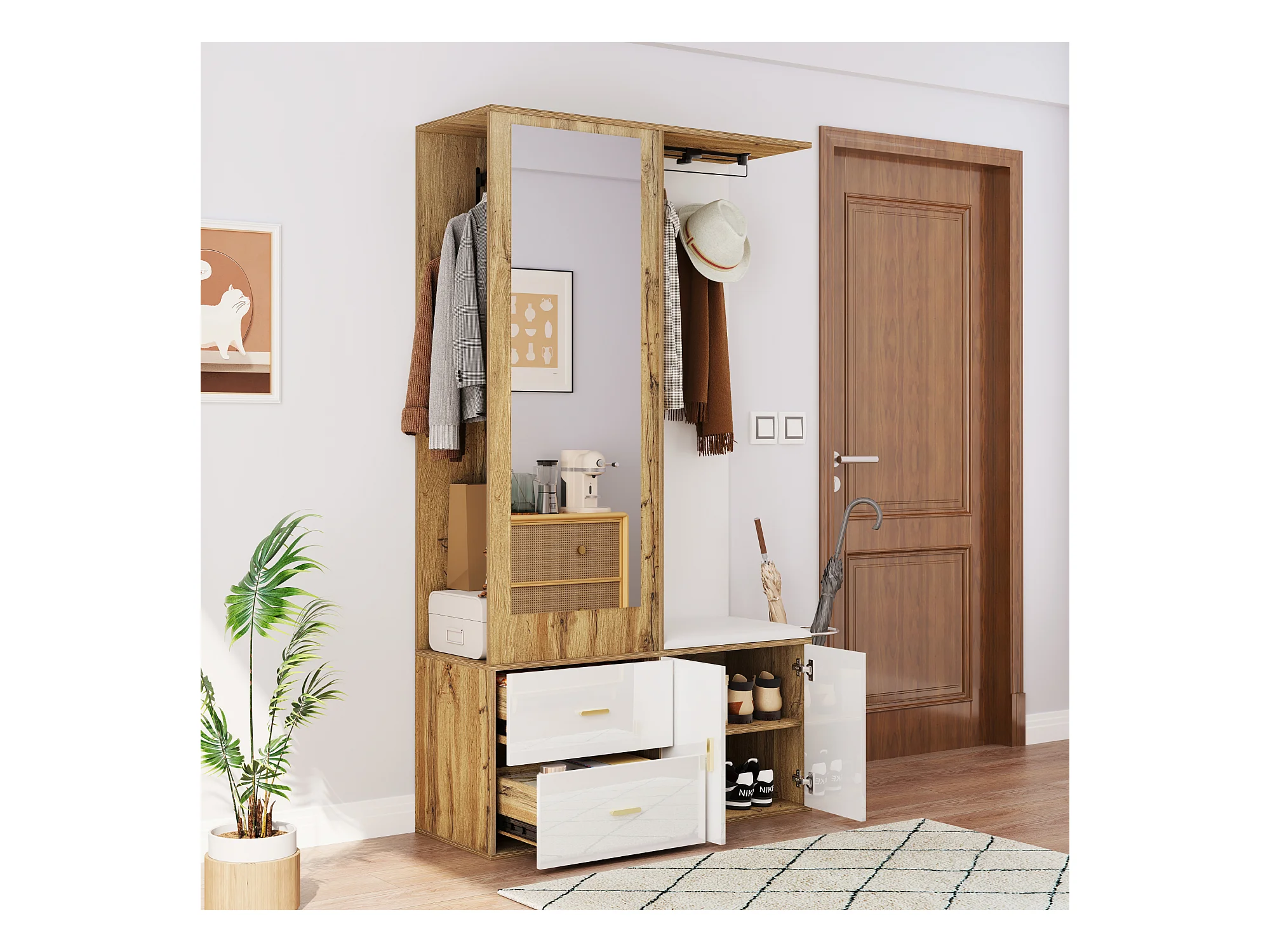 Schoenenrek + bank + kledingkast met spiegel - 2 deuren en 2 lades - 100x38x180cm - Spaanplaat - Wit en naturel
