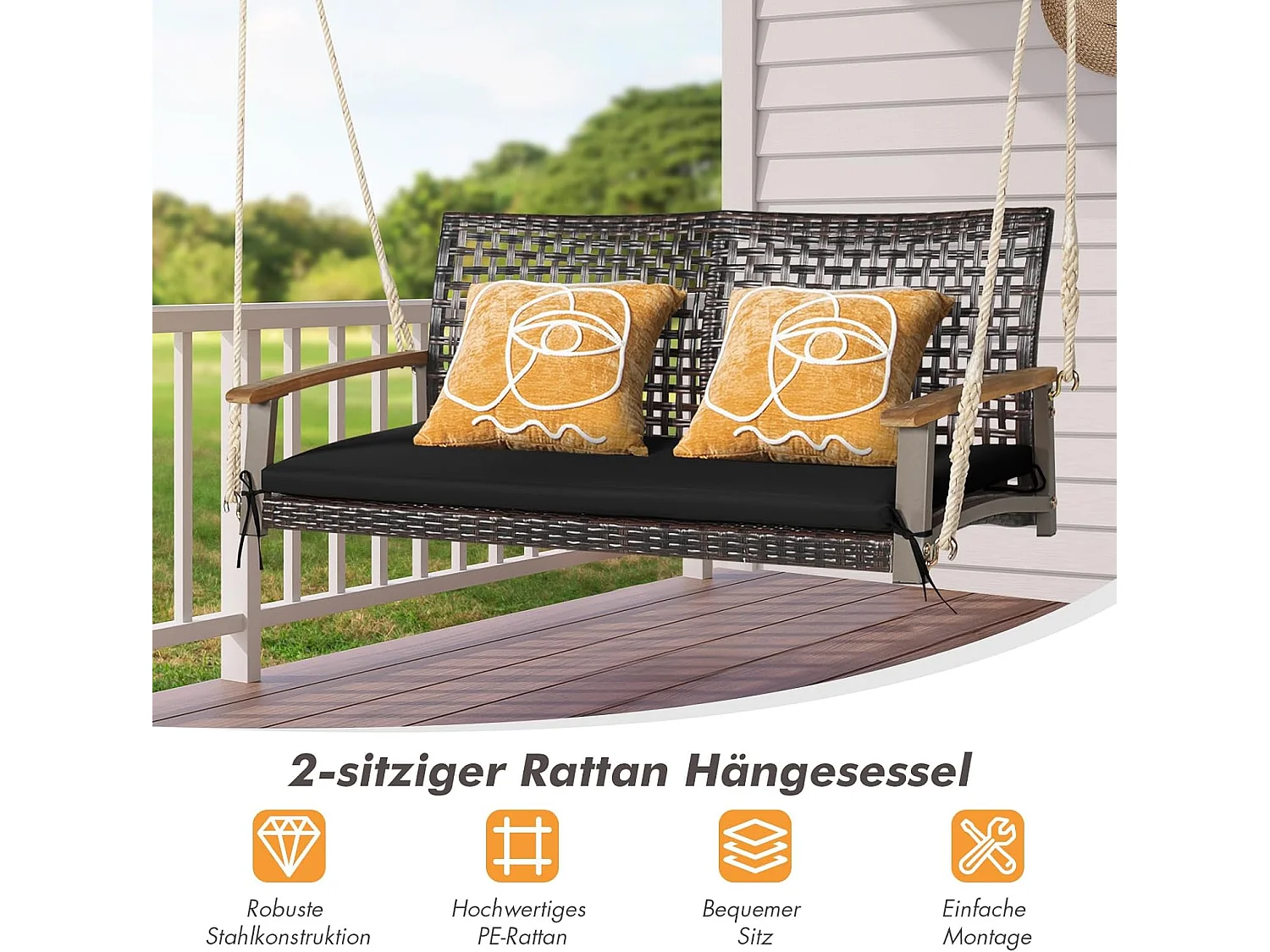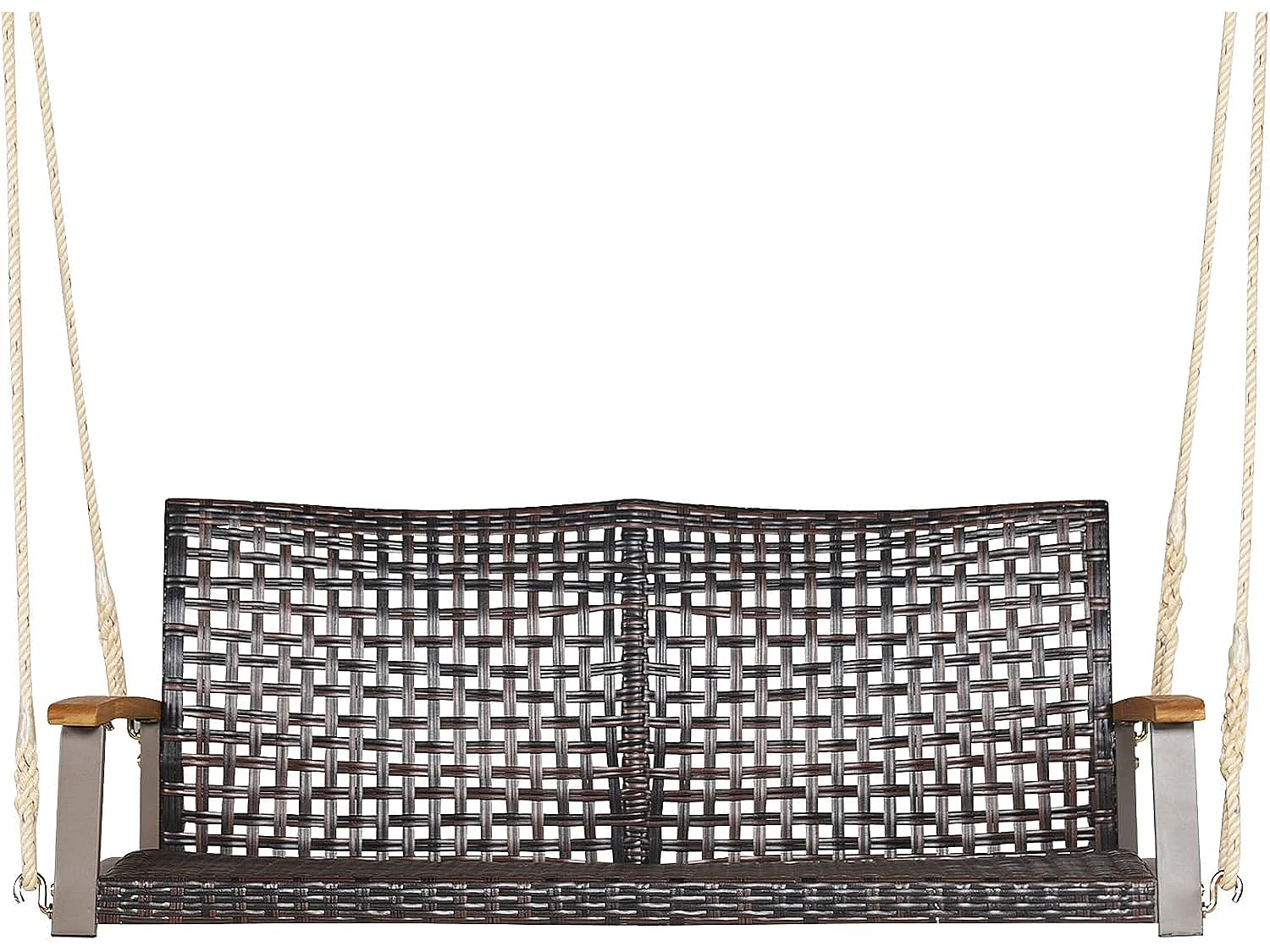 Schommelbank, 2-zits, PE-rotan, tuinschommel om op te hangen, schommelbank met armleuningen van acaciahout, 360 kg belastbaarheid,tuin en balkon