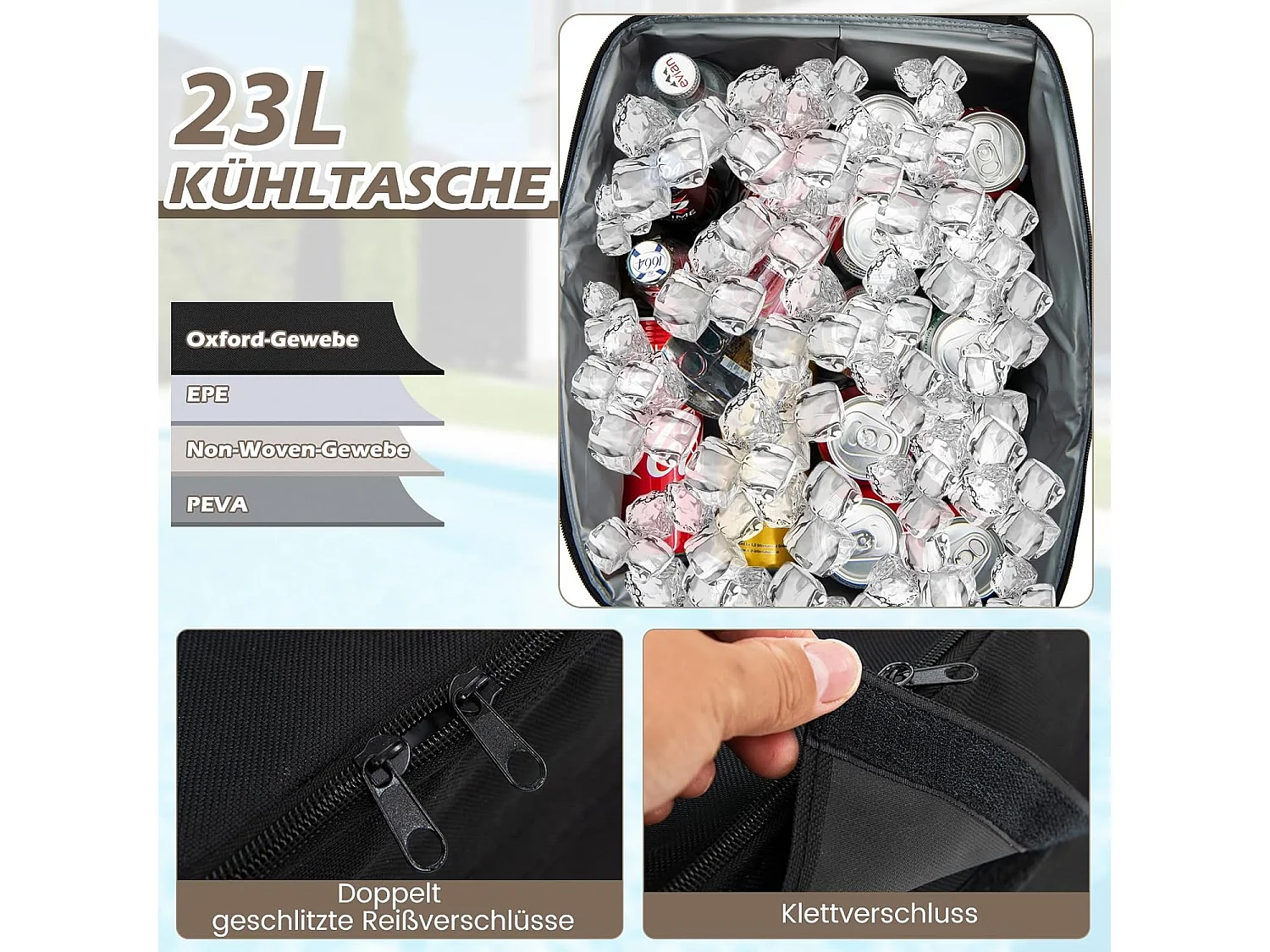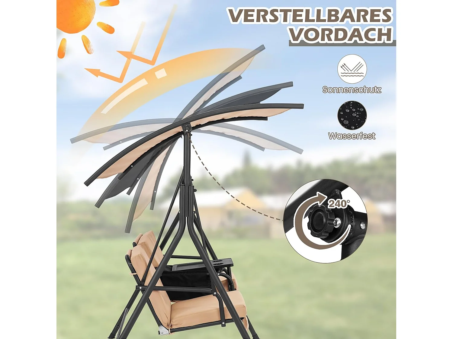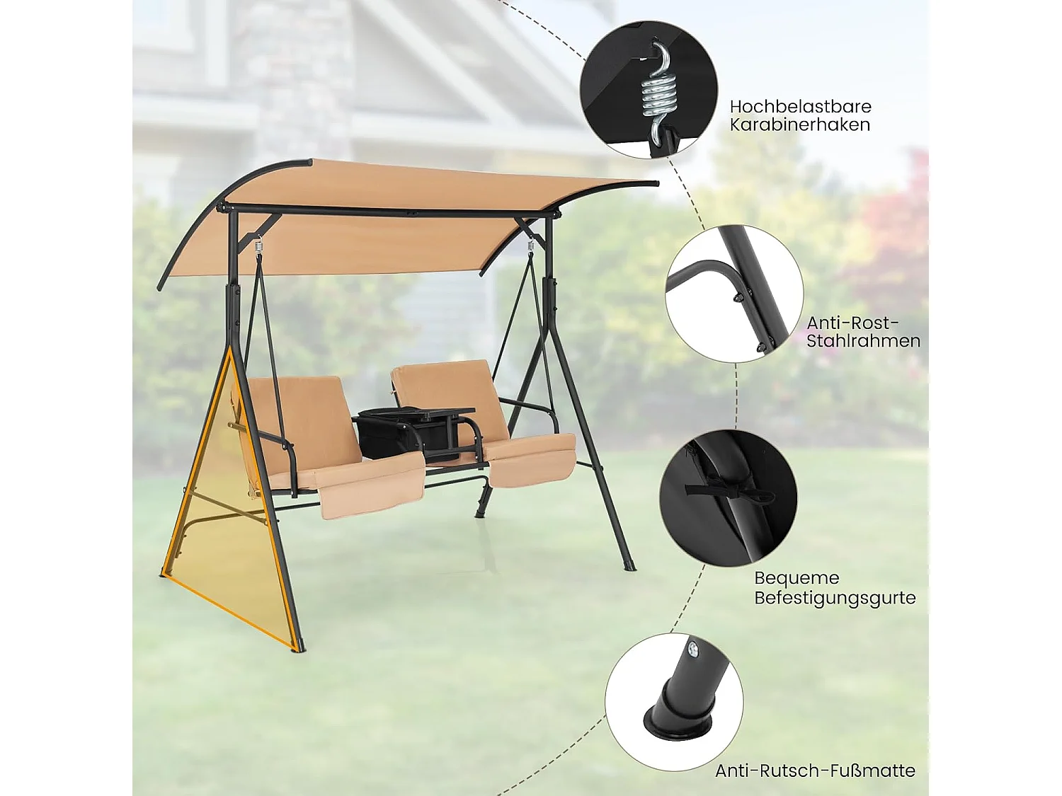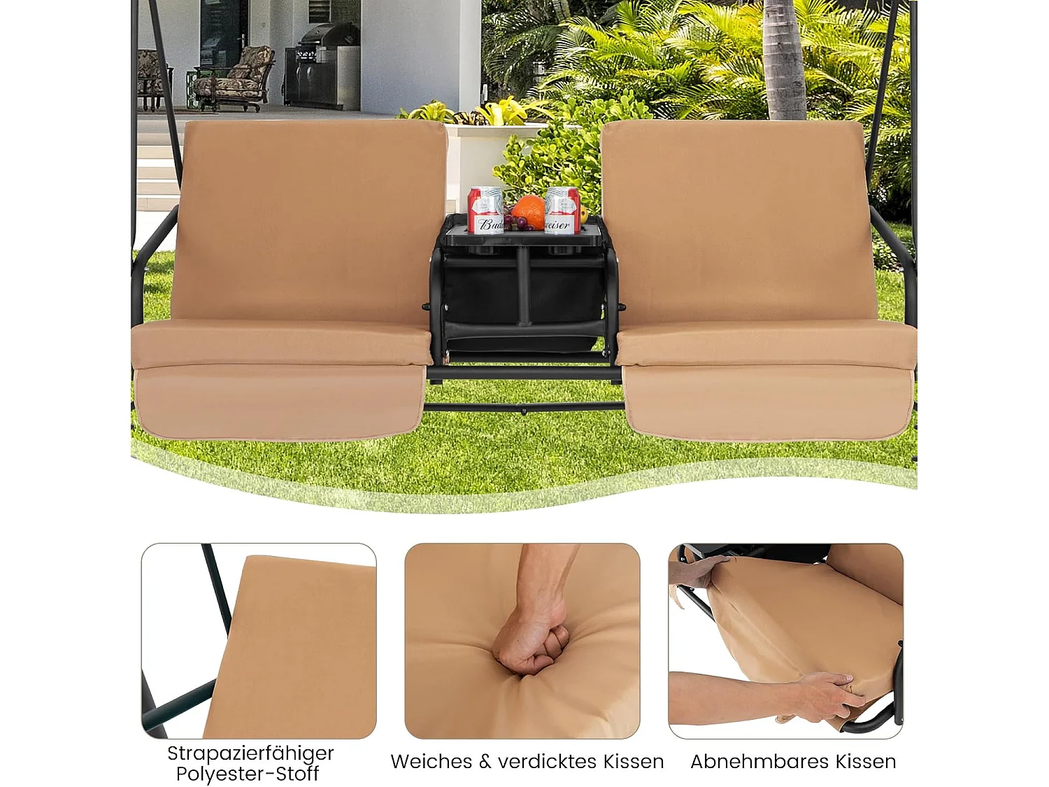 Schommelbank met koeltas, draaibaar dienblad en afneembaar kussen, 2-zits tuinschommel, schommelbank voor tuin, terras en achtertuin (bruin) ZB32615