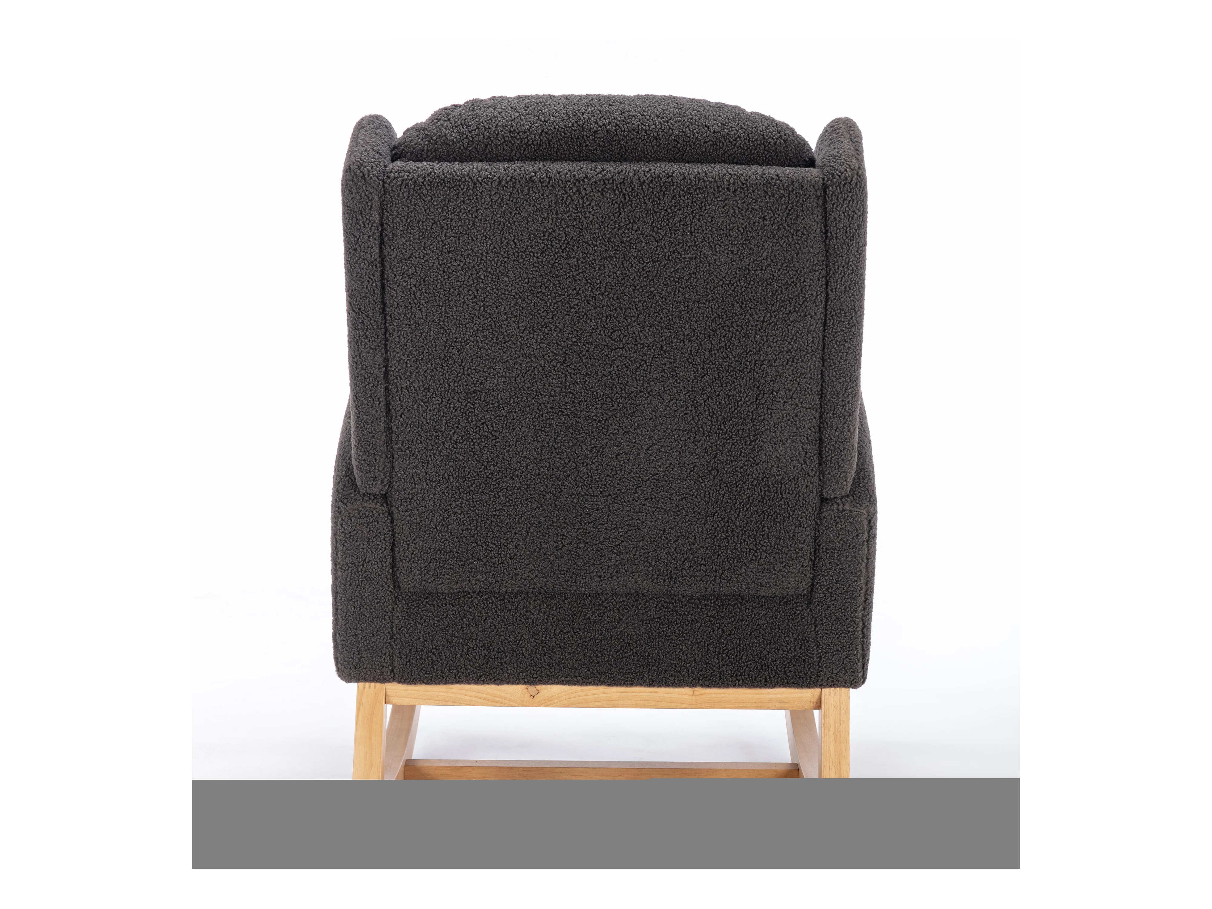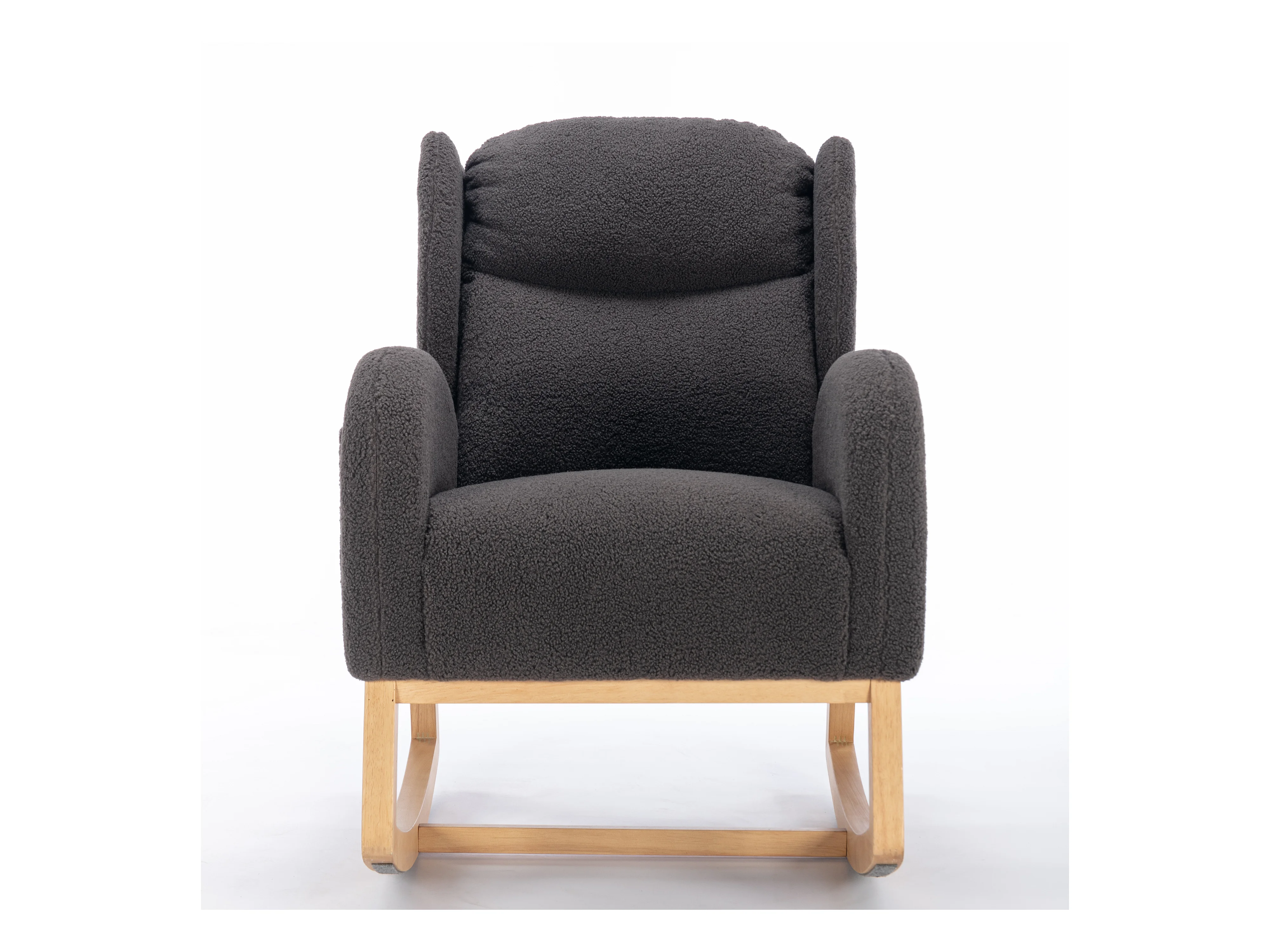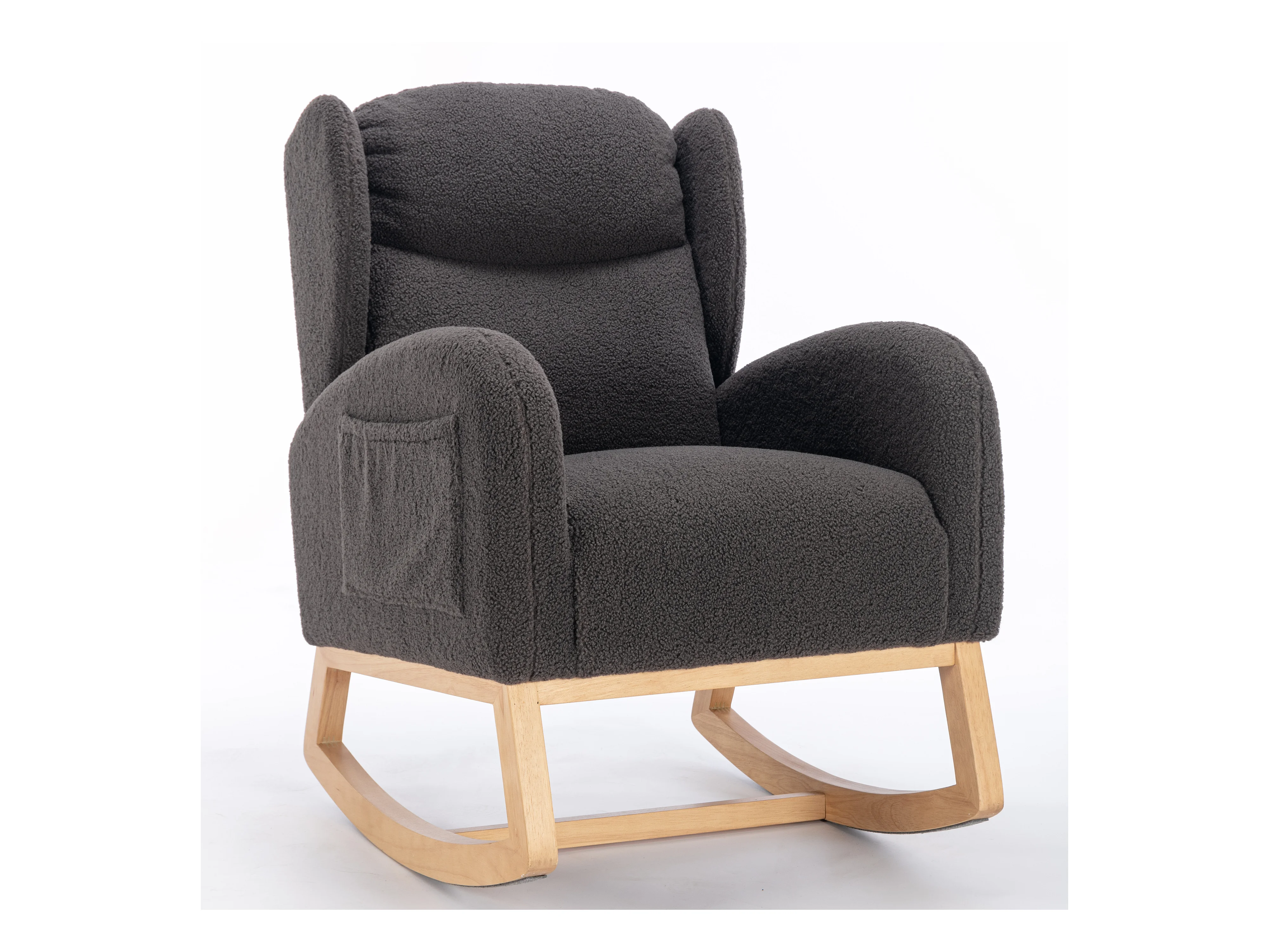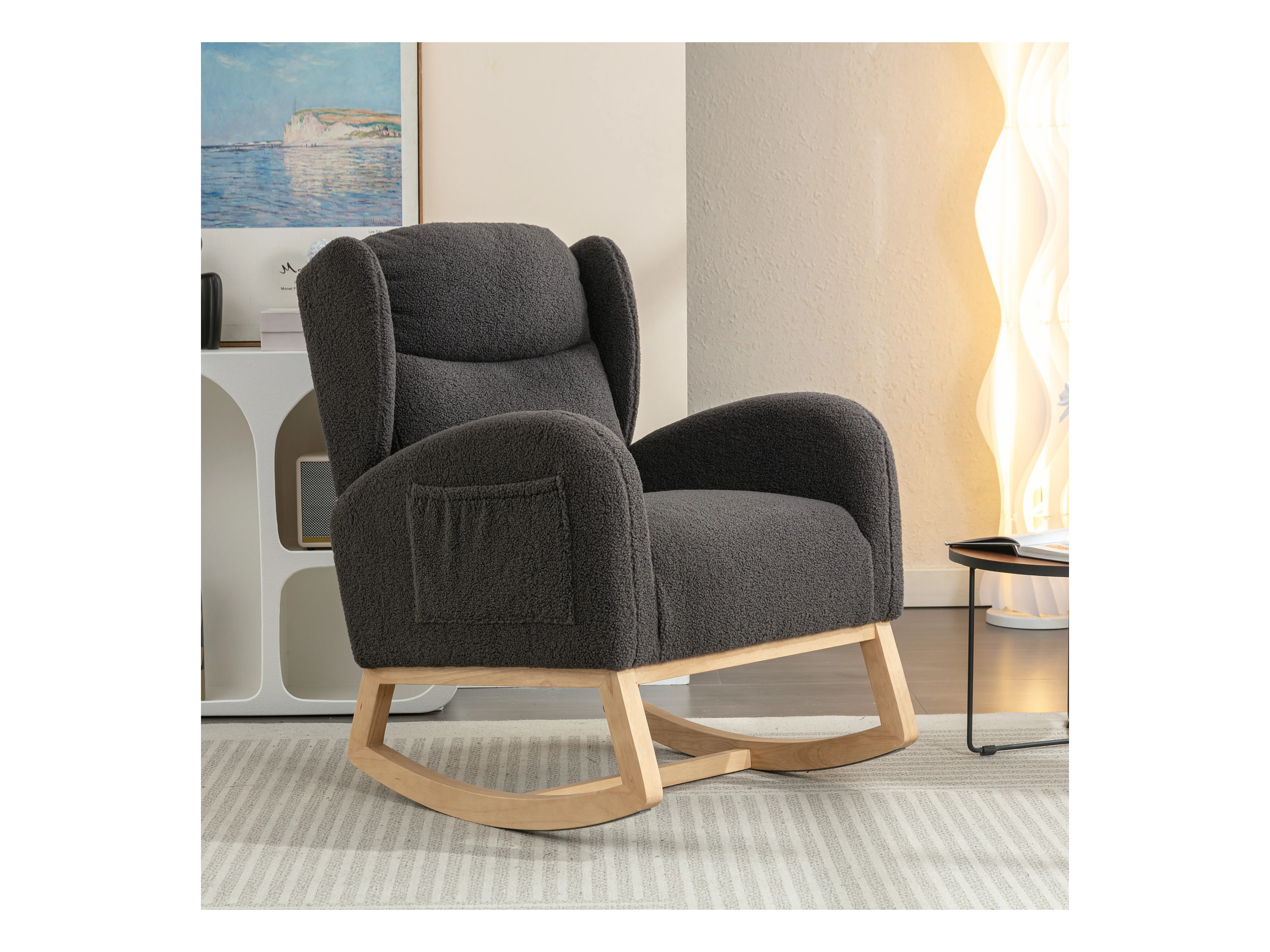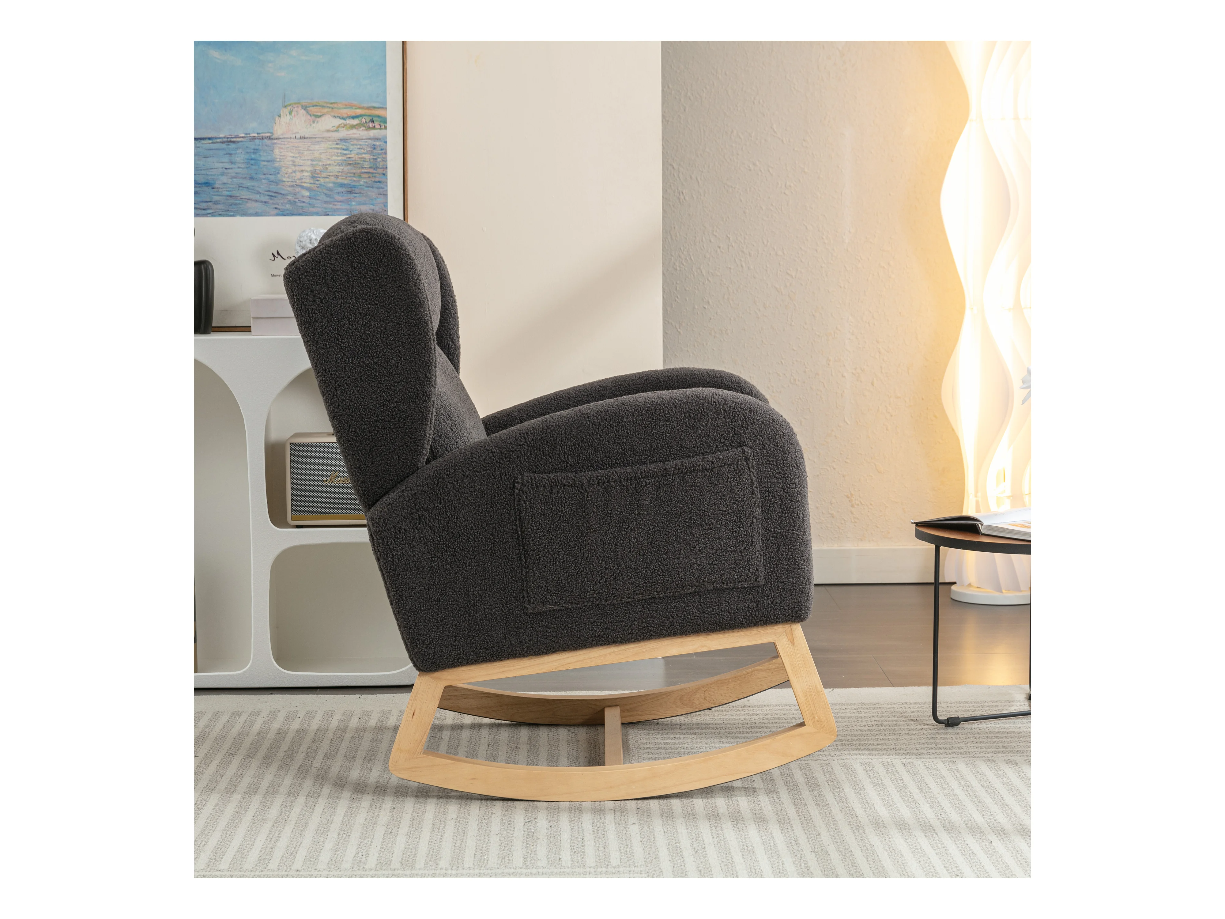 Schommelstoel in donkergrijze Teddy-stof met zijvakken, houten frame, 96,5 x 71 x 101 cm