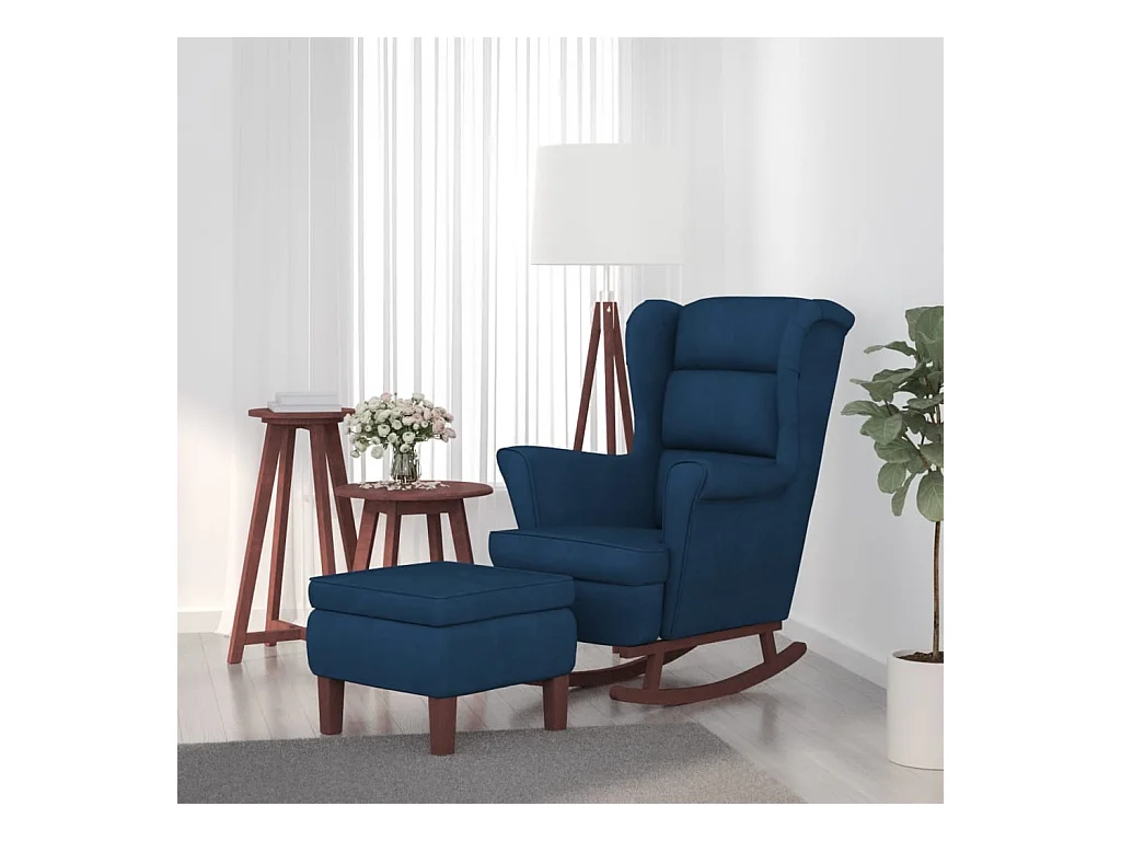 Schommelstoel met houten poten en voetenbank fluweel blauw